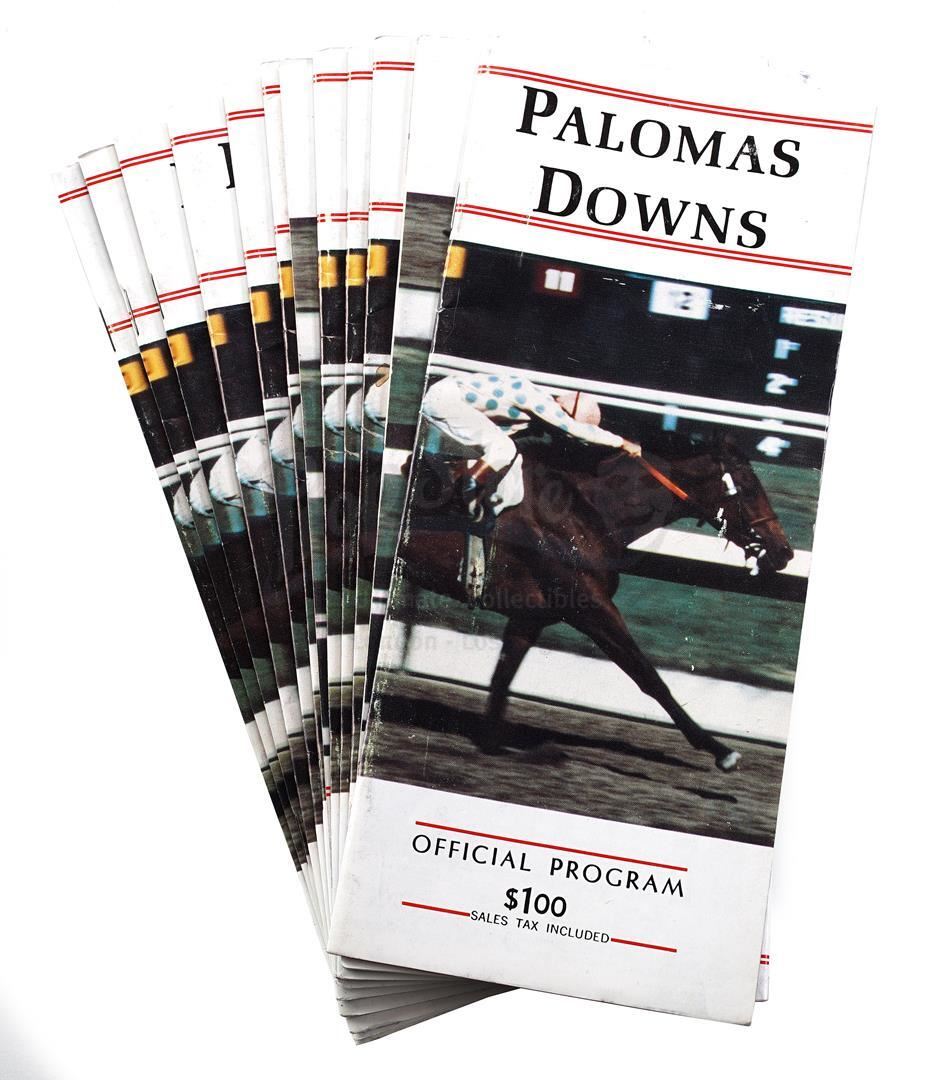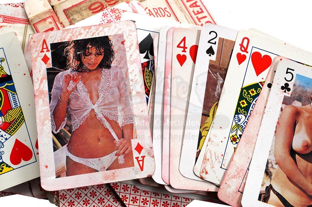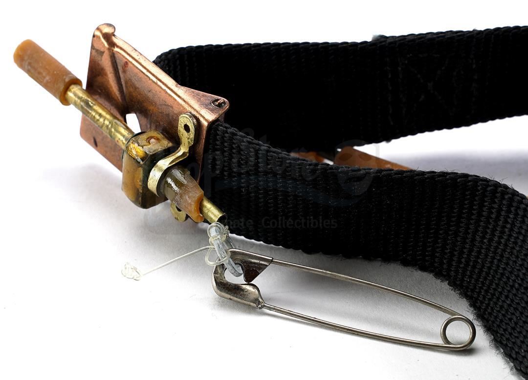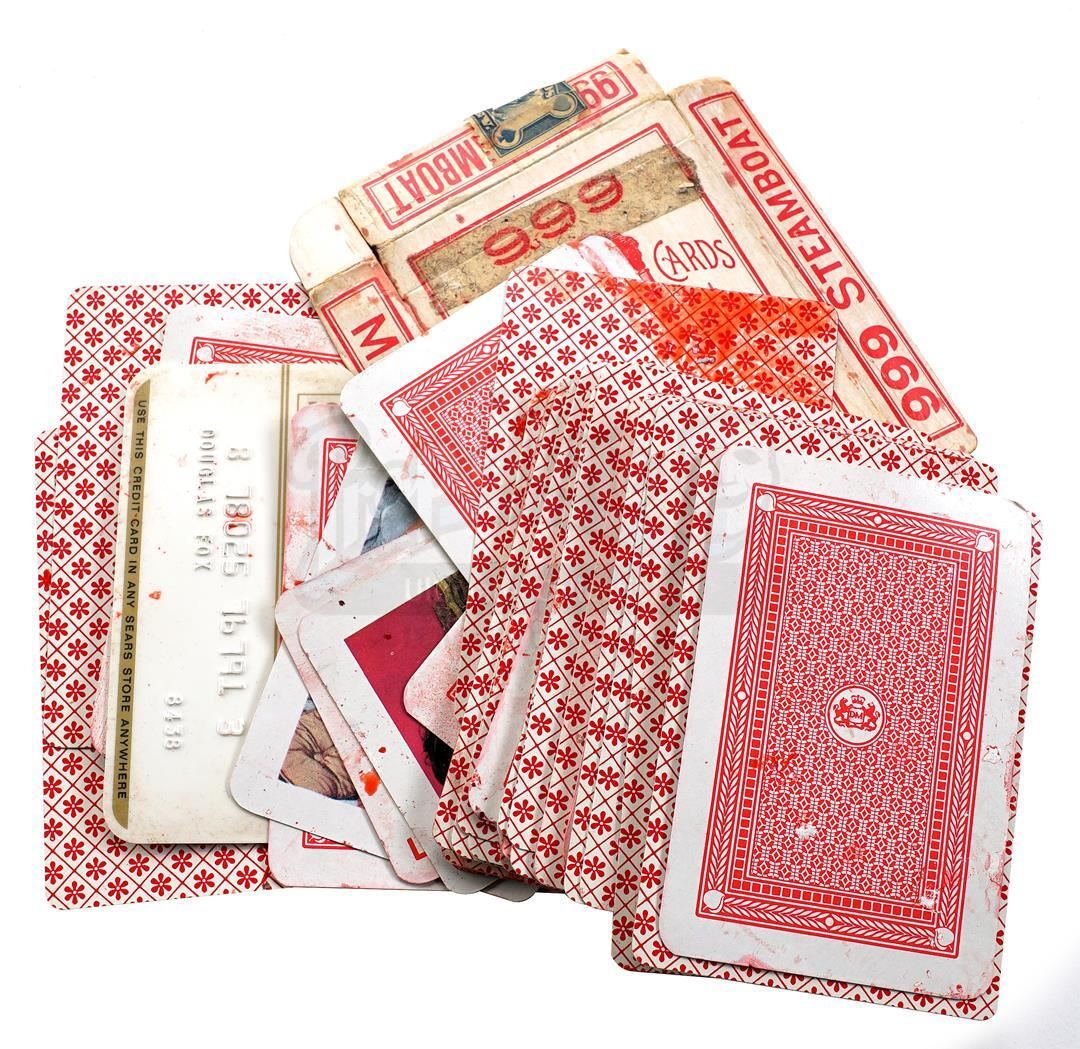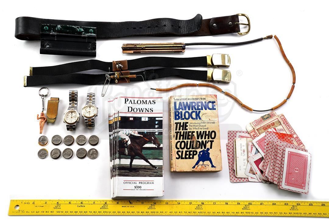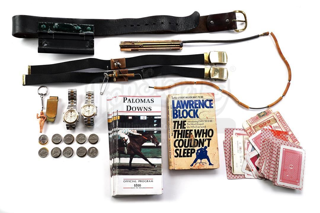 This lot will be auctioned on Wednesday, June 30th. The auction will begin at 9:00am PDT and lots are sold sequentially via live auctioneer; tune in to the live streaming broadcast on auction day to follow the pace. Note other lots in the auction may close on June 29th or July 1st. Roy Dillon's (John Cusack) con artist accessories from Stephen Frears neo-noir crime drama The Grifters. This set of Dillon's "small con" gags consists of a pack of blood-stained vintage playing cards; a white plastic credit card; a metal keychain with a plastic woman figure; 12 fold-out race track programs; a paperback novel; two metal wristwatches with gold trim; nine quarters and nickels affixed to each other in various combinations; a black leather belt with a metal, spring-loaded compartment; and two nylon belts with a metal apparatus and a safety pin. This lot exhibits intentional aging and staining from production, but remains in good overall condition. Dimensions (largest): 25" x 3" x 0.5" (63.5 cm x 7.75 cm x 1.5 cm); (smallest): 0.5" x 0.5" x 0.5" (1.5 cm x 1.5 cm x 1.5 cm) Estimate: $1,000 - 1,500