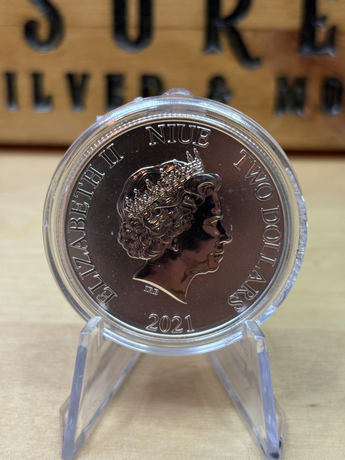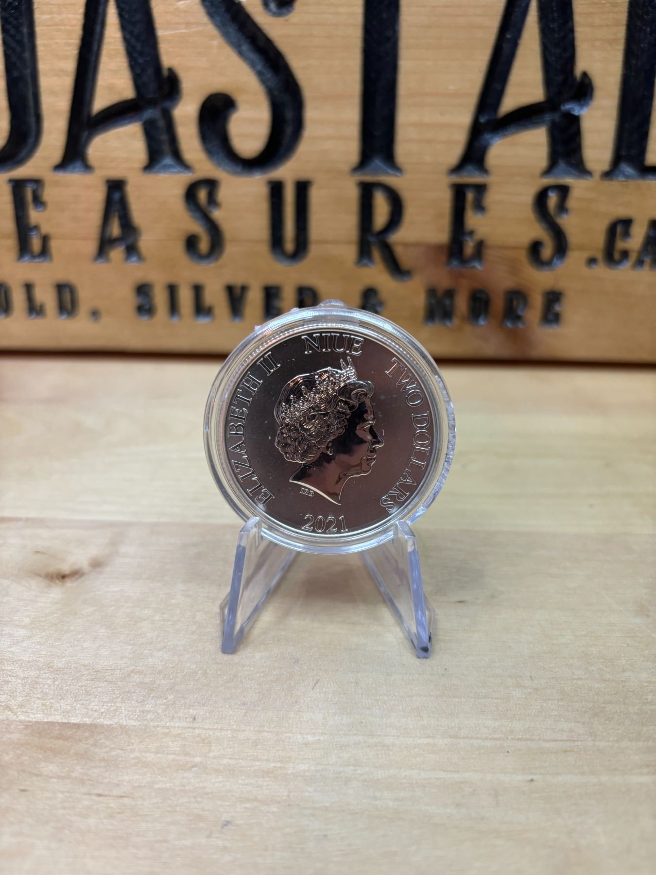 The 1 oz Star Wars Millennium Falcon Silver Coin is a .999 fine silver coin weighing 1 ounce (31.1 grams). Produced by the New Zealand Mint, this coin features a detailed depiction of the iconic Millennium Falcon from the Star Wars universe, one of the most beloved spacecraft in science fiction. The design typically highlights the ship in flight, often with intricate engravings showcasing its distinctive features. This coin is part of a series of licensed Star Wars coins and is legal tender in Niue, with a face value of $2 NZD. It's highly sought after by both Star Wars fans and silver coin collectors due to its unique theme and silver content.