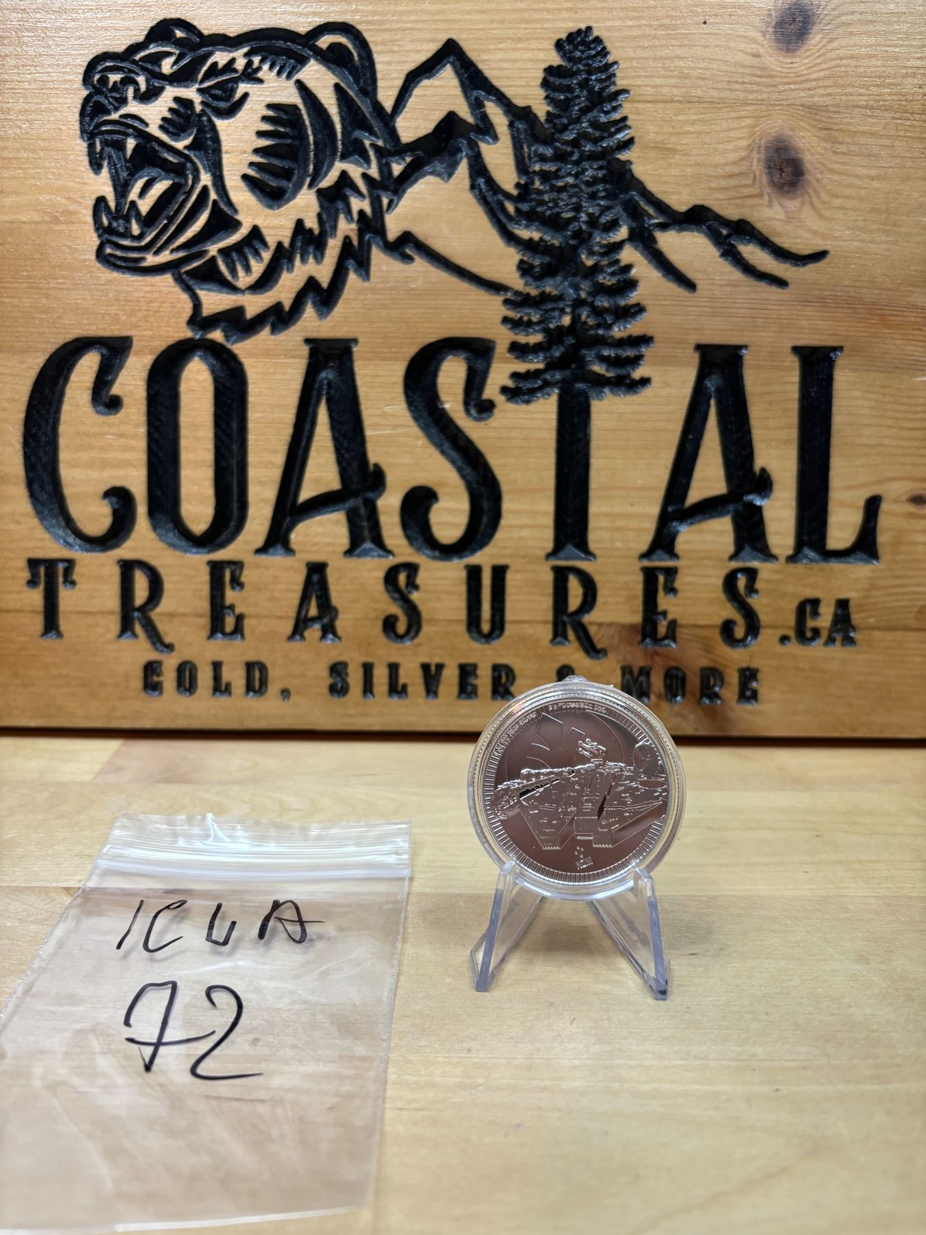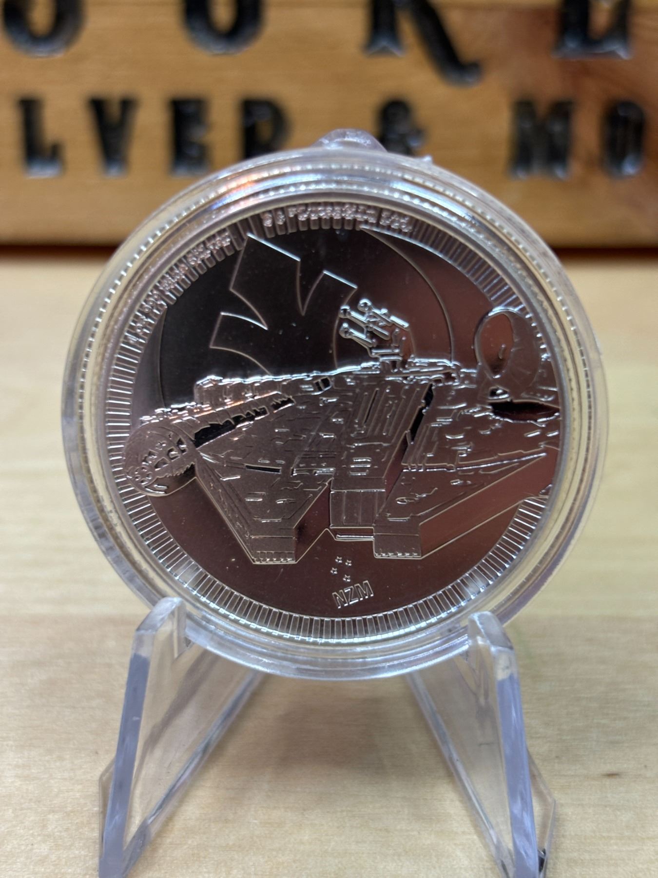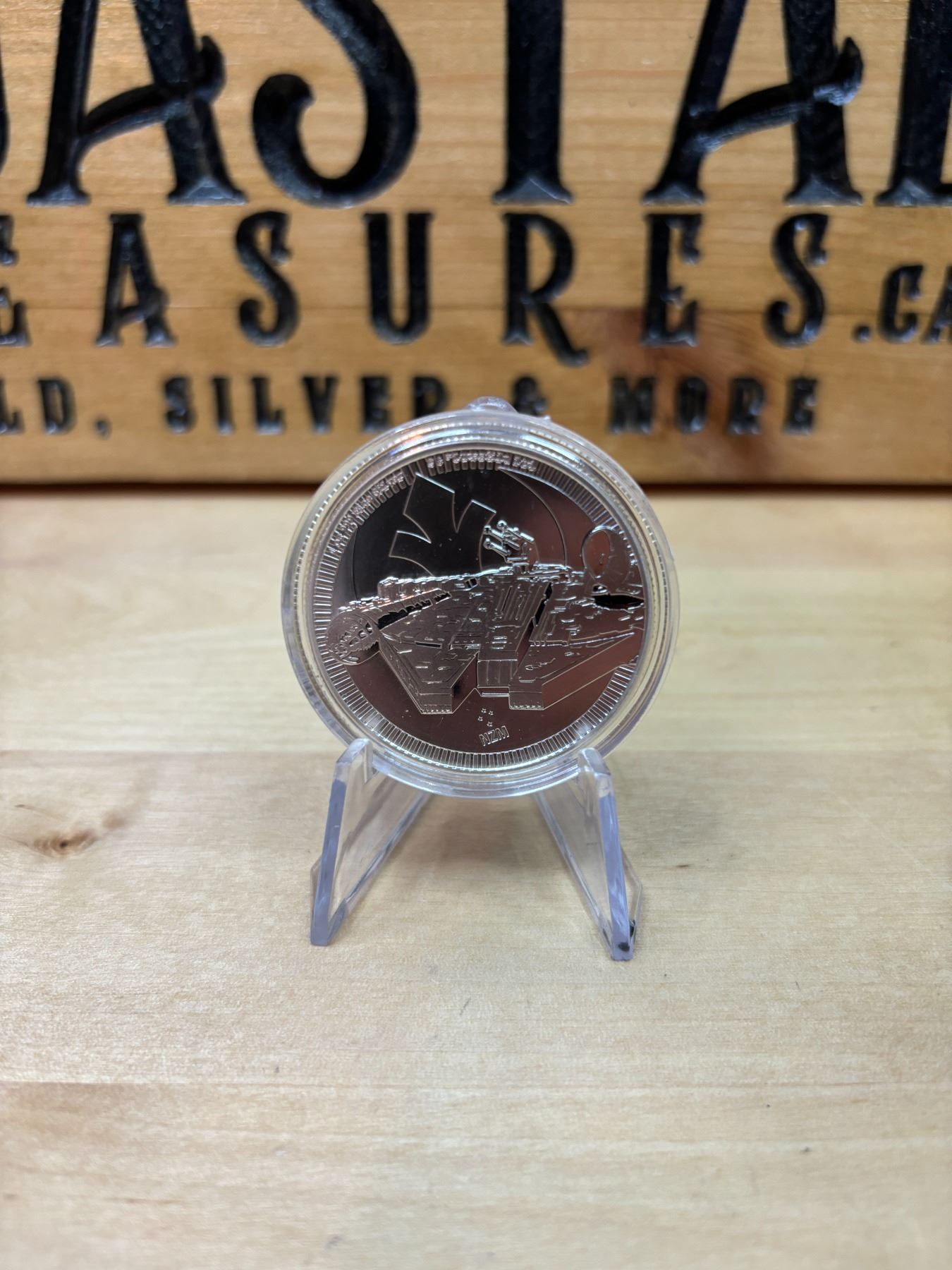 The 1 oz Star Wars Millennium Falcon Silver Coin is a .999 fine silver coin weighing 1 ounce (31.1 grams). Produced by the New Zealand Mint, this coin features a detailed depiction of the iconic Millennium Falcon from the Star Wars universe, one of the most beloved spacecraft in science fiction. The design typically highlights the ship in flight, often with intricate engravings showcasing its distinctive features. This coin is part of a series of licensed Star Wars coins and is legal tender in Niue, with a face value of $2 NZD. It's highly sought after by both Star Wars fans and silver coin collectors due to its unique theme and silver content.