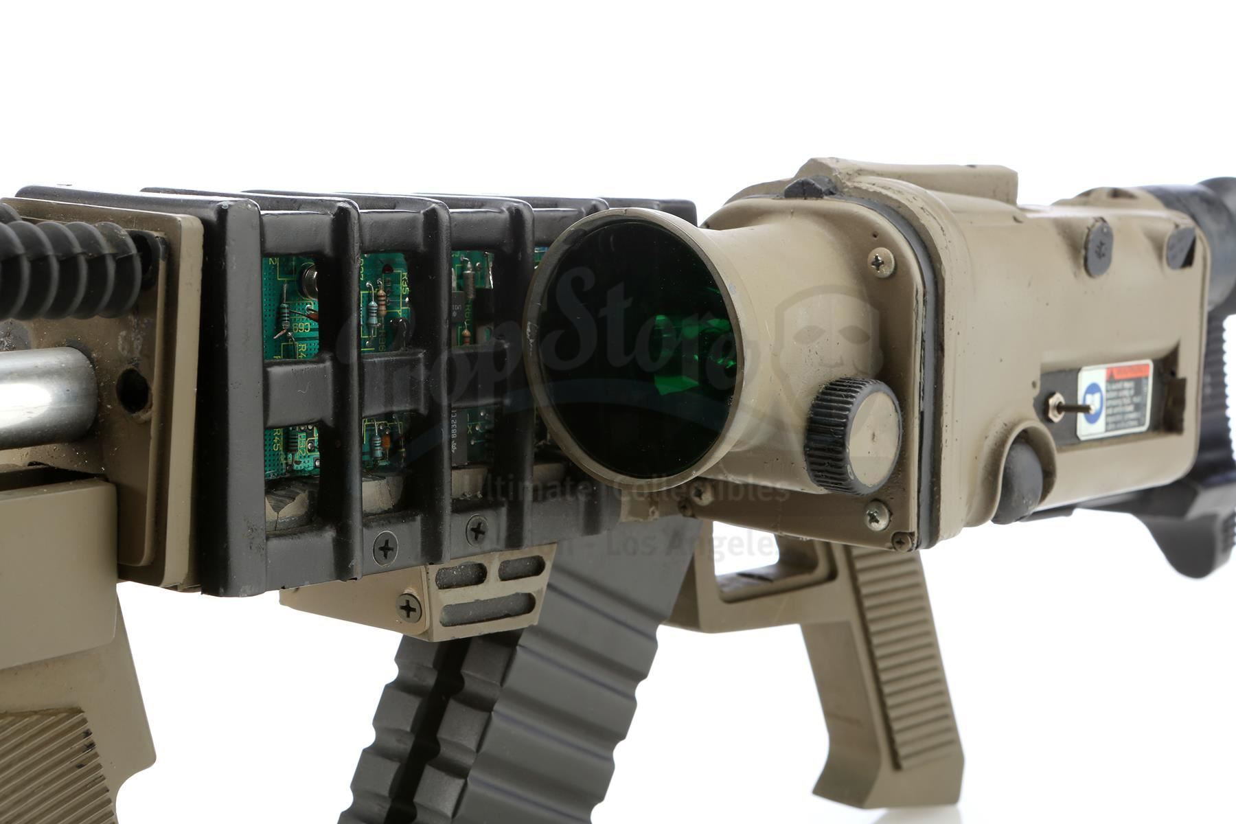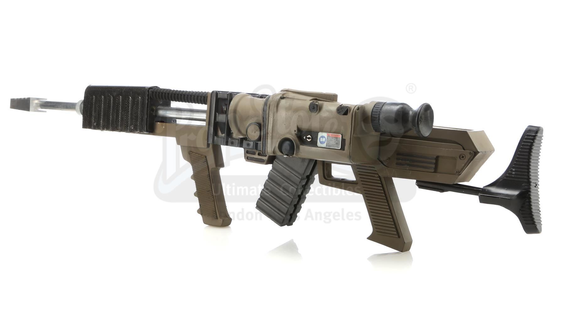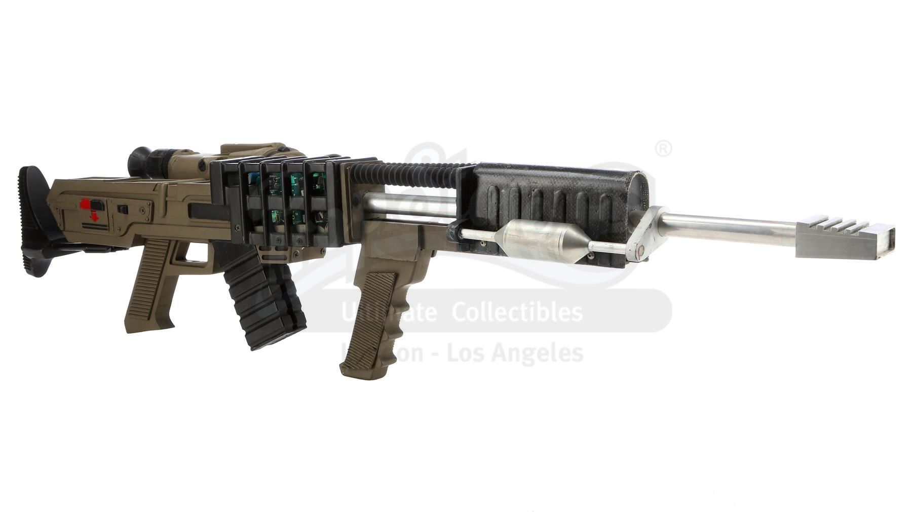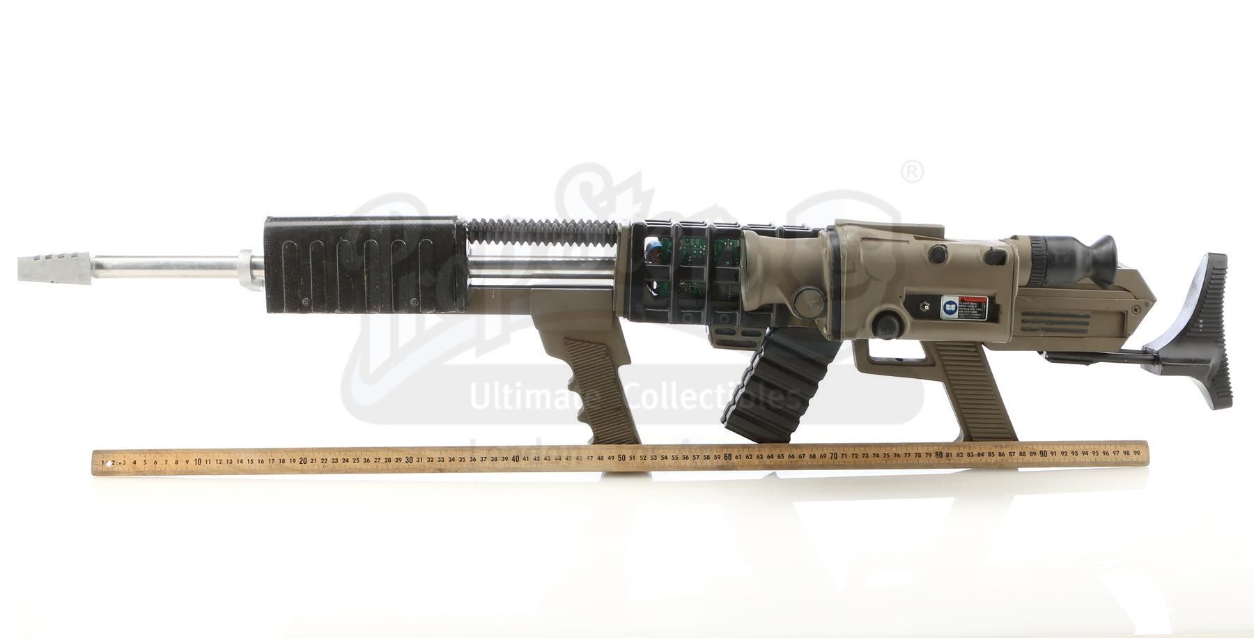 This lot will be auctioned on Tuesday, June 29th. The auction will begin at 9:00am PDT and lots are sold sequentially via live auctioneer; tune in to the live streaming broadcast on auction day to follow the pace. Note other lots in the auction may close on June 30th or July 1st. A hero rail gun from Chuck Russell's action thriller Eraser. Witness protection specialist John Kruger (Arnold Schwarzenegger) gained possession of a highly advanced rail gun, which criminals at Cyrez Security distributed. This black-and-moss-color resin rail gun features aluminum, metal and rubber details, as well as pieces of exposed faux circuitry, a non-functional scope sight, a green plastic light, and a collapsible stock on a swivel screw mount. It is in good overall condition with some wear from production and age, including two of the four rubber details missing, and another being detached from the side. Dimensions: 42" x 9.5" x 6.5" (106.75 cm x 24.25 cm x 16.5 cm) Ownership may be restricted in some countries; see replica firearm notice in Buyer's Guide. Estimate: $4,000 - 6,000