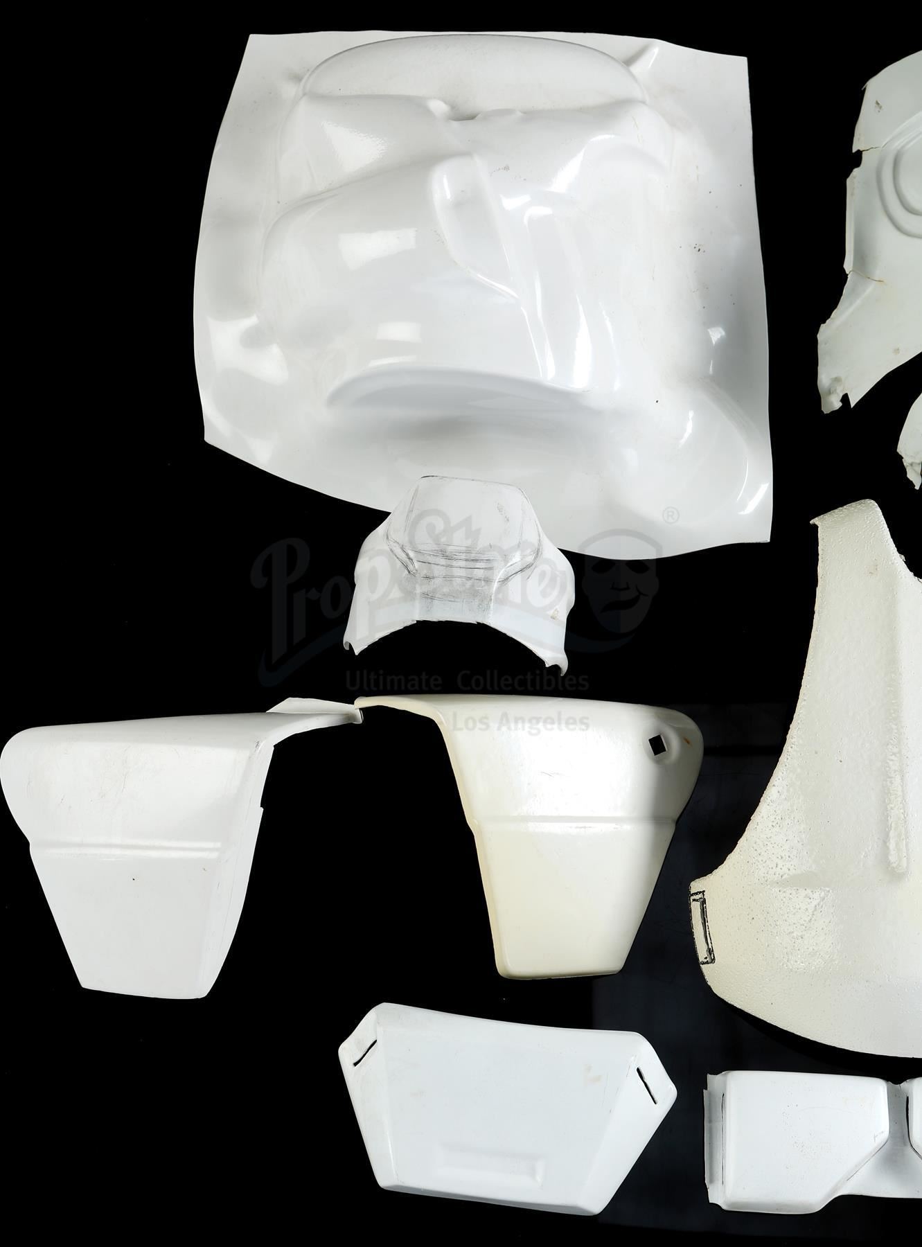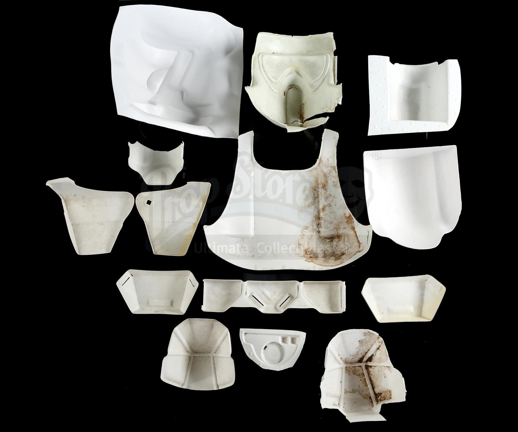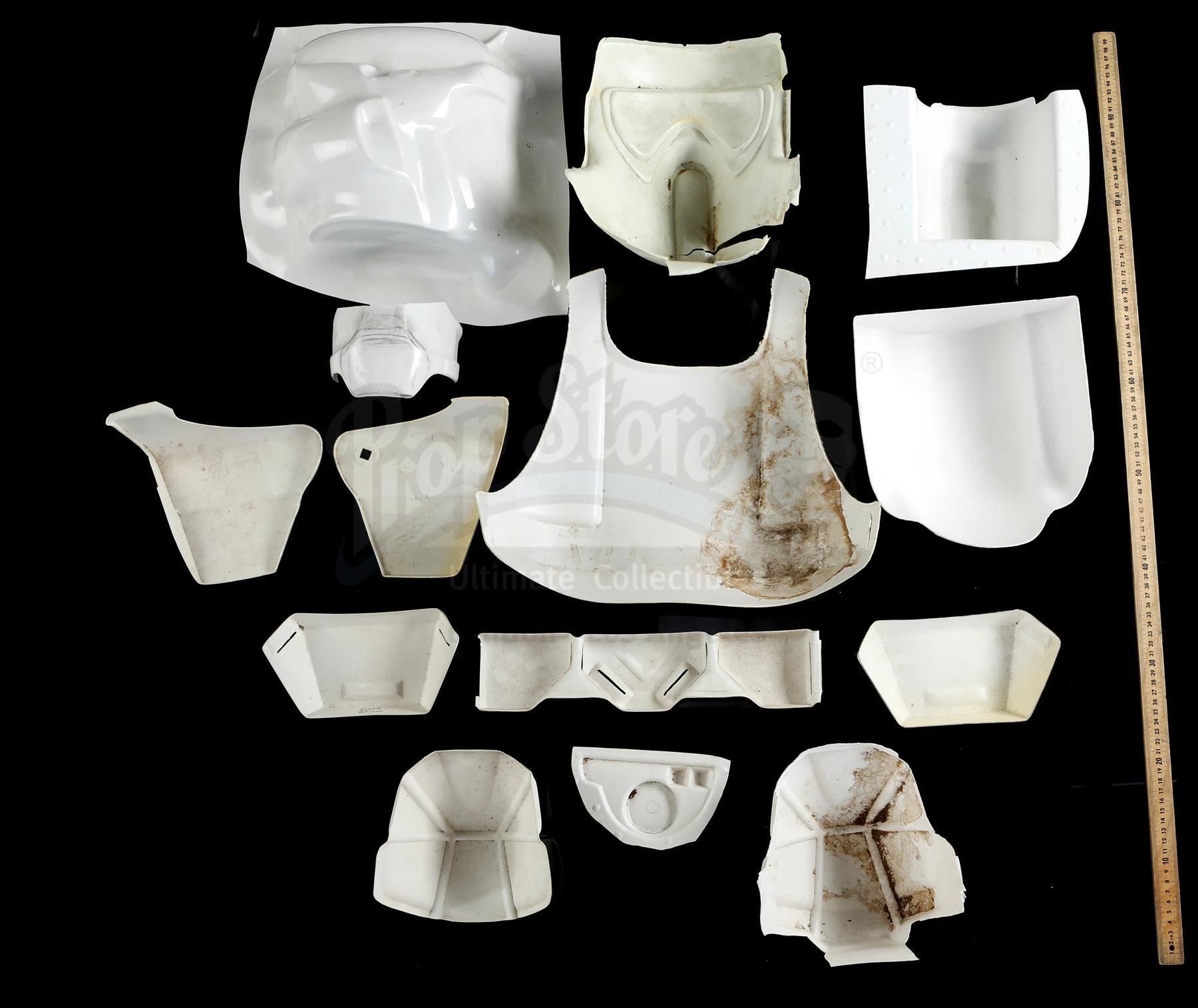 These 14 unfinished white vacuformed plastic casting components were created by production for fabrication of the scout trooper costumes. Included are castings for the front and side of the helmet, helmet visor, backpack, knee and arm pads, chest plate, and belt. The lot is in fair overall condition with several splits in the plastic and dirt in the interior of some items. Dimensions (box): 26 3/4" x 19" x 19" (68 cm x 48.25 cm x 48.25 cm)