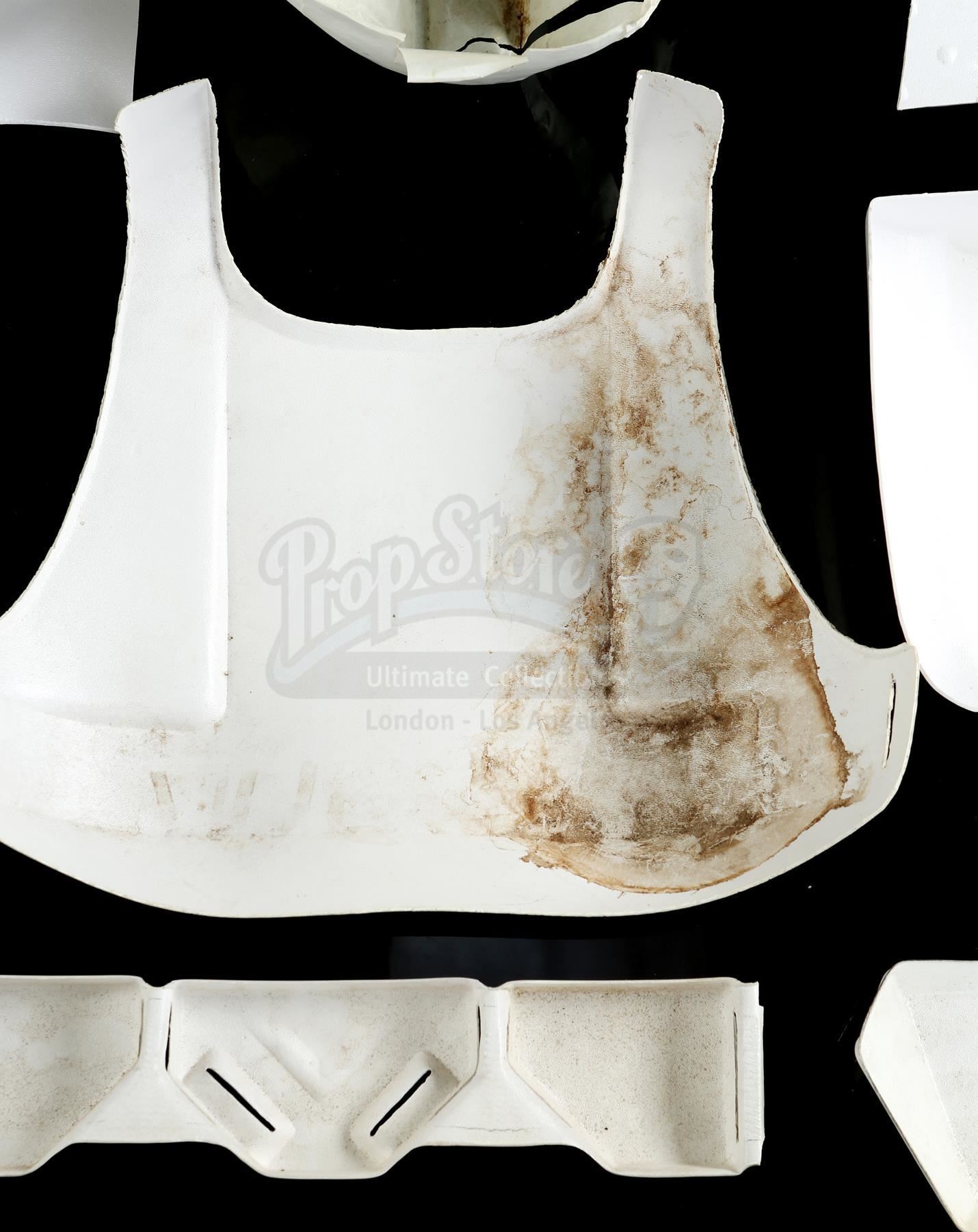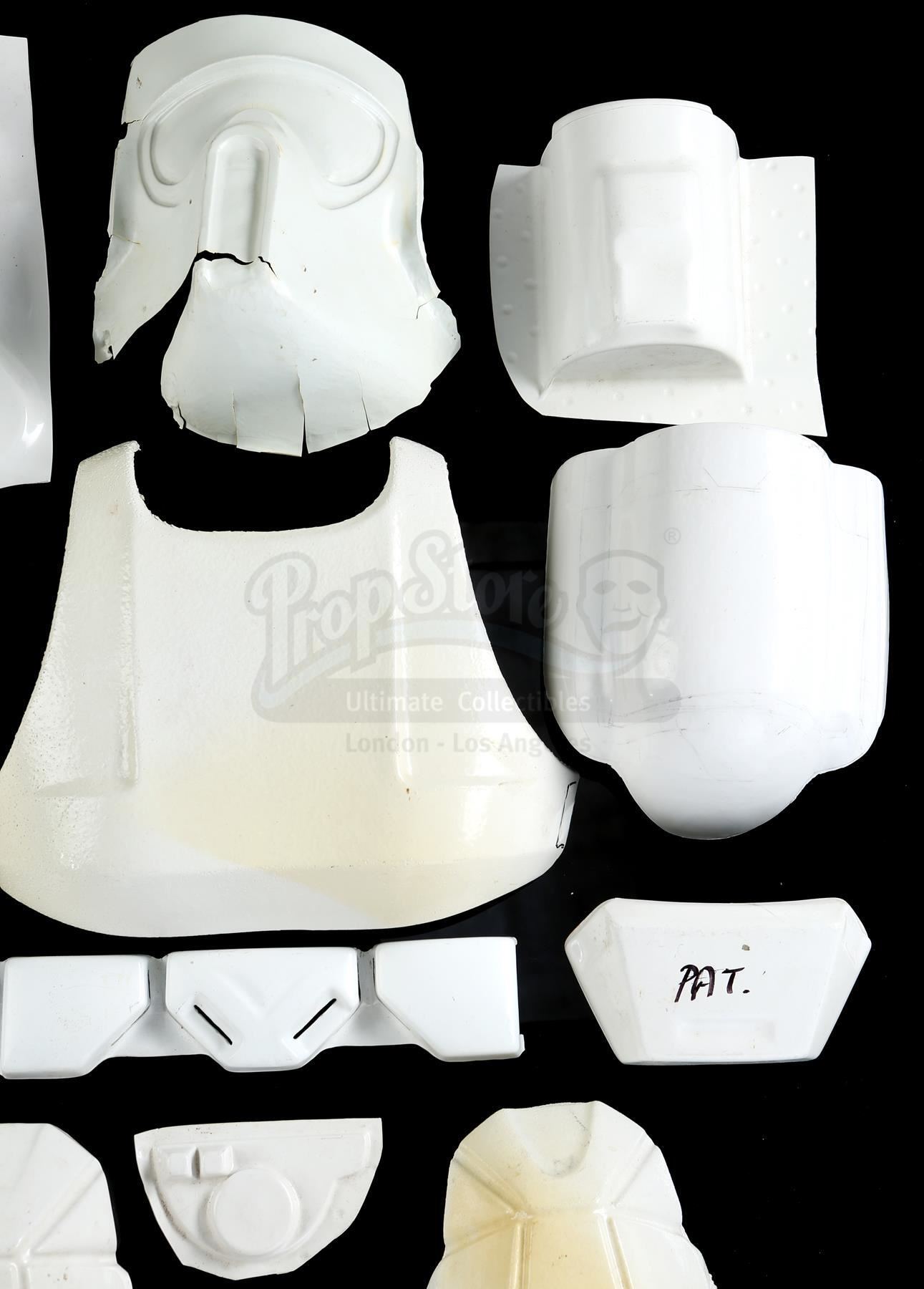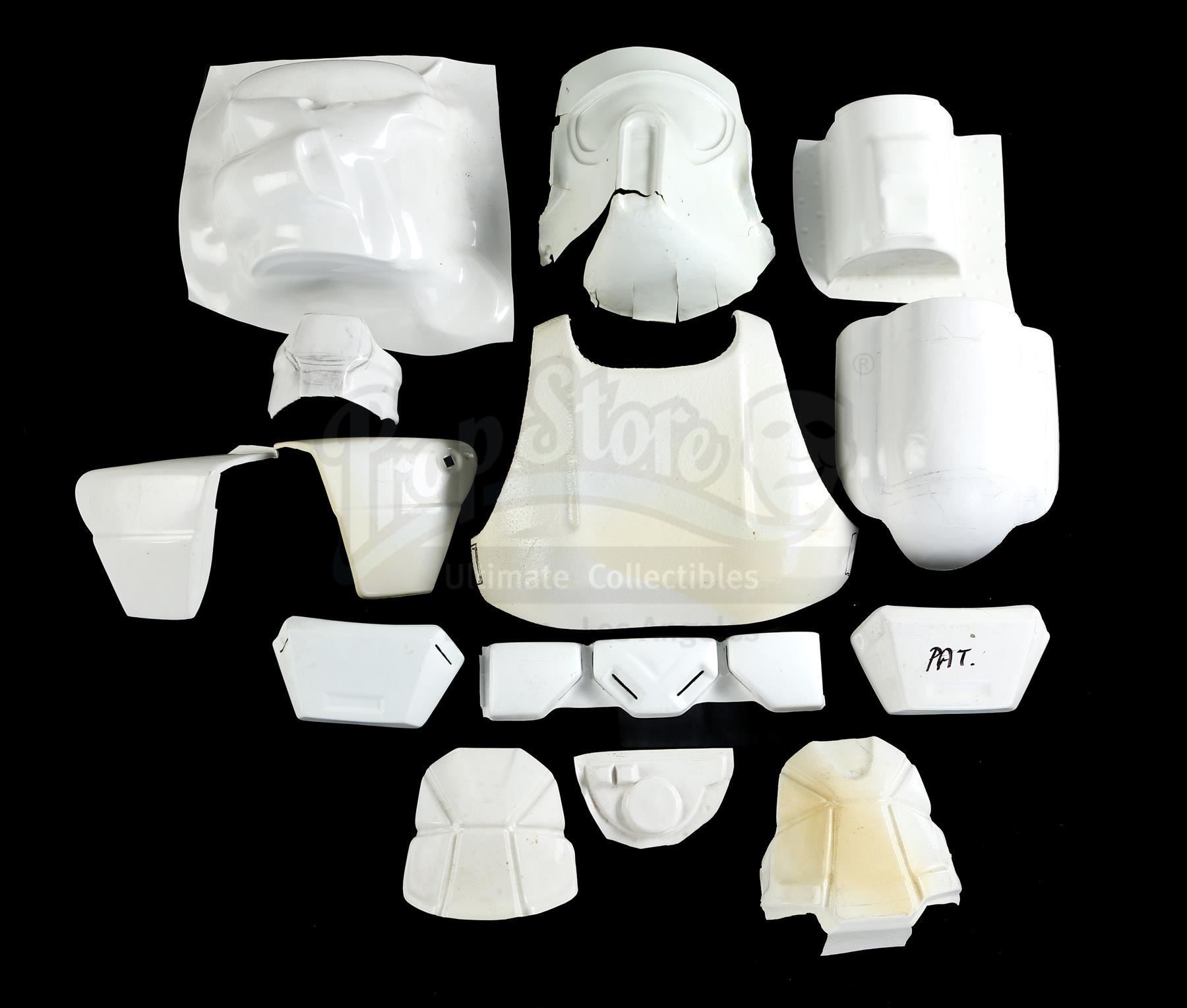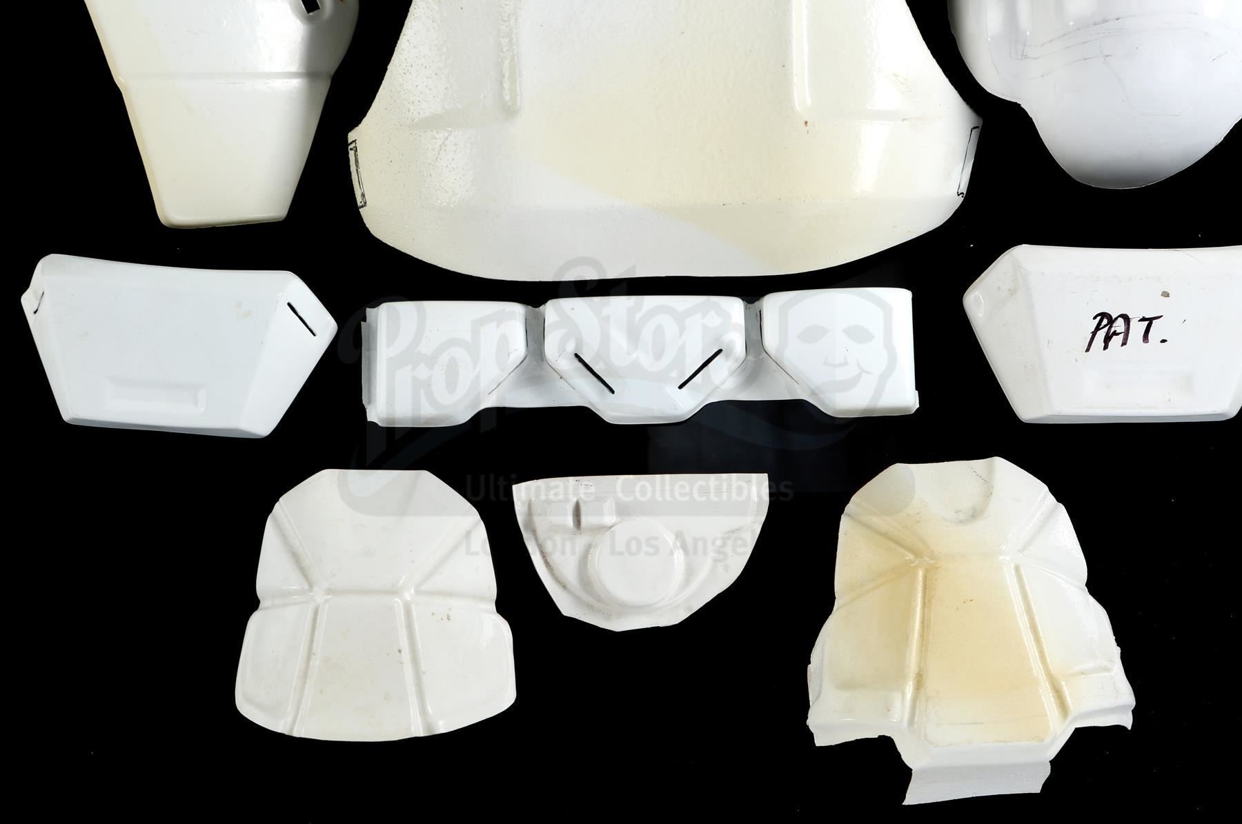These 14 unfinished white vacuformed plastic casting components were created by production for fabrication of the scout trooper costumes. Included are castings for the front and side of the helmet, helmet visor, backpack, knee and arm pads, chest plate, and belt. The lot is in fair overall condition with several splits in the plastic and dirt in the interior of some items. Dimensions (box): 26 3/4" x 19" x 19" (68 cm x 48.25 cm x 48.25 cm)