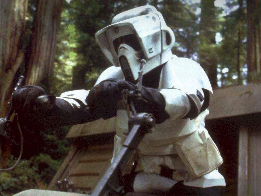 A scout trooper and armor production-made component set from Richard Marquand's Star Wars: Return of the Jedi. Designed by Nilo Rodis-Jamero, scout troopers wearing modified stormtrooper armor patrolled the forest moon of Endor on their speeder bikes.