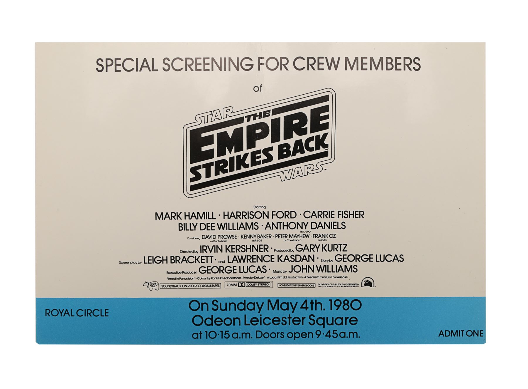 Anthony Daniel's personal crew member screening ticket from the promotion of Irvin Kershner's Star Wars: The Empire Strikes Back. Printed on card, the ticket is an invitation to a special crew members screening of the film at the Odeon in Leicester Square on Sunday, March 4 1980. The lot exhibits some minor creasing down the centre. Dimensions: 13.5 cm x 20 cm (5 1/4" x 7 3/4")