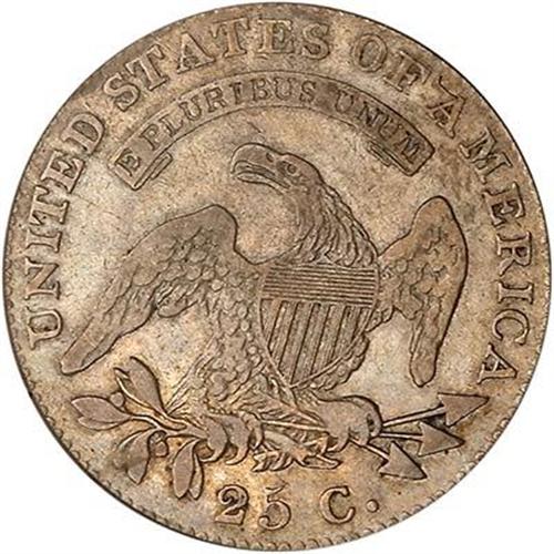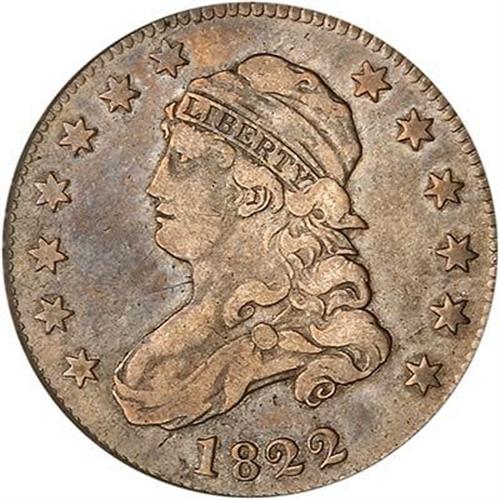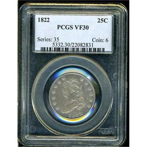 1822 Capped Bust Quarter Dollar. This is the only readily collectible die variety of 1822; Browning-2 is the rare 25/50 reverse that is elusive in all grades and is essentially out of the picture for most collections. The B-1 variety is more common in most circulated grades as represented here by an attractive VF30 example certified by PCGS. (#5332)