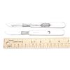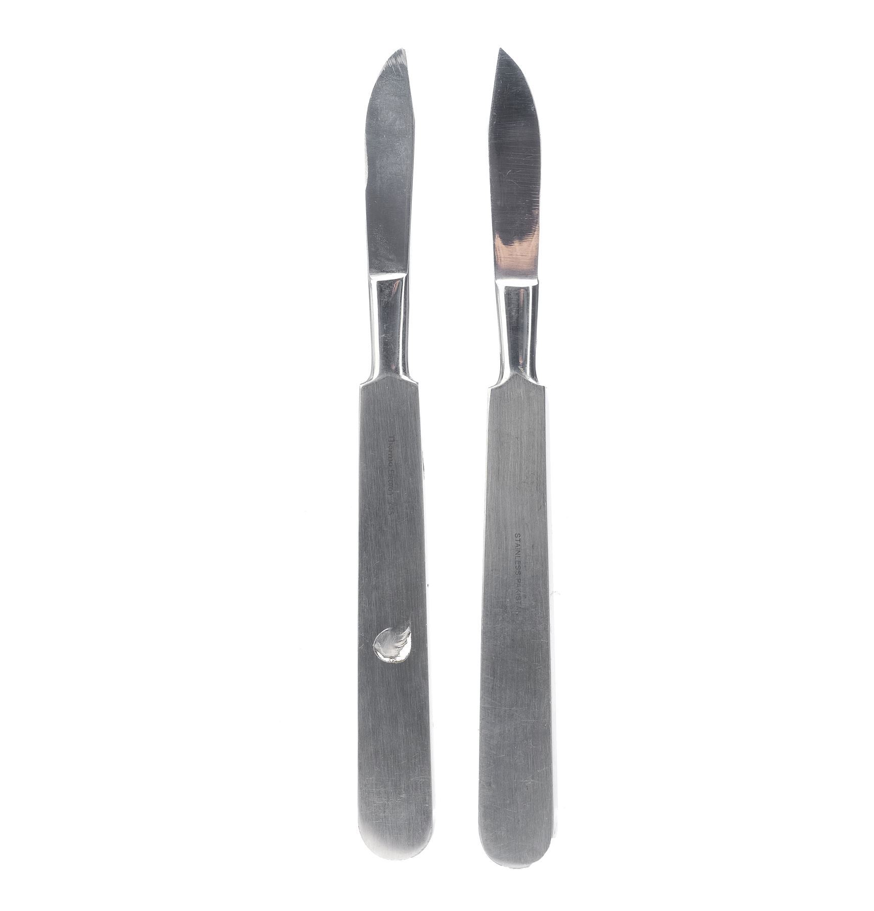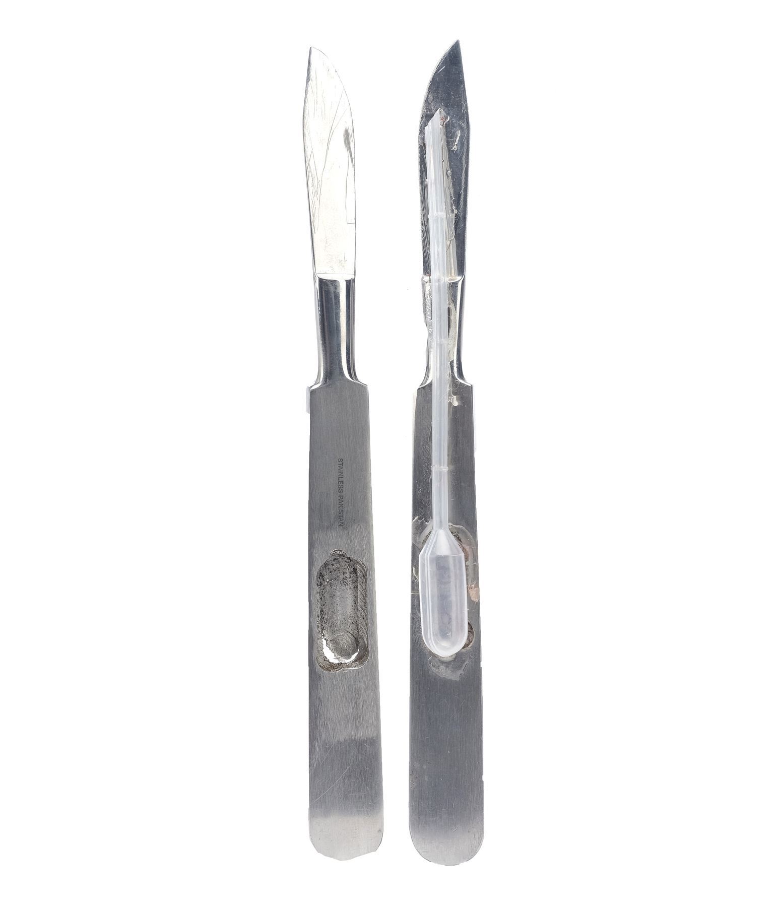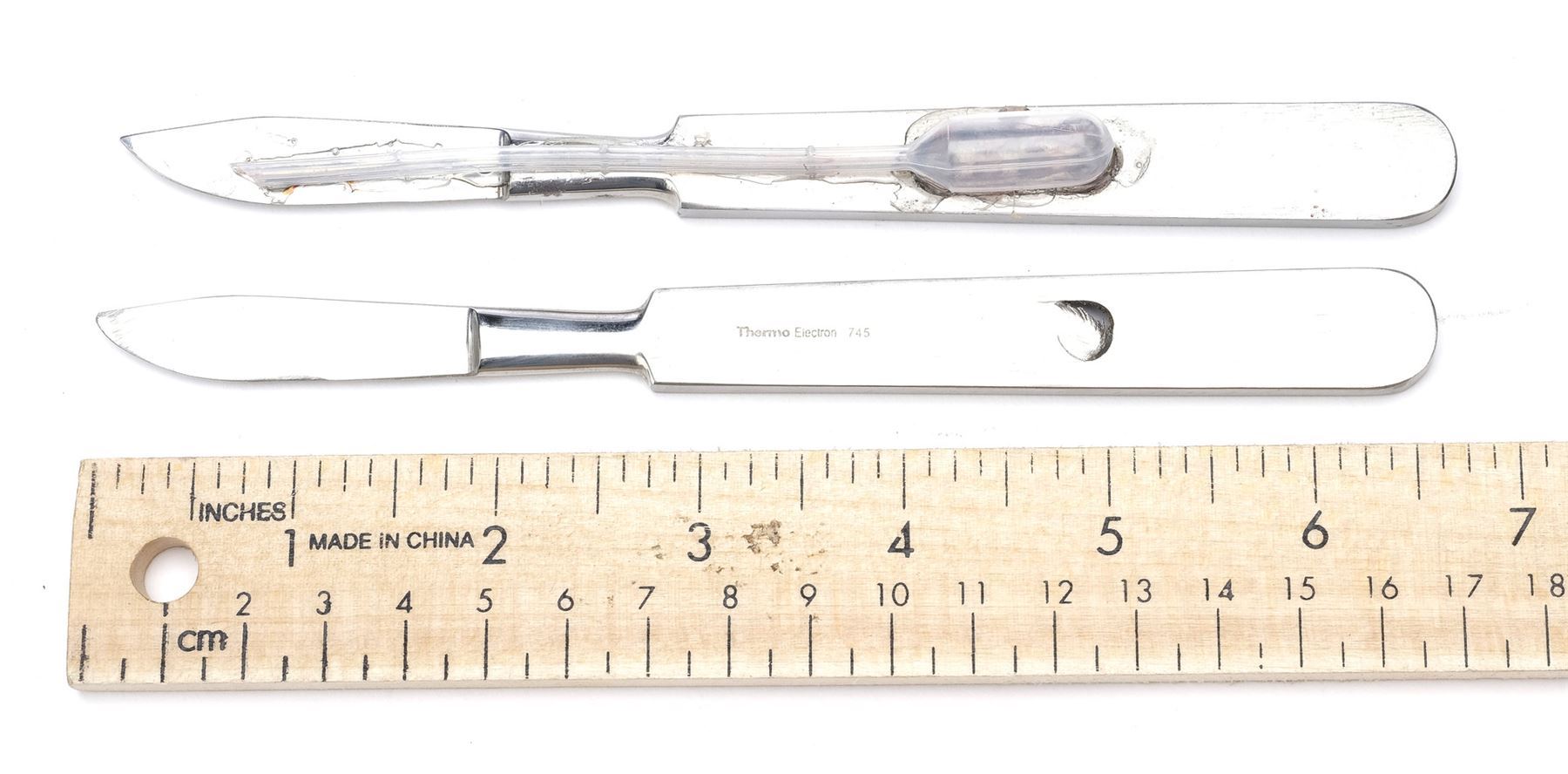 This lot comes from the collection of renowned special effects artist Tom "Brooklyn" Bellissimo. It consists of two hollowed stainless steel Thermo Electron 745 surgical scalpels. One scalpel is glued with a plastic SFX blood pipette. Both exhibit scratches and glue residue from production use. Dimensions (scalpel with pipette): 7" x 0.75" x 0.5" (18 cm x 2 cm x 1.5 cm); (scalpel without pipette): 7" x 0.75" x 0.25" (18 cm x 2 cm x 0.75 cm)