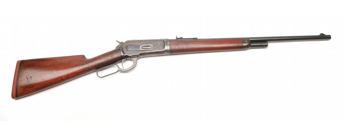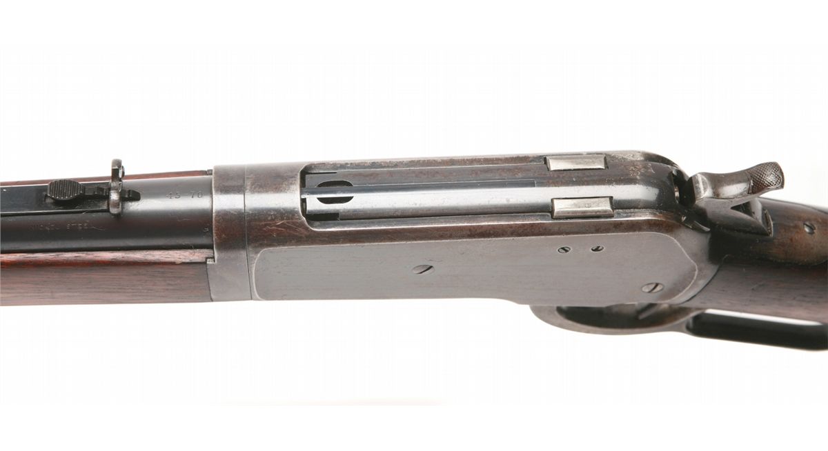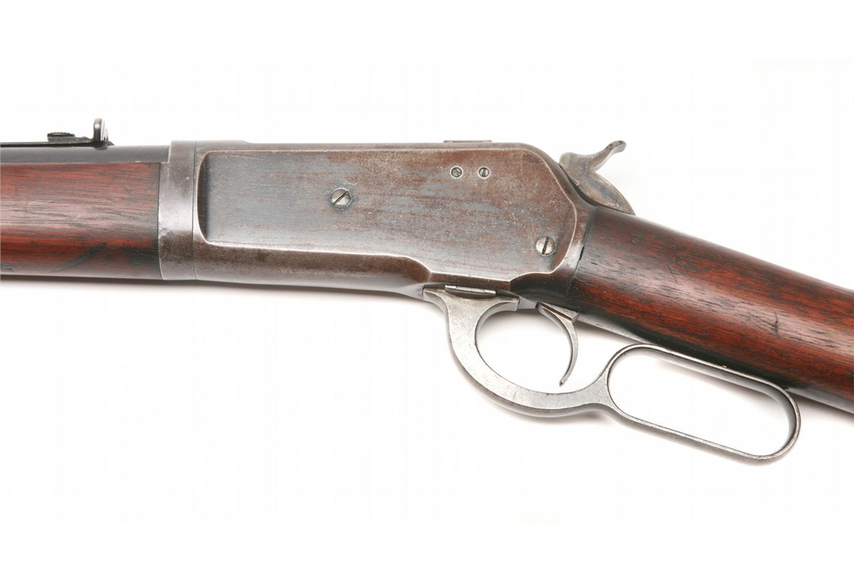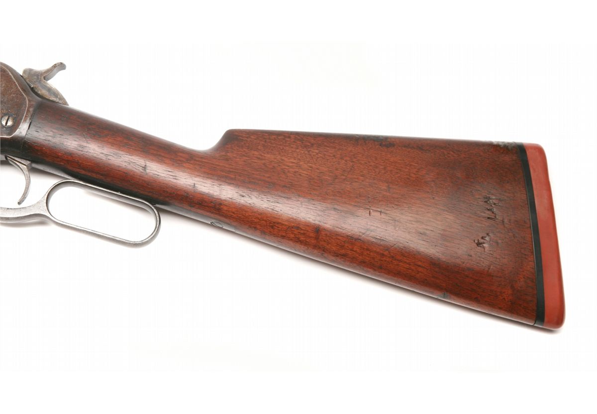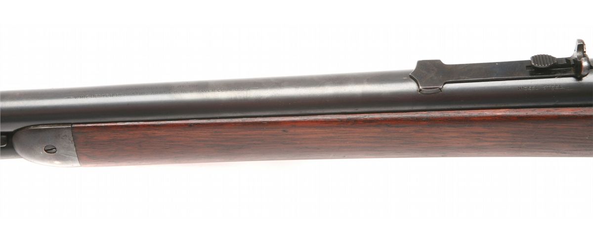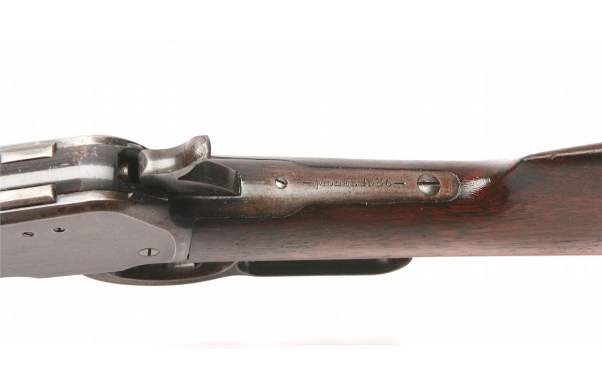 Fine condition - 22" round lightweight barrel - RARE - Special order lightweight takedown model -98% blue finish on barrel - 35% remaining blue on receiver with balance to soft brown patina - smooth walnut stock in very good condition with normal handling & storage marks - Type 2D hard rubber shotgun style buttplate - front fixed blade & rear adjustable rifle sights - legible two line barrel address "MANUFACTURED BY THE WINCHESTER REPEATING ARMS CO. NEW HAVEN, CONN. U.S.A." crisp one line Nickel Steel stamp on left barrel - crisp caliber markings - pre Winchester proofed stamp barrel - Type 2 takedown lever marked with "PAT. JUNE 6, 1893" - The Winchester Archive letter indicates the rifle was received in warehouse October 23, 1900 and shipped from warehouse on October 24, 1900 – caliber: 45/70, barrel length: 22” barrel shape: round, Extra light, plain trigger, ½ magazine, shotgun butt with rubber butt plate - lever action in very good condition - traces of case on hammer - yr. mfg: 1900 - SN 122755 - est. 6000 - 10000 - C&R - 20kADAVA009