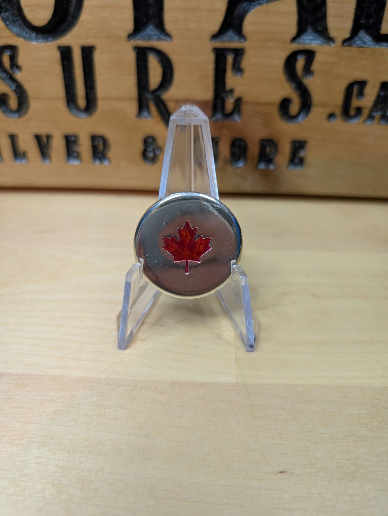 The 1 oz Silver Round Colored Canadian Maple Leaf is made from .9999 fine silver and features a vibrant, colored version of the iconic Canadian maple leaf design. These rounds are popular among collectors due to their unique appearance and high-quality craftsmanship. The value is based on the current silver price and collector interest in the colored design.