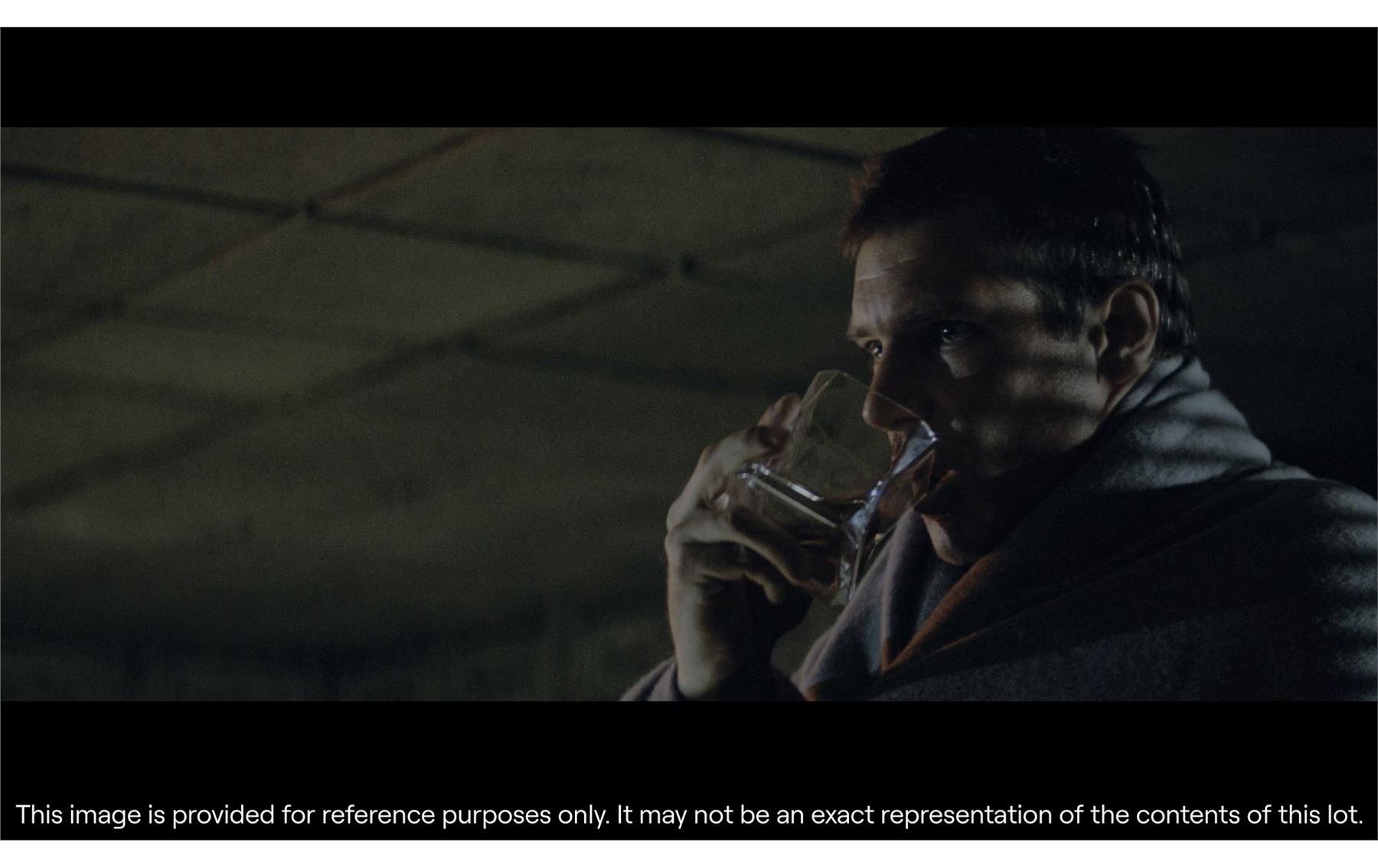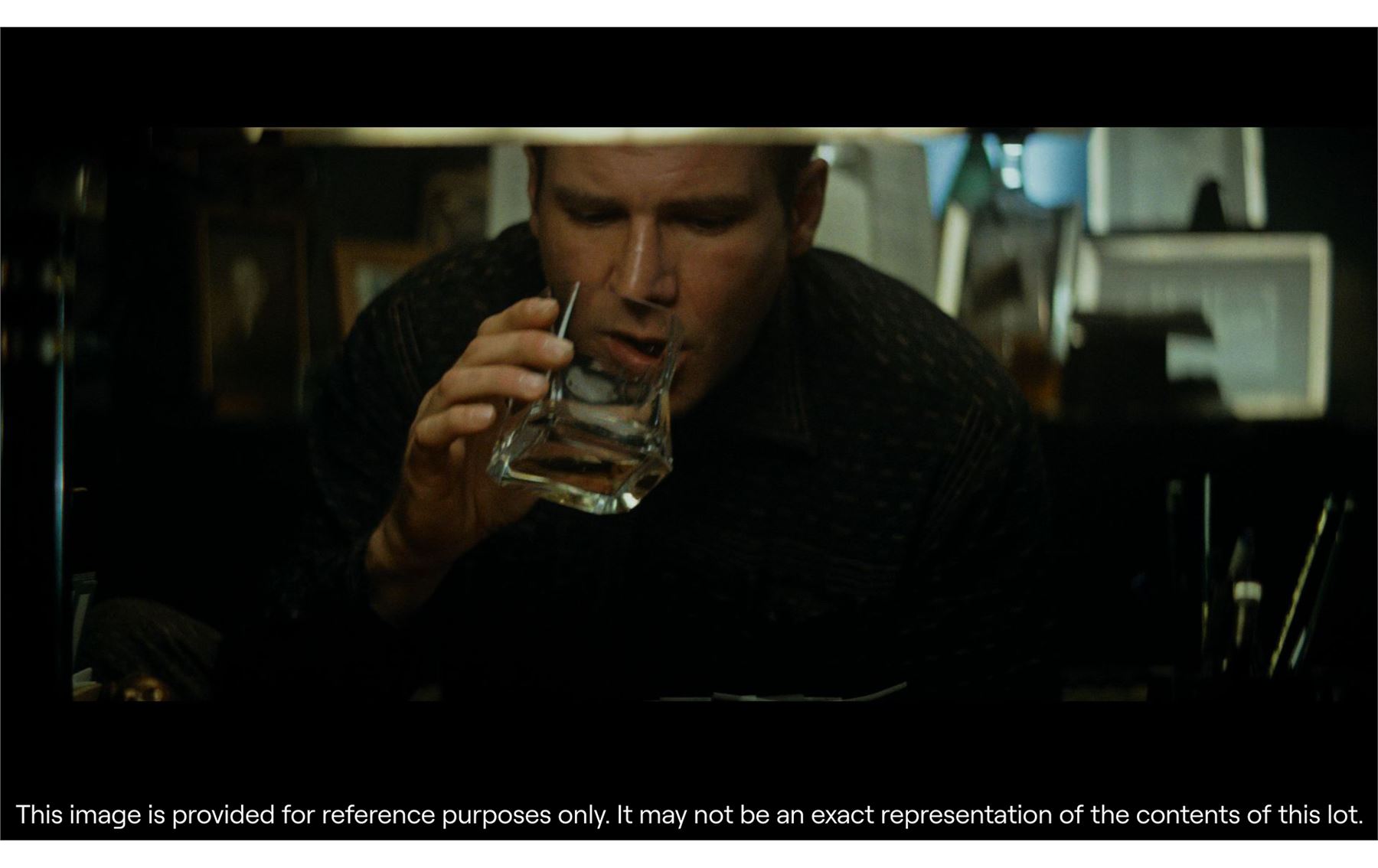 A pair of glass whiskey tumblers from Ridley Scott's sci-fi classic Blade Runner. Rick Deckard (Harrison Ford) sipped whiskey from a glass tumbler while viewing Esper tapes in his apartment. This lot comes from the estate of Terry Rawlings, the supervising editor on the film.