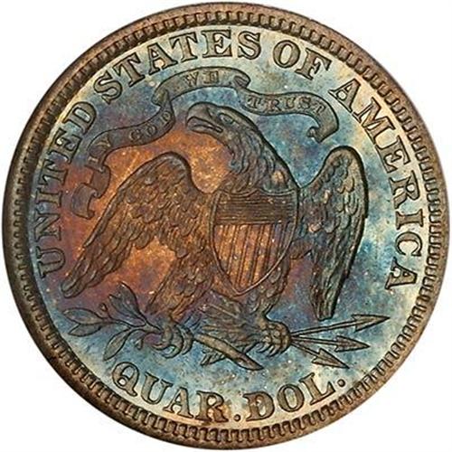 1887 Liberty Seated Quarter Dollar. Fully struck and glossy smooth mirrors throughout, no distracting hairlines present, and top-notch attractive original color. The toning makes a nice transition from russet to deep lavender-gray with some steel blue iridescence. This is one of those "must have" issues from the low-mintage 1879-89 period. For all of 1887, the mintage totaled only 10,710 pieces, of which the Proofs comprised 710. (#5588)