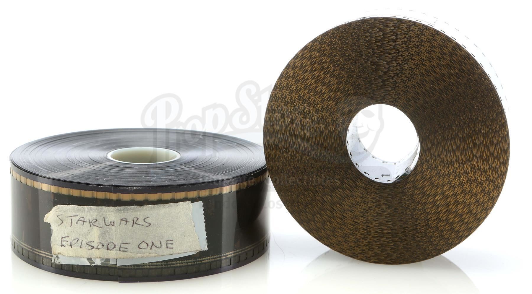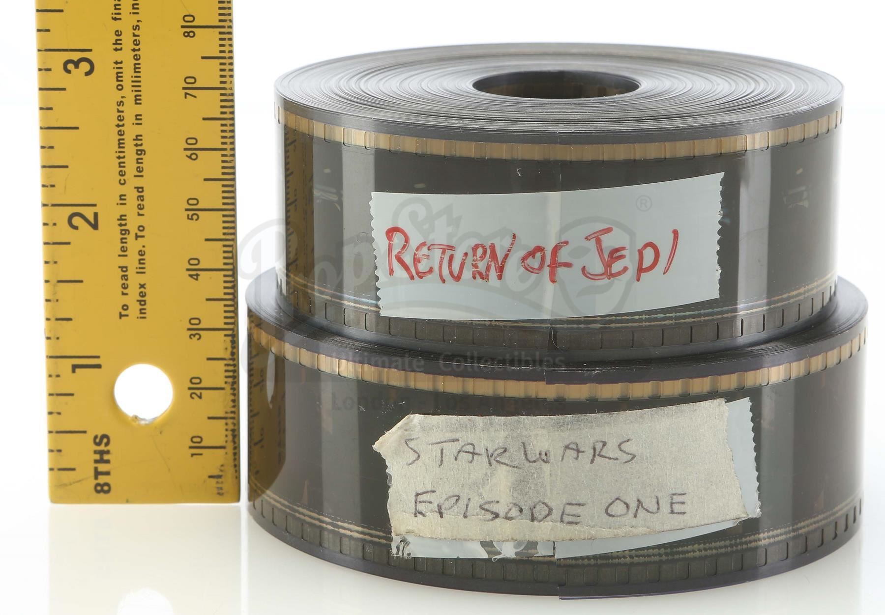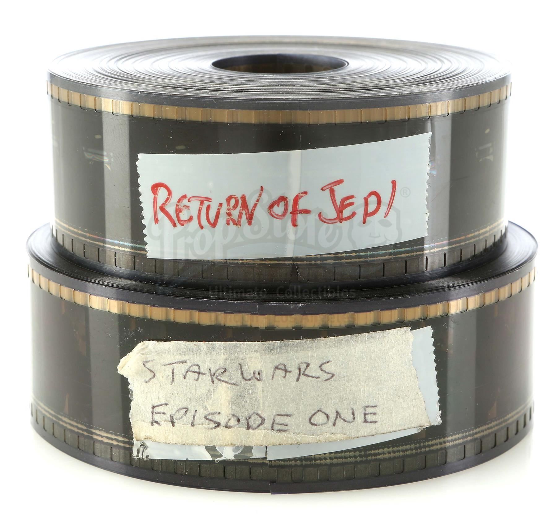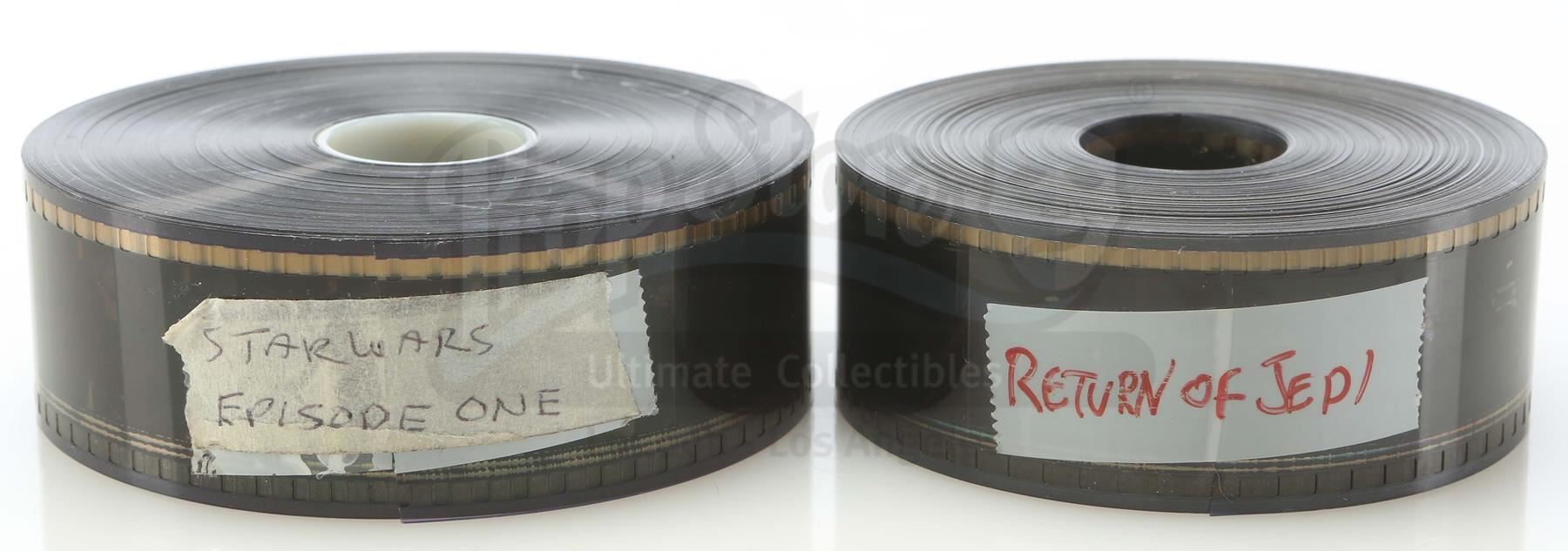These 35mm film reels are labeled "Return of Jedi" and "Star Wars Episode One" with tape, with the latter spooled around plastic. They exhibit some signs of age and storage, including dust and discoloration to the film, but remain in good overall condition.