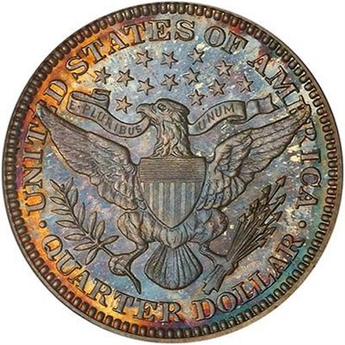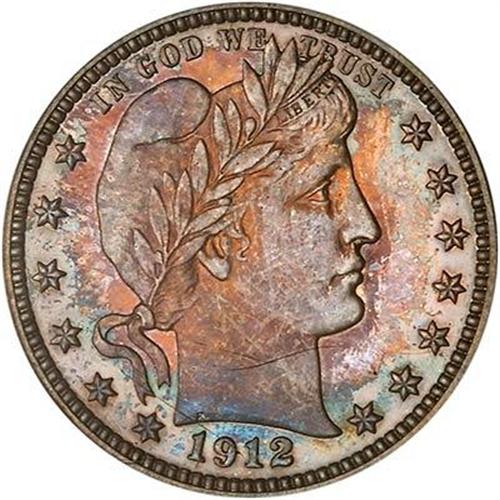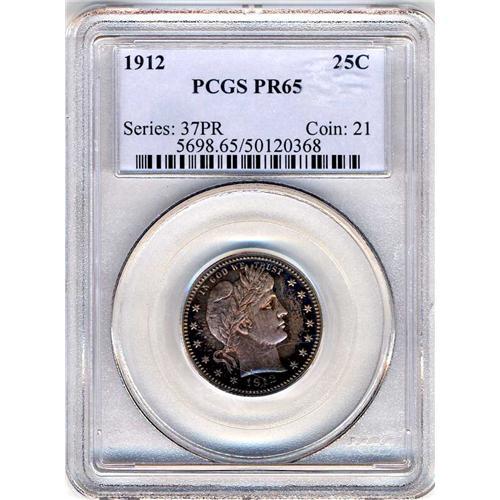 1912 Barber Quarter Dollar. Lovely original toning covers both sides. Mirror-fresh luster surrounds the satiny devices. And everywhere crystal clarity is seen at the portrait and on the reverse, here it is probably that the dies were spaced exactly the right distance to prevent any weak metal flow in the key areas. Accounts vary but the best information is that Proofs were given two blows by the specially made dies. Some say that Proofs were struck on a special hydraulic press, while others say that by the time the Barber coinage made its appearance, the mint's electrically operated coining presses were up to the task of making these majestic Proofs. In all, there were 700 Proof quarter struck in 1912. (#5698)