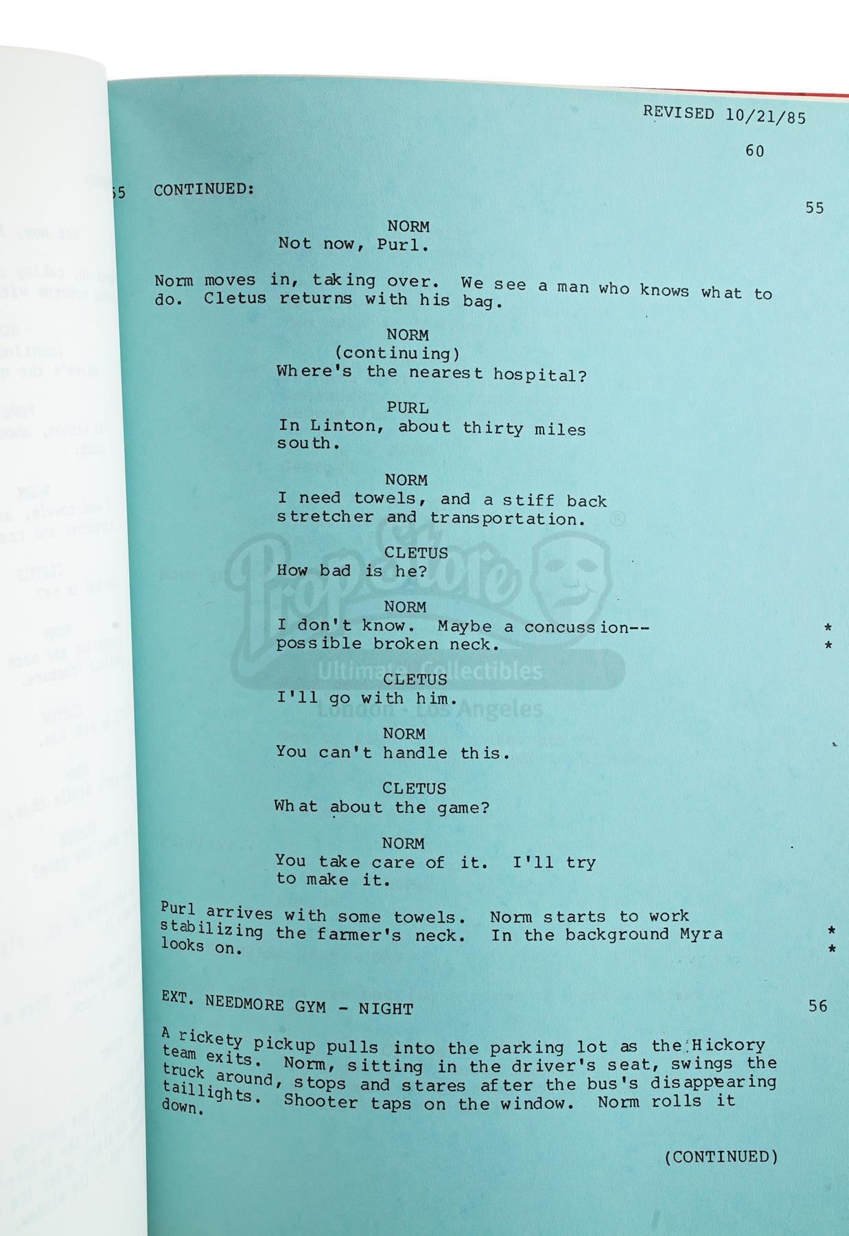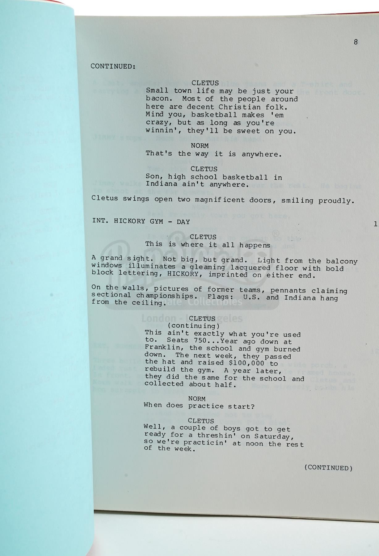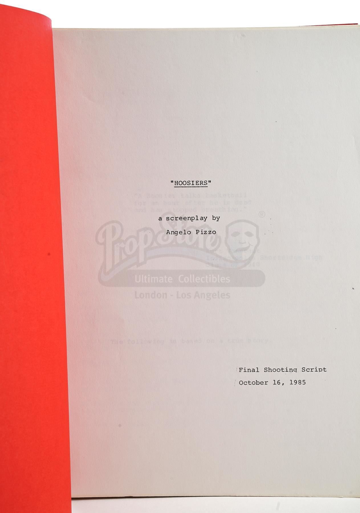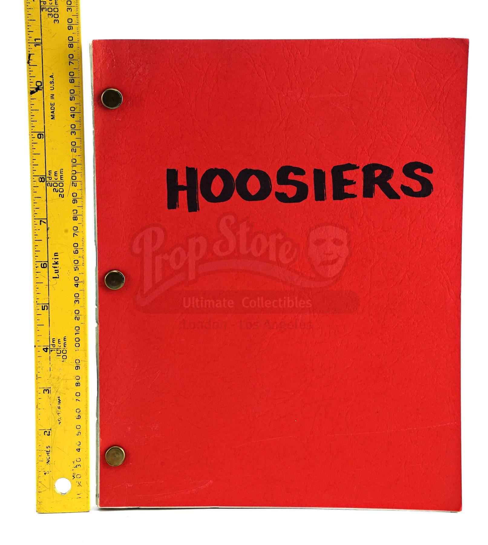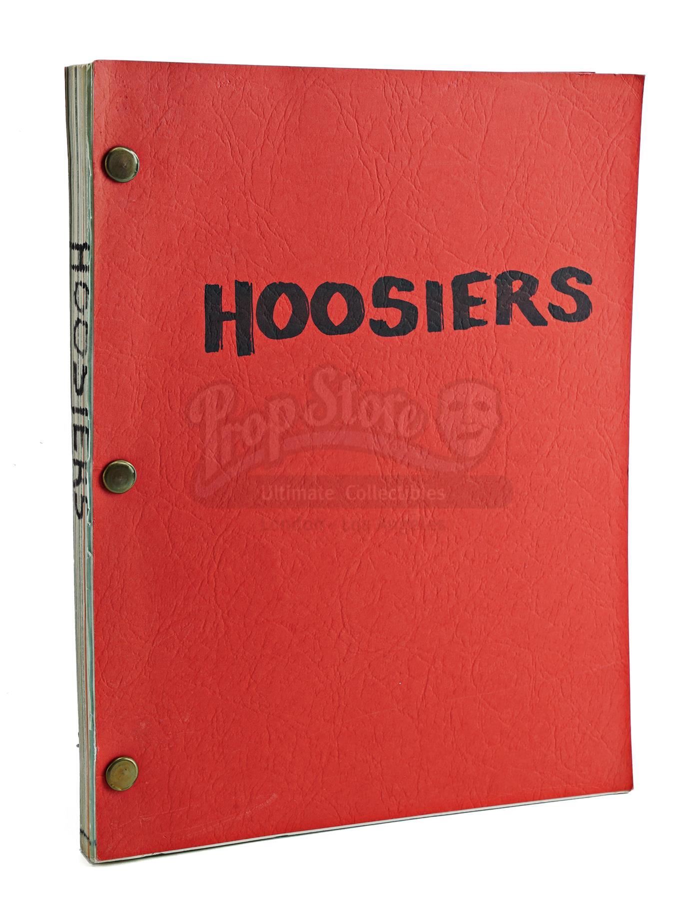 This lot will be auctioned on Wednesday, June 30th. The auction will begin at 9:00am PDT and lots are sold sequentially via live auctioneer; tune in to the live streaming broadcast on auction day to follow the pace. Note other lots in the auction may close on June 29th or July 1st. A bound final shooting script from the production of David Anspaugh's Academy Award-nominated sports drama Hoosiers. The screenplay was written by Angelo Pizzo, and the film was distributed in 1986 by Orion Pictures. This multicolor script, the final shooting draft dated "October 16, 1985," is bound with brass brads and features a red leatherette cover marked "HOOSIERS" in ink on the front and side. It is in good overall condition with minor edge wear and bending throughout. Dimensions: 11" x 8.5" x 1" (28 cm x 21.75 cm x 2.5 cm) Estimate: $400 - 600
