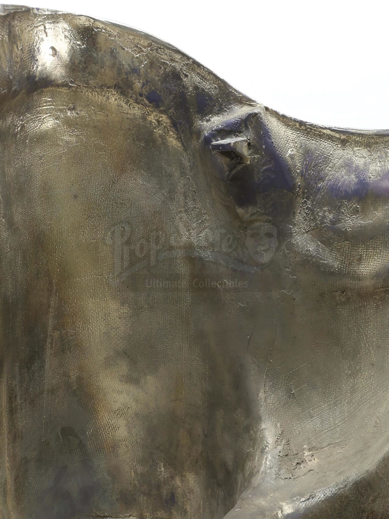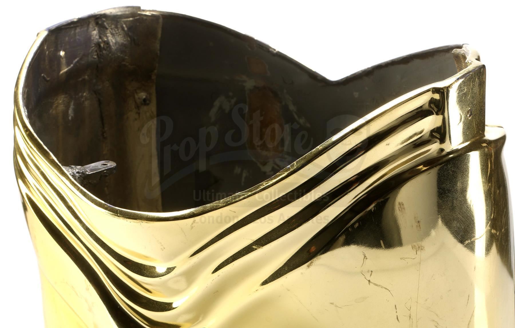 These front and back bottom plates were constructed of metal-finished goldtone fiberglass for the theme park with side holes for securing to other plates and two metal hooks affixed to the front plate. They remain in good overall condition with scuffed paint and chips to the fiberglass where the back plate's hooks have snapped. Dimensions (front): 14" x 13" x 9" (35.75 cm x 33 cm x 23 cm); (back): 15" x 12 1/2" x 4" (38.25 cm x 31.75 cm x 10.25 cm)