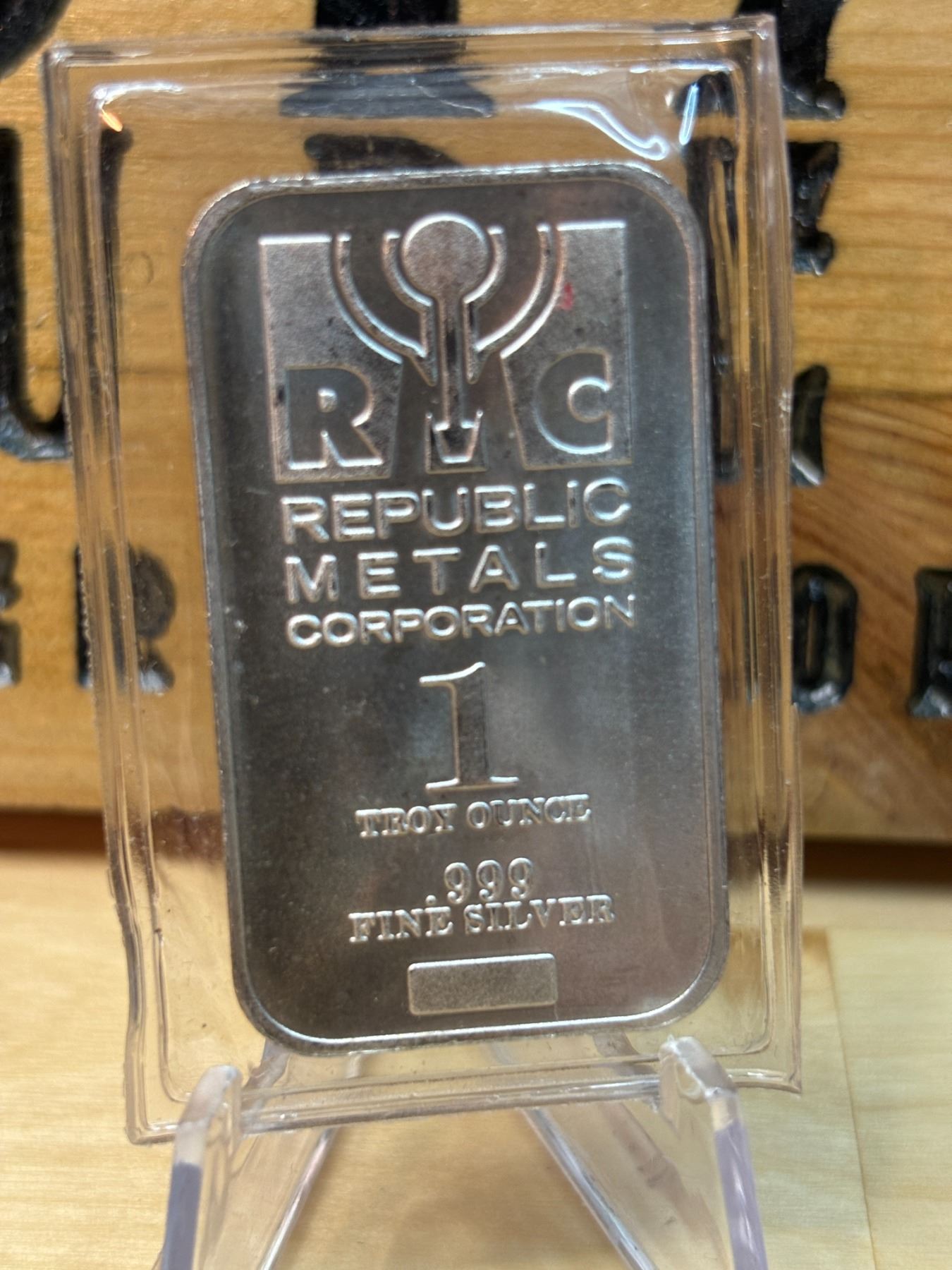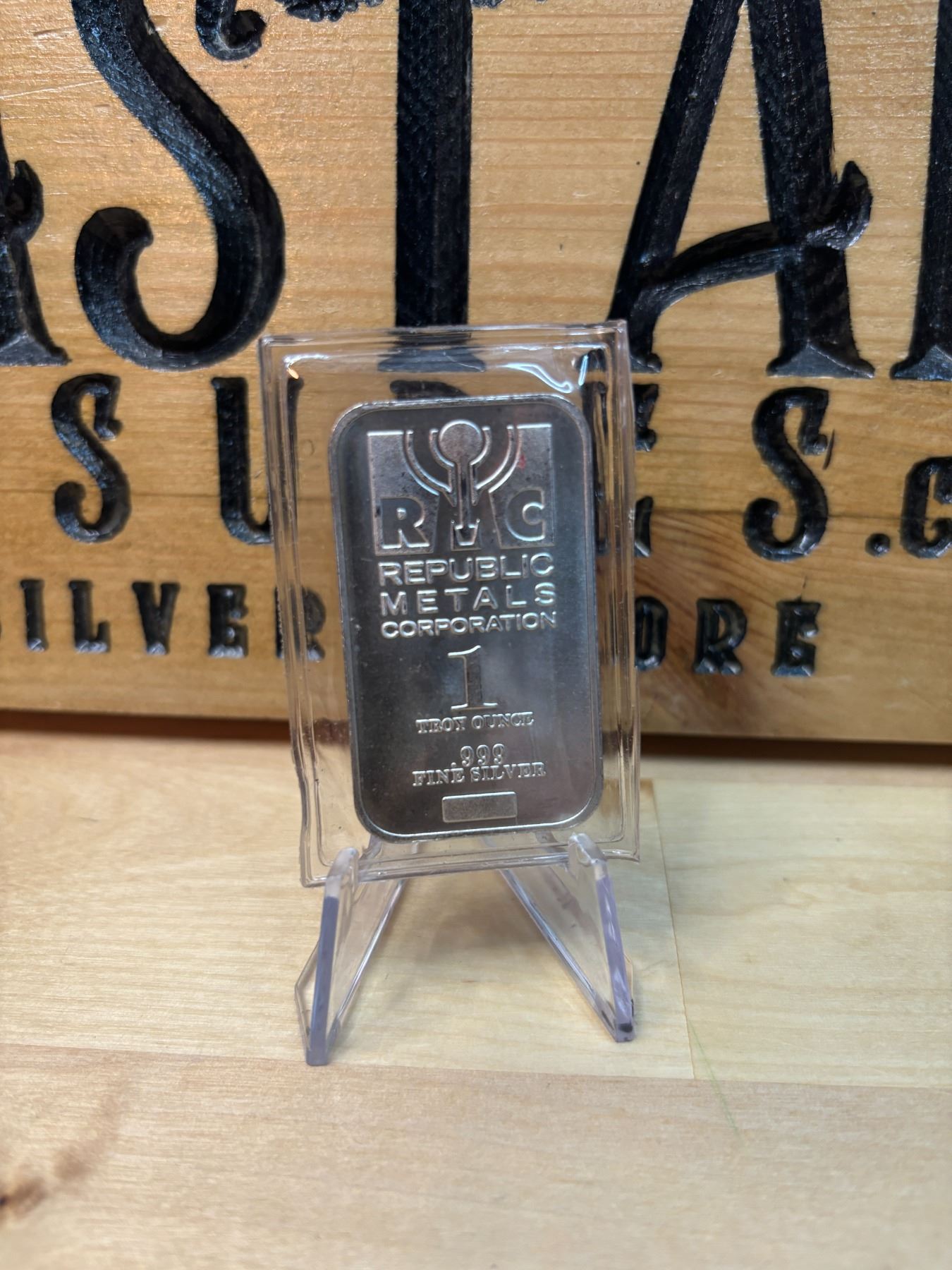 The 1 oz RMC Silver Bar is a 1-ounce silver bar made from 99.9% pure silver. RMC stands for Republic Metals Corporation, a well-known and respected refiner of precious metals. These bars typically feature the RMC logo, along with information such as weight, purity, and sometimes a unique serial number. They are highly sought after by investors and collectors due to their recognizable branding, high-quality silver content, and compact size. The 1 oz RMC silver bar is often valued both for its silver purity and the trust associated with the Republic Metals brand.