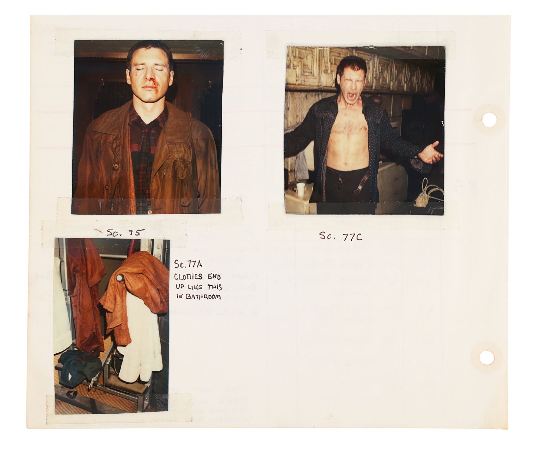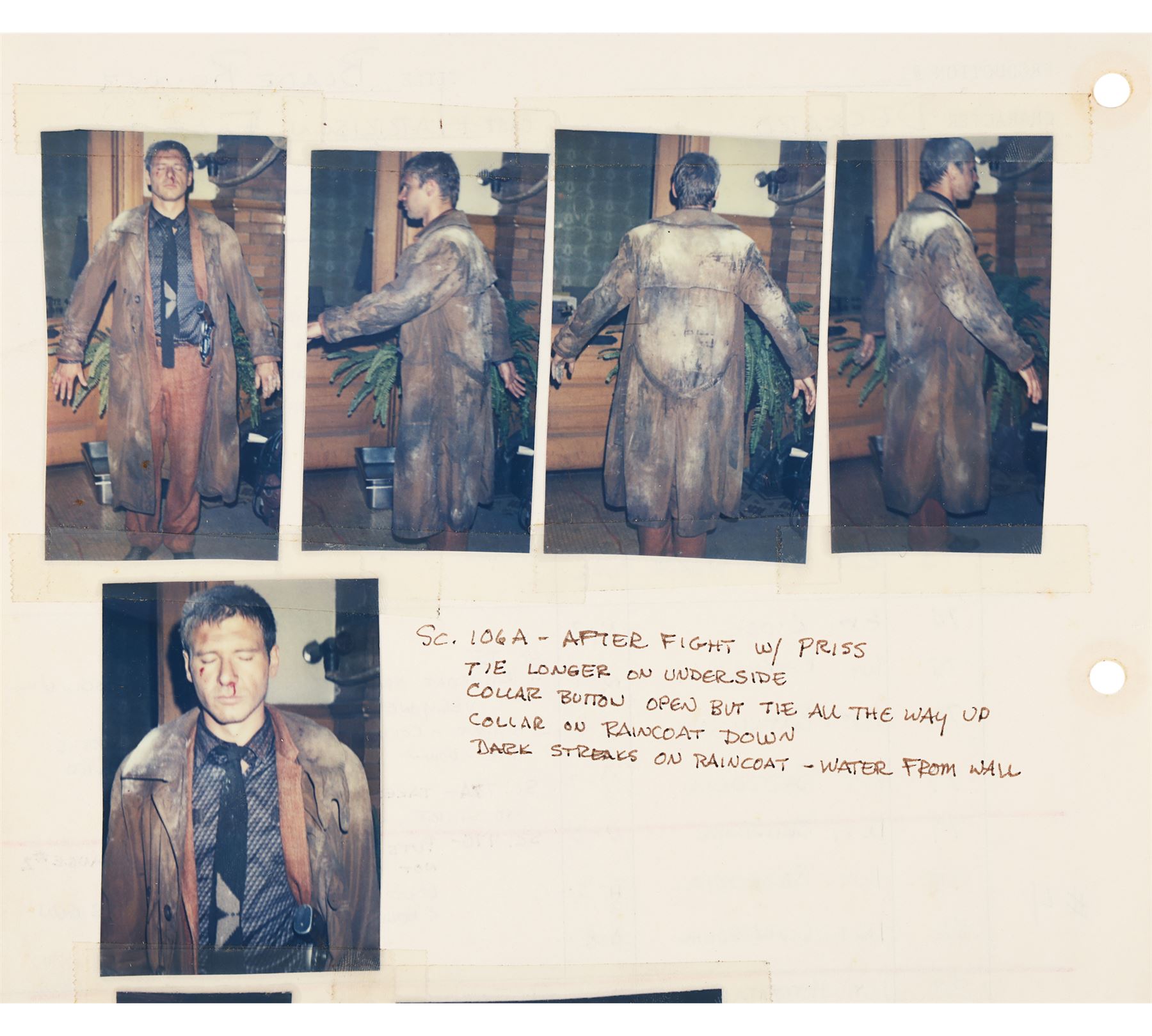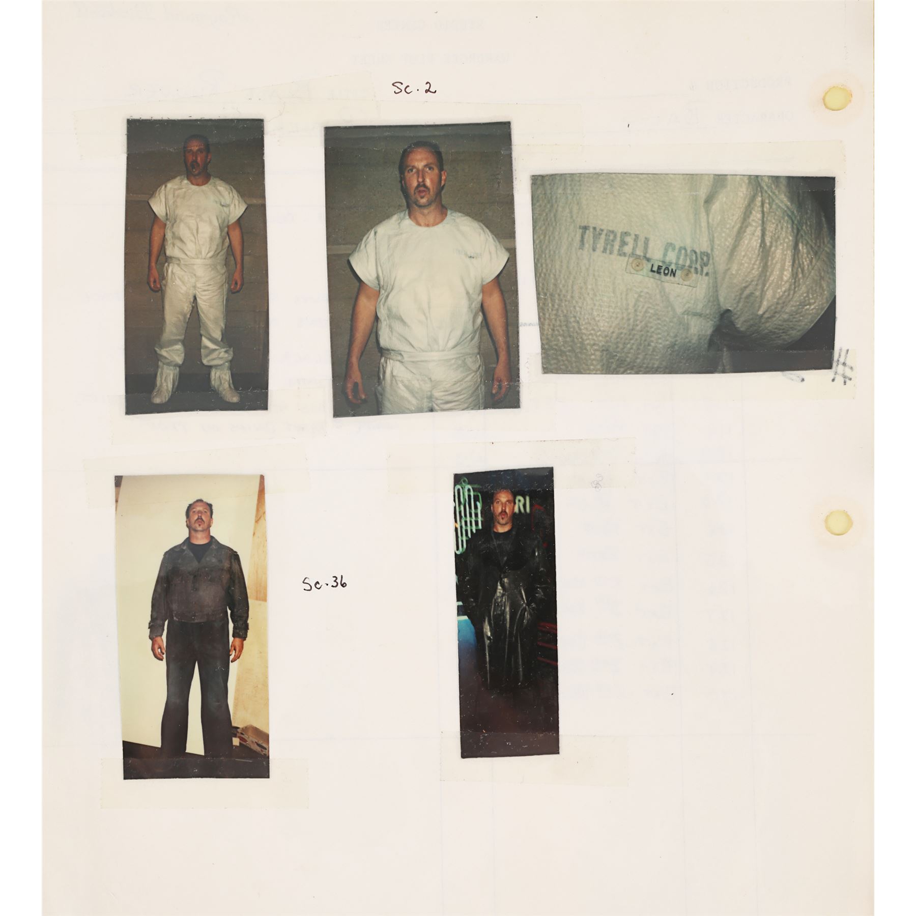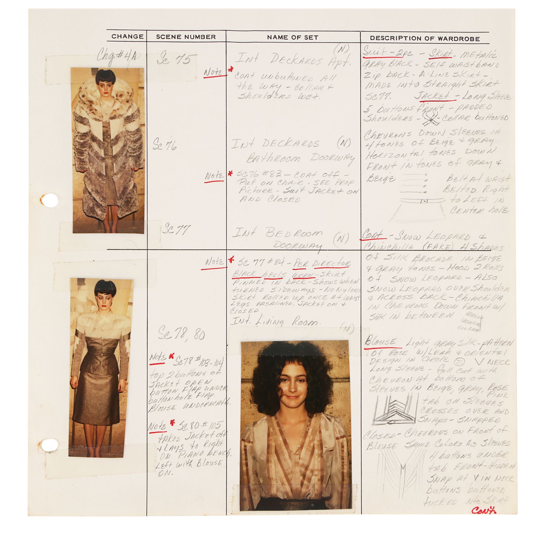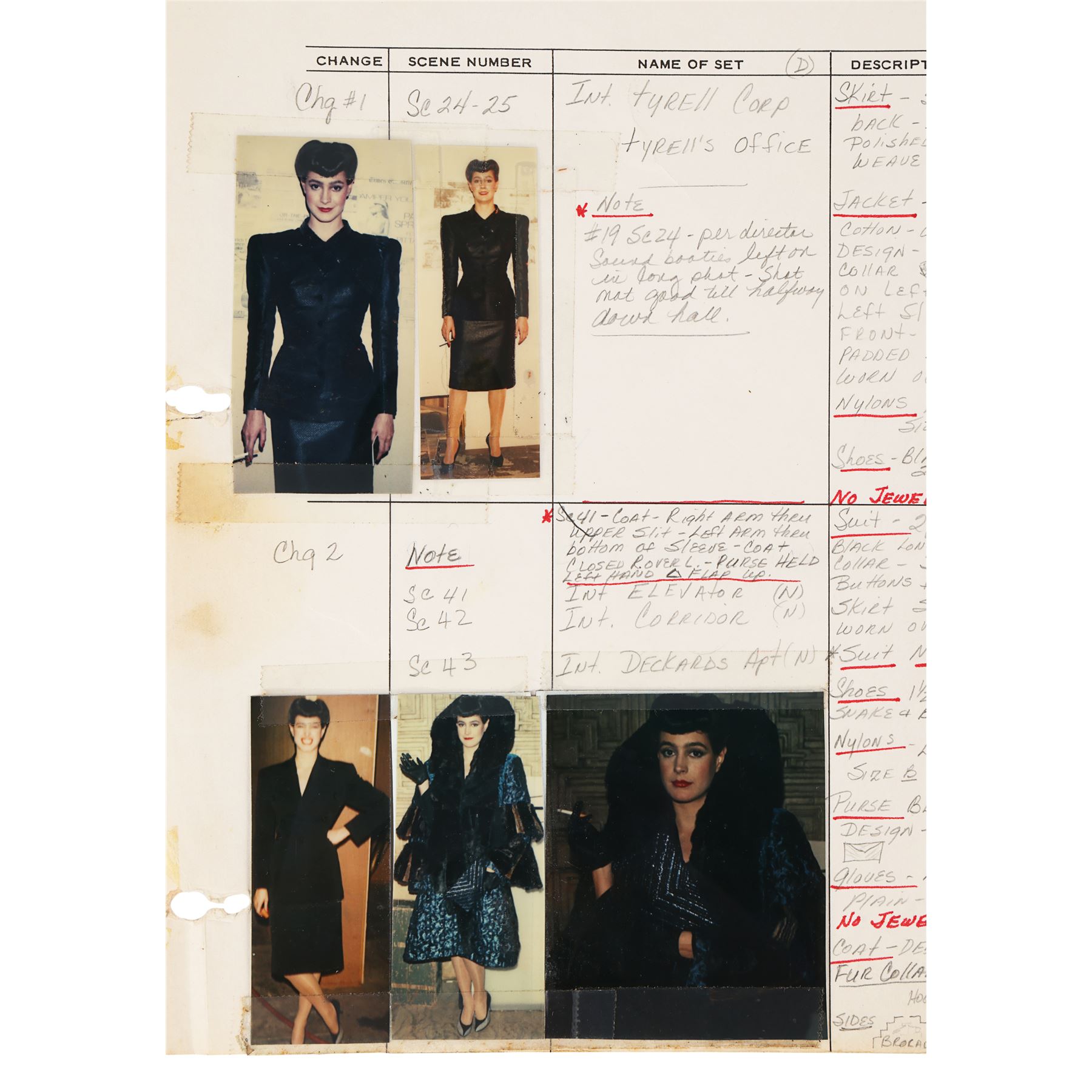 Meticulously organised, the costume bible comprises 44 pages, each contained in a plastic sleeve and bound in a blue three-ring lever-arch file. They contain detailed handwritten wardrobe descriptions corresponding to different scene numbers, in addition to several Polaroid images. There are notes for the majority of the main cast. The notes for Deckard (Harrison Ford) are particularly detailed, comprising five pages, 20 Polaroid photographs and two clothes swatches. There are also costume notes on several secondary characters, including Kaiser (John Edward Allen) and Bear (Kevin Thompson), along with sex workers, dancers, club patrons, sushi bar patrons, showgirls and street thugs. There are 117 individual photographs in total.