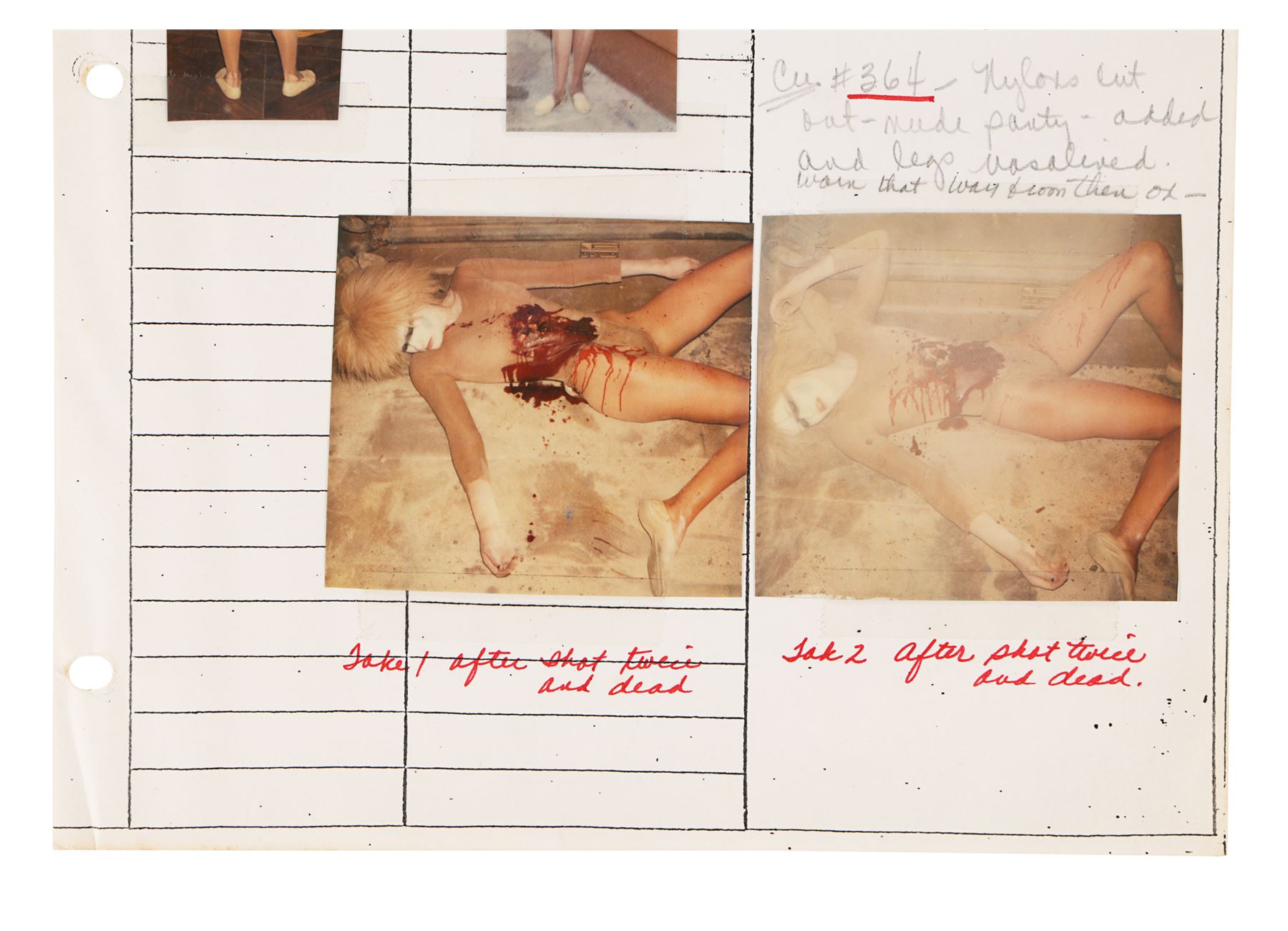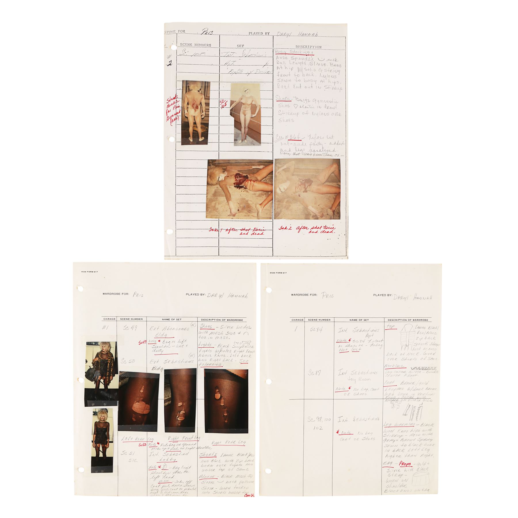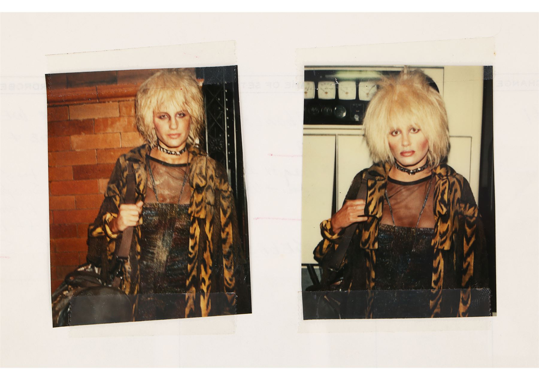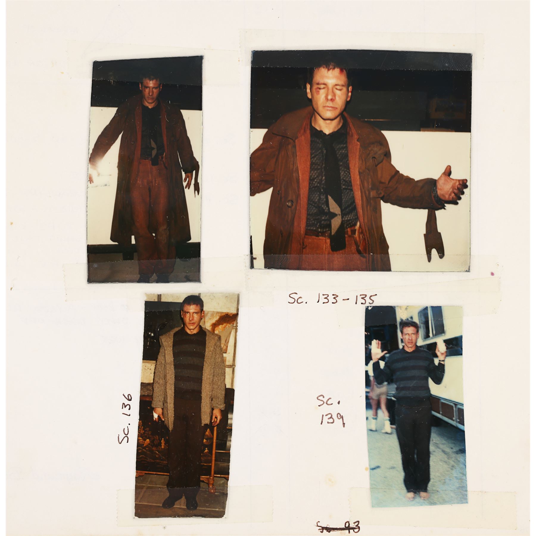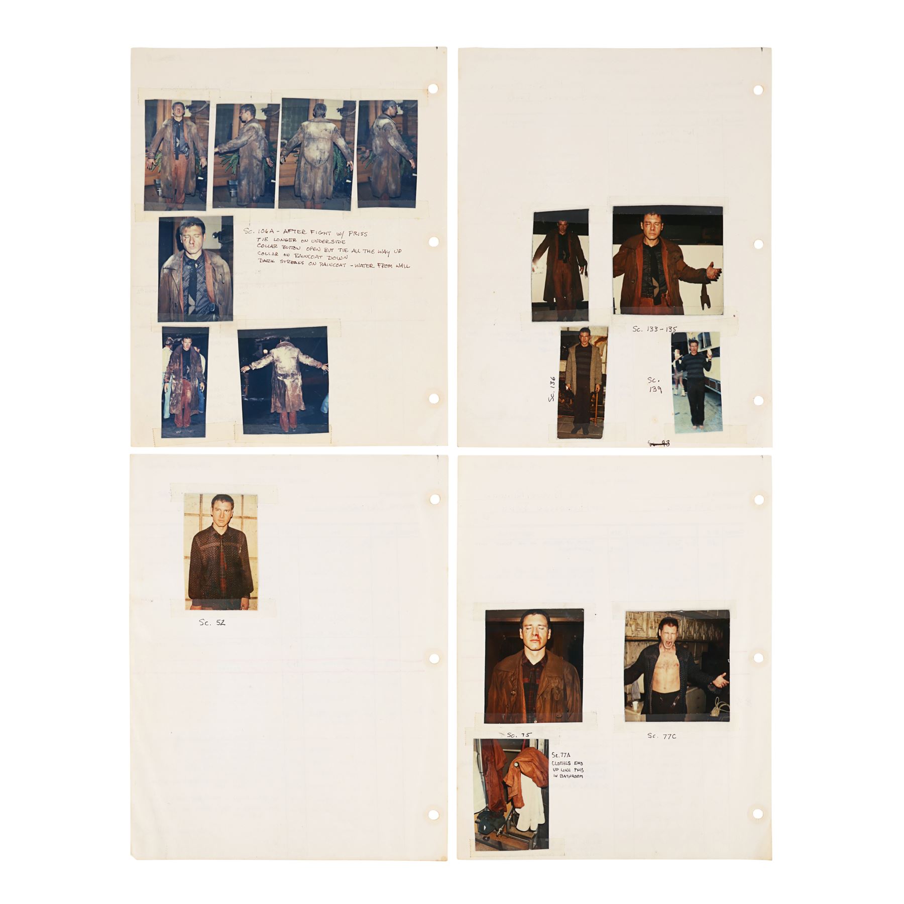 Meticulously organised, the costume bible comprises 44 pages, each contained in a plastic sleeve and bound in a blue three-ring lever-arch file. They contain detailed handwritten wardrobe descriptions corresponding to different scene numbers, in addition to several Polaroid images. There are notes for the majority of the main cast. The notes for Deckard (Harrison Ford) are particularly detailed, comprising five pages, 20 Polaroid photographs and two clothes swatches. There are also costume notes on several secondary characters, including Kaiser (John Edward Allen) and Bear (Kevin Thompson), along with sex workers, dancers, club patrons, sushi bar patrons, showgirls and street thugs. There are 117 individual photographs in total.