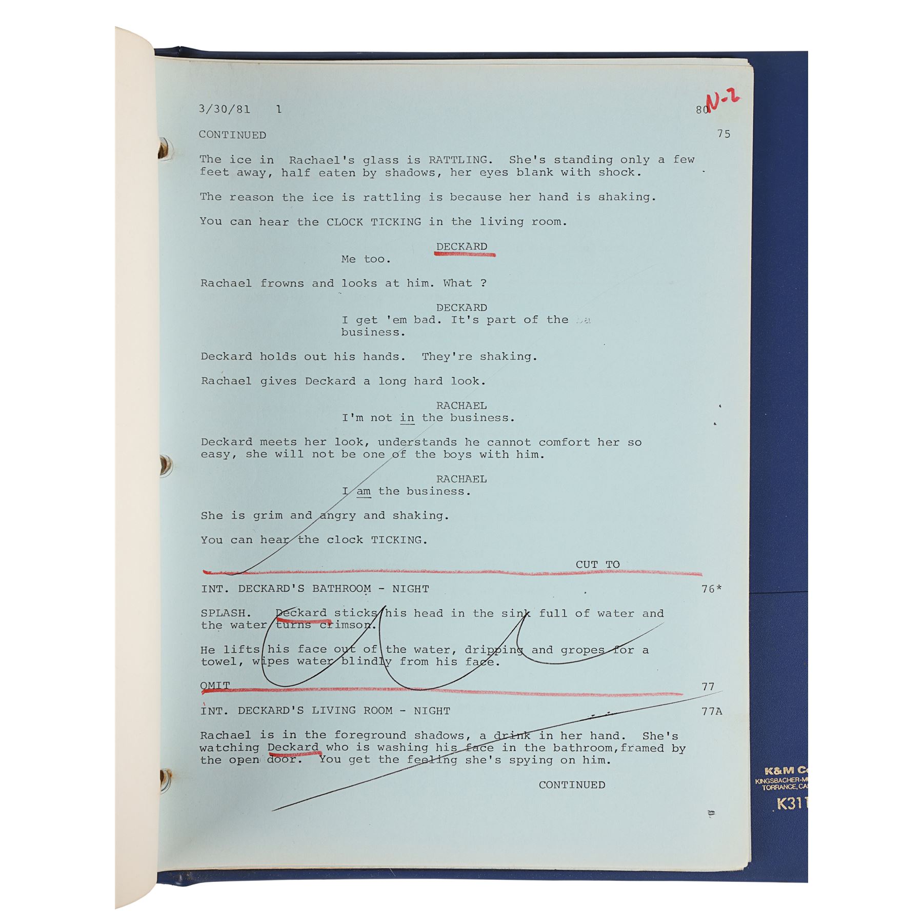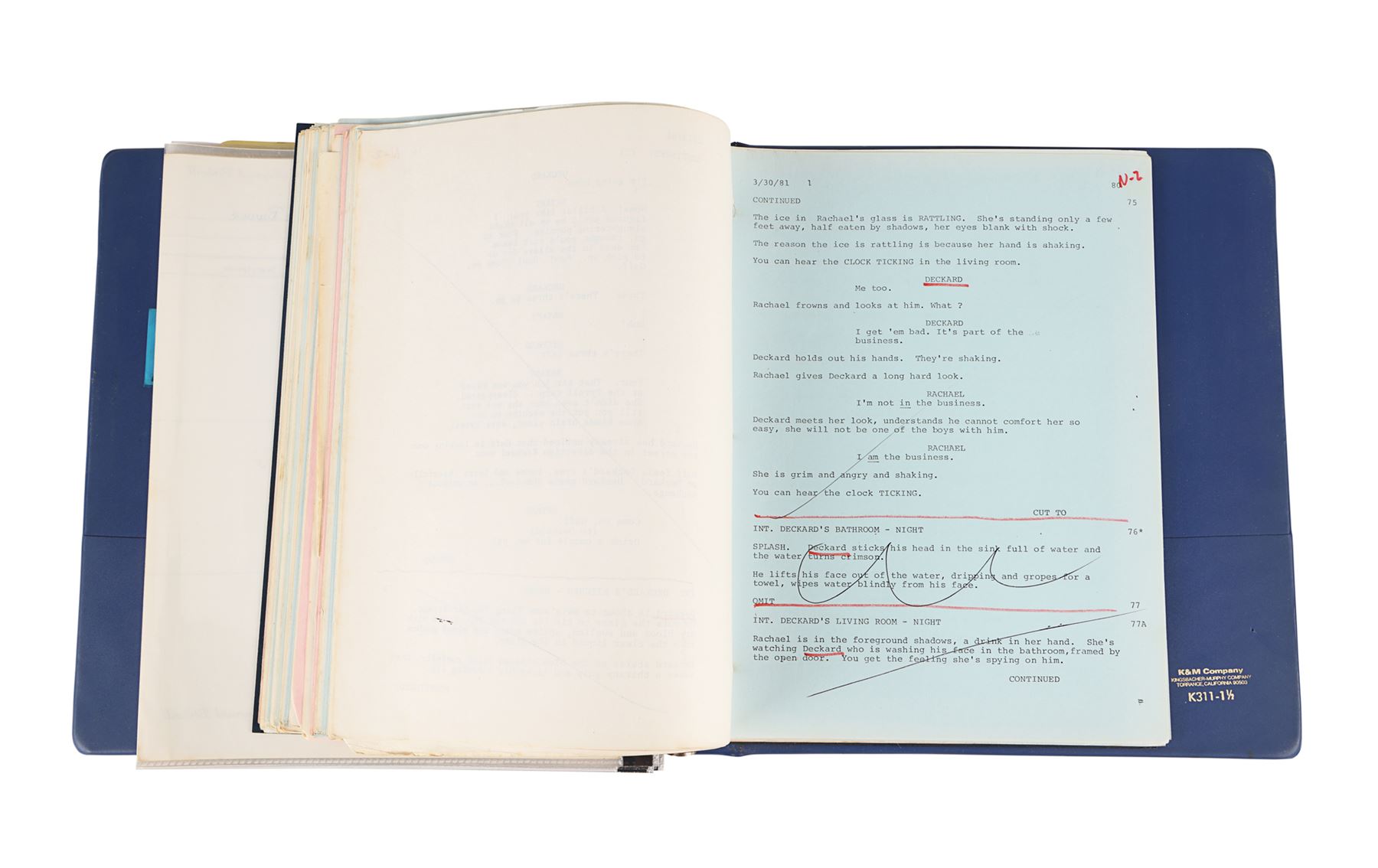 Also contained in the file is a script written by Hampton Fancher and David Peoples. It is dated "23.02.81", two weeks before principal photography commenced. Comprising 119 pages of hole-punched A4 paper, it includes white, blue, yellow and pink pages, which were coloured to keep track of amendments. Knode has underlined and annotated several passages.