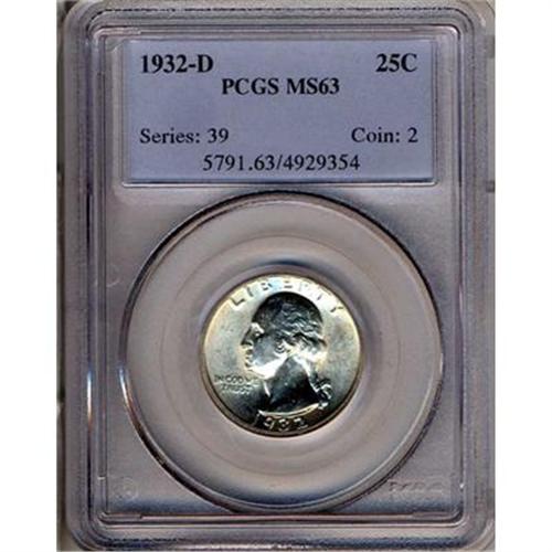 Lot 750 - 1932-D Washington Quarter Dollar PCGS MS63