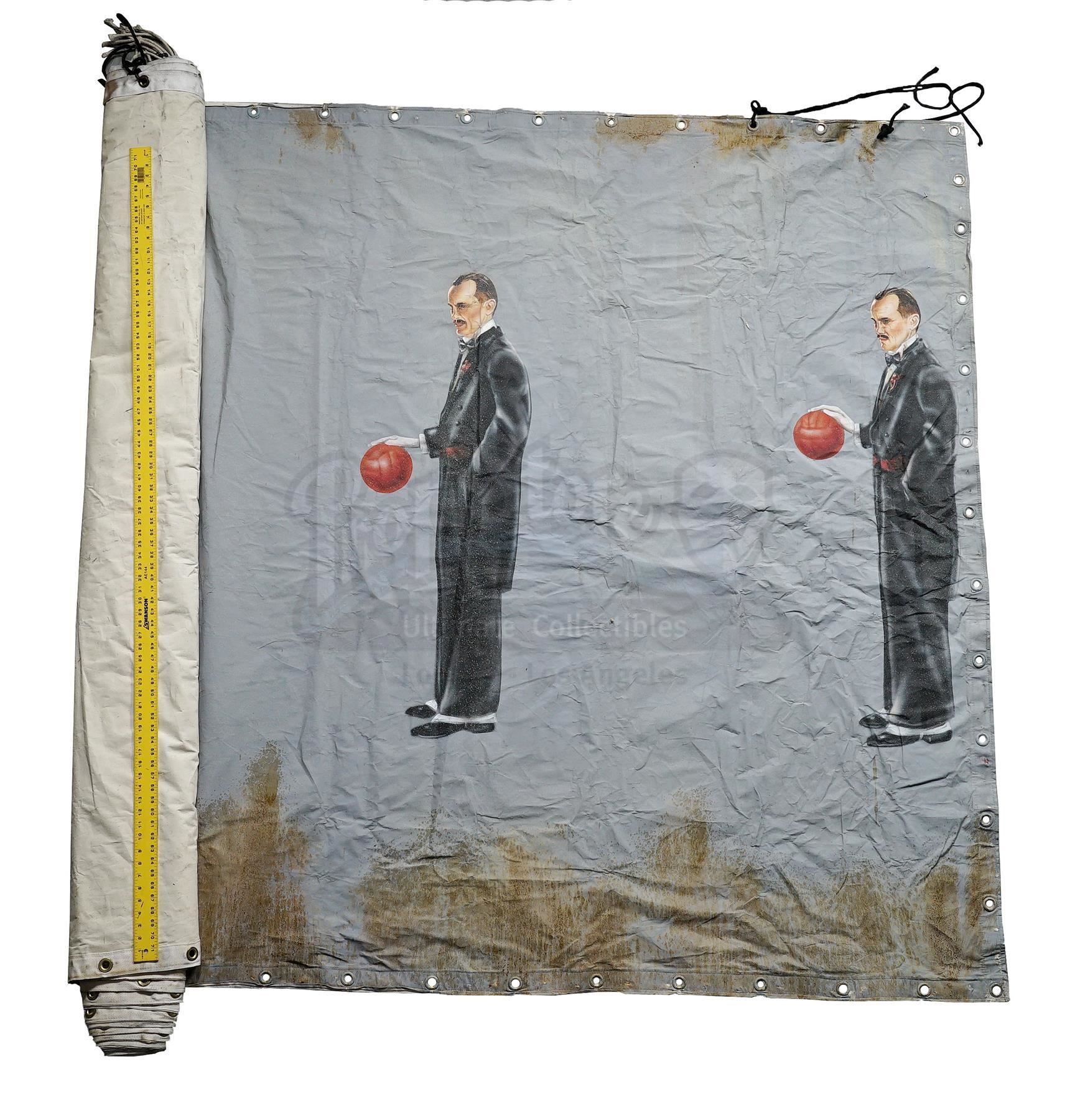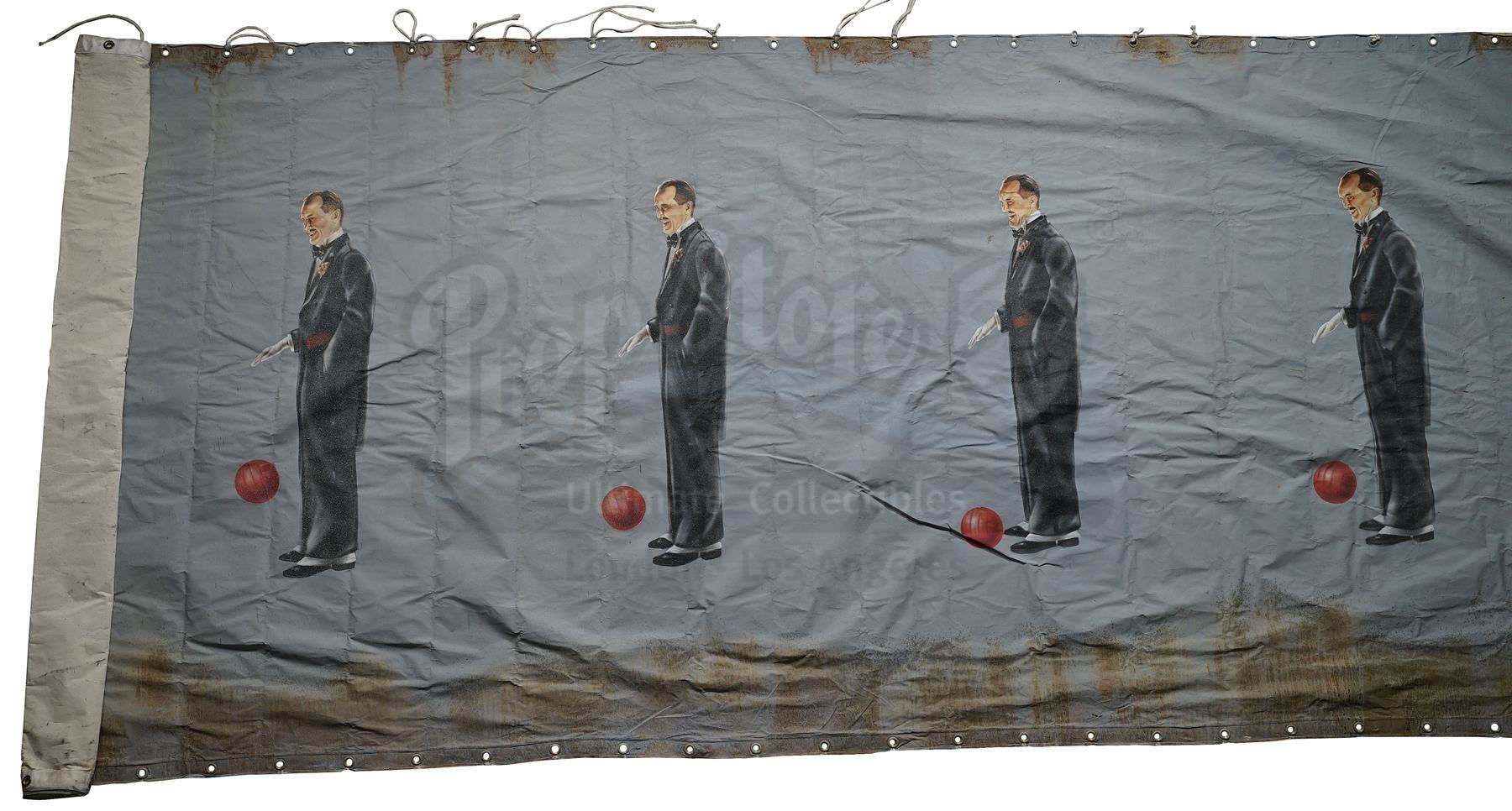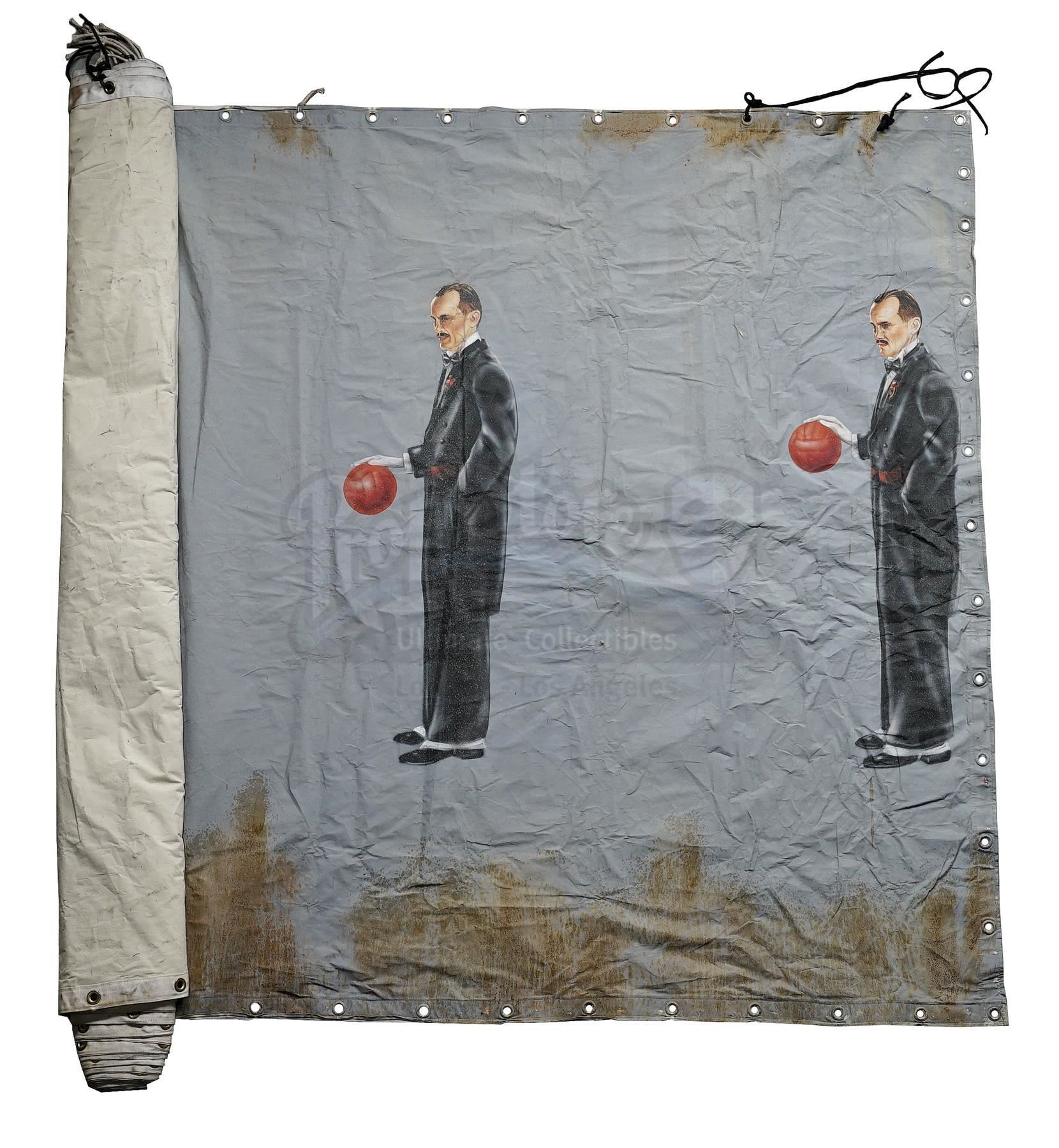 This lot will be auctioned on Wednesday, June 30th. The auction will begin at 9:00am PDT and lots are sold sequentially via live auctioneer; tune in to the live streaming broadcast on auction day to follow the pace. Note other lots in the auction may close on June 29th or July 1st. A Saturation Chamber zoetrope animation canvas from William Malone's horror film House on Haunted Hill. Dr. Vannacutt (Jeffrey Combs) tortured mental patients by imprisoning them inside his Saturation Chamber, where spinning walls were hung with a haunting zoetrope. This blue canvas with metal hanging holes looped with black string is hand-painted with repeating images of a tuxedo-clad Vannacutt bouncing a red ball. The canvas is in fair overall condition with extensive brown stains from production and creases throughout from being rolled. Dimensions (flat): 432" x 78" x 1" (1098 cm x 198 cm x 2.5 cm); (rolled): 24" x 18" x 12" (61 cm x 45.75 cm x 30.5 cm). This lot comes from the collection of renowned special effects artist Tom "Brooklyn" Bellissimo. A letter of authenticity from Bellissimo is included. Estimate: $1,500 - 2,500