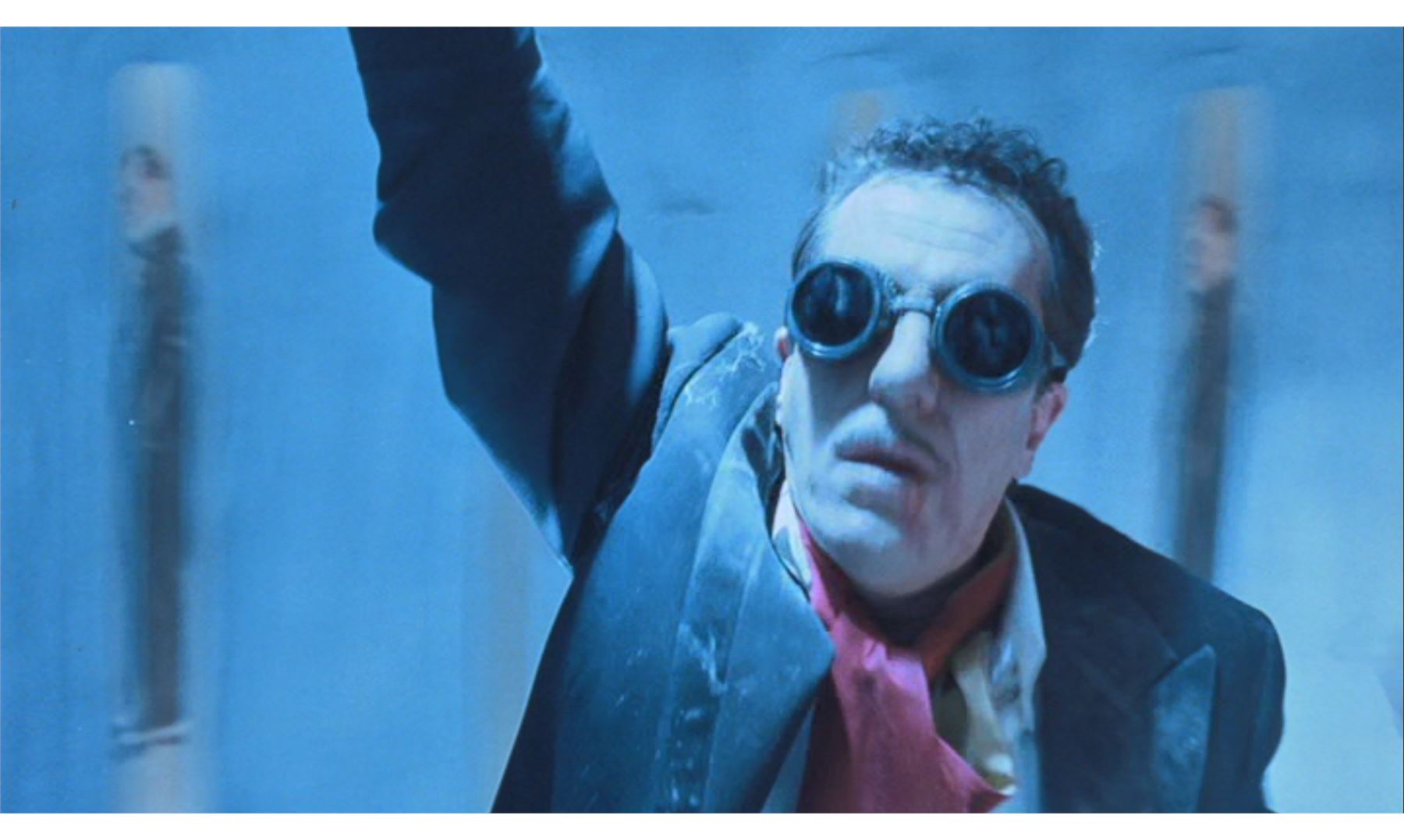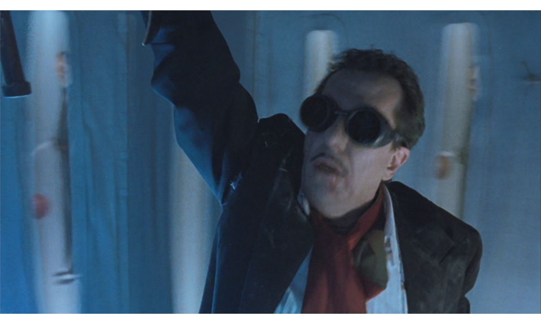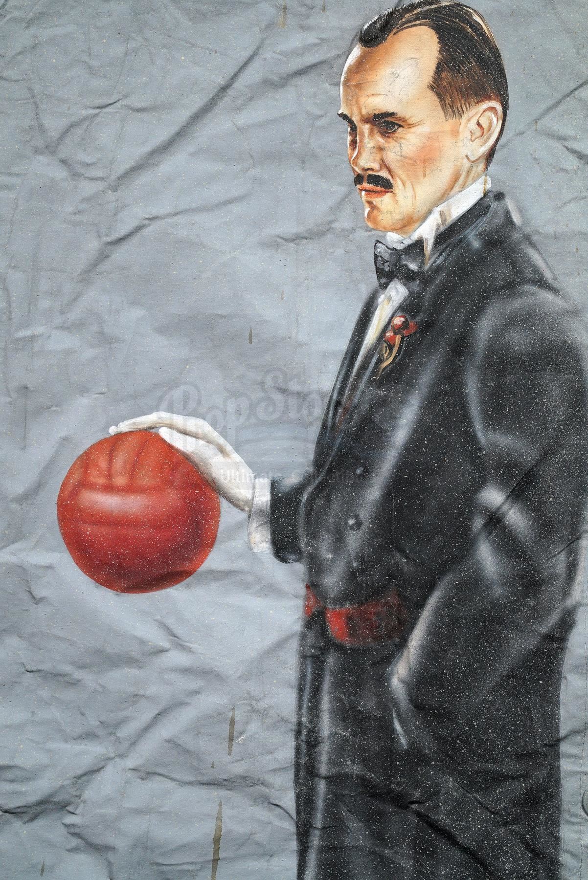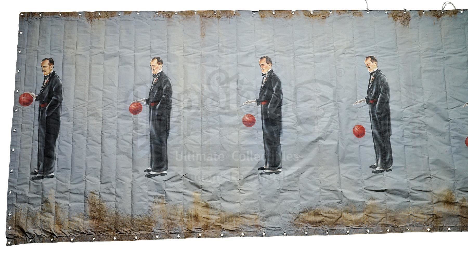 This lot will be auctioned on Wednesday, June 30th. The auction will begin at 9:00am PDT and lots are sold sequentially via live auctioneer; tune in to the live streaming broadcast on auction day to follow the pace. Note other lots in the auction may close on June 29th or July 1st. A Saturation Chamber zoetrope animation canvas from William Malone's horror film House on Haunted Hill. Dr. Vannacutt (Jeffrey Combs) tortured mental patients by imprisoning them inside his Saturation Chamber, where spinning walls were hung with a haunting zoetrope. This blue canvas with metal hanging holes looped with black string is hand-painted with repeating images of a tuxedo-clad Vannacutt bouncing a red ball. The canvas is in fair overall condition with extensive brown stains from production and creases throughout from being rolled. Dimensions (flat): 432" x 78" x 1" (1098 cm x 198 cm x 2.5 cm); (rolled): 24" x 18" x 12" (61 cm x 45.75 cm x 30.5 cm). This lot comes from the collection of renowned special effects artist Tom "Brooklyn" Bellissimo. A letter of authenticity from Bellissimo is included. Estimate: $1,500 - 2,500