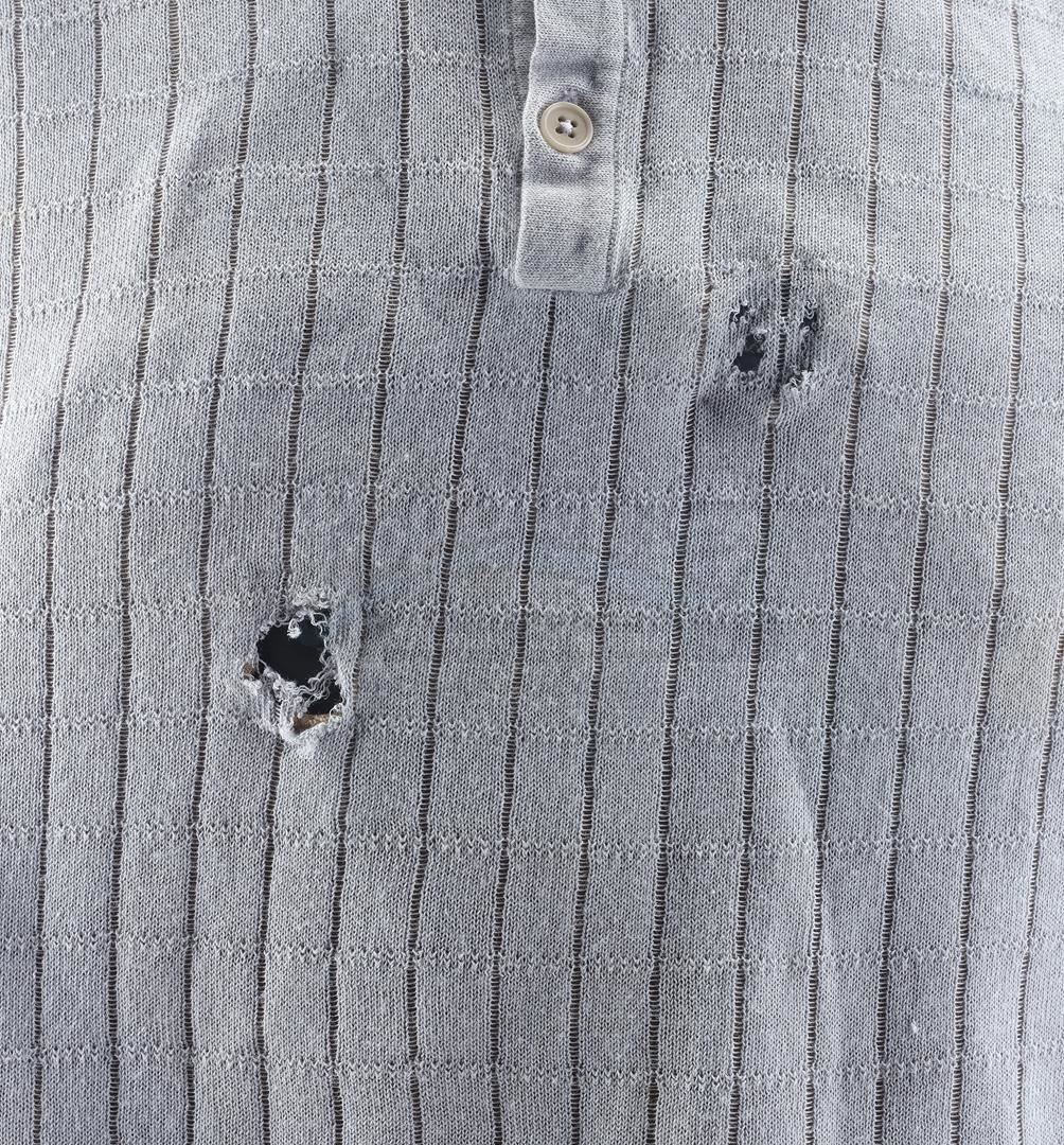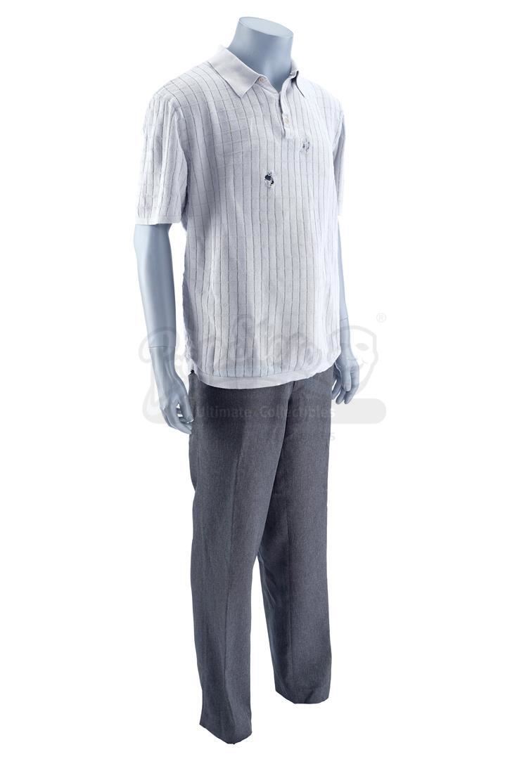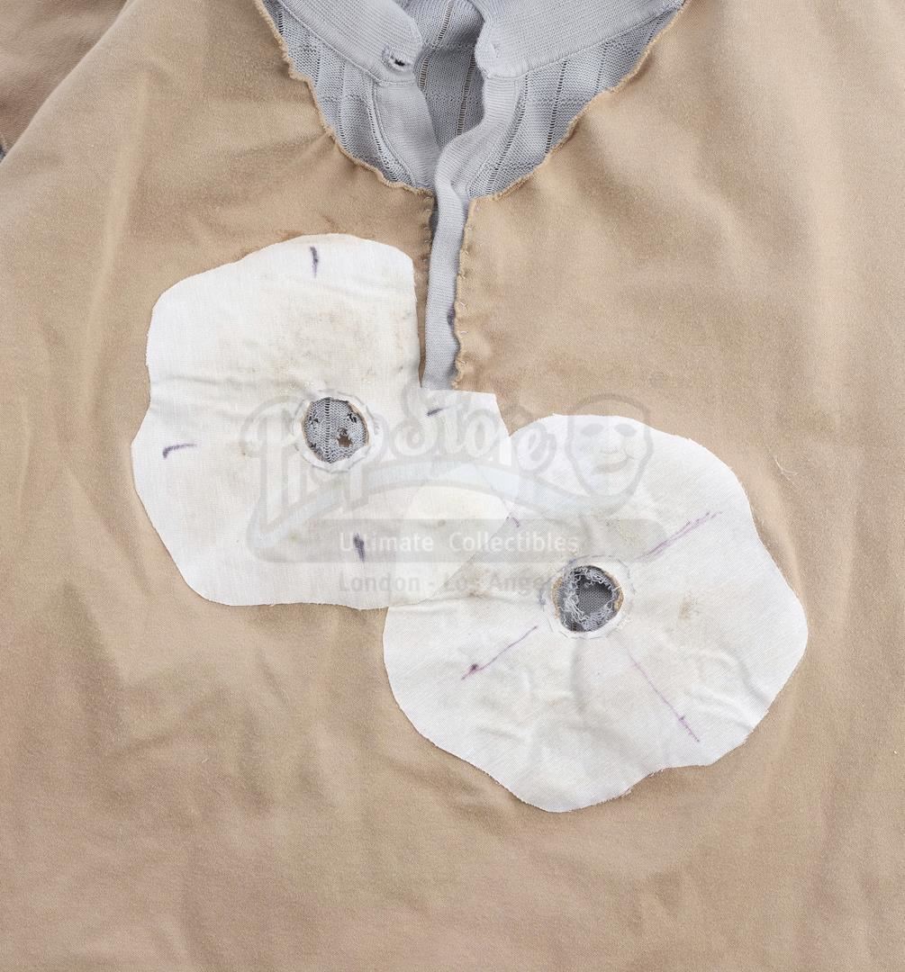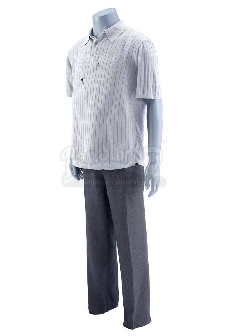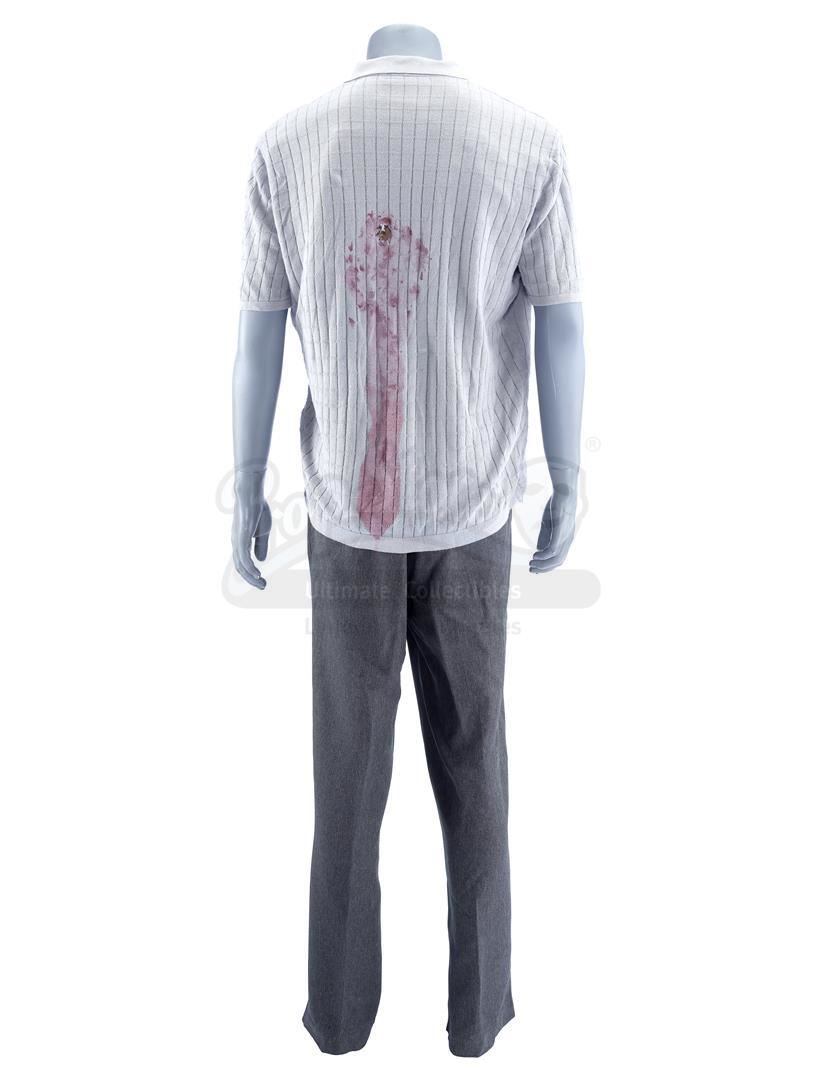 This lot will be auctioned on Wednesday, June 30th. The auction will begin at 9:00am PDT and lots are sold sequentially via live auctioneer; tune in to the live streaming broadcast on auction day to follow the pace. Note other lots in the auction may close on June 29th or July 1st. Rhodes' (Ray Liotta) bloodied, bullet-riddled shirt and pants from James Mangold's psychological thriller Identity. Escaped convict Rhodes wore his costume during his climactic shootout with fellow hotel guest Ed Dakota (John Cusack). This costume consists of a blood-stained gray striped cotton polo shirt with squib padding on the interior, circular accents for the bullet holes, a pair of dark gray wool blend pants, and a Columbia Pictures Certificate of Authenticity. This lot shows wear due to age and use including two production-added bullet holes on the front of the shirt as well as one bullet hole and blood added to the back, but it remains in good overall condition. Estimate: $600 - 800