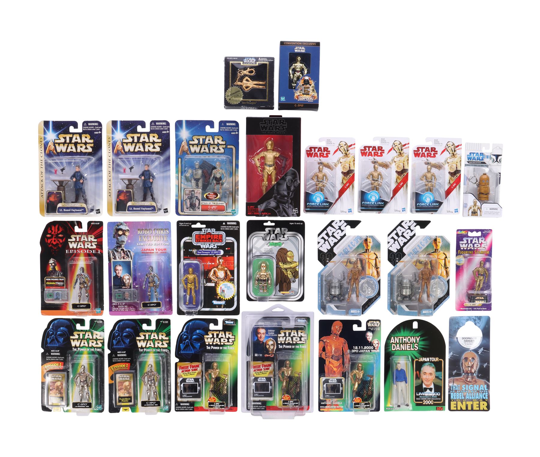 A collection of assorted action figures, some of which are convention exclusives and modern merchandise from the promotion of the Star Wars saga. The lot includes eighteen C-3PO figures; two Dannl Faytonni figures, a fan-made custom Anthony Daniels figure; two C-3PO keychains and a C-3PO doorknob hanger. Daniels made a cameo as the character Dannl Faytonni in Attack of the Clones during the Outlander Club sequence and reprised the role in Revenge of the Sith. Each figure is housed in its original bubble on a punched card back. Some of the figure cardbacks exhibit minor wear and creasing. Dimensions (largest): 26.5 cm x 17.5 cm x 7 cm (10 1/2" x 7" x 2 3/4")
