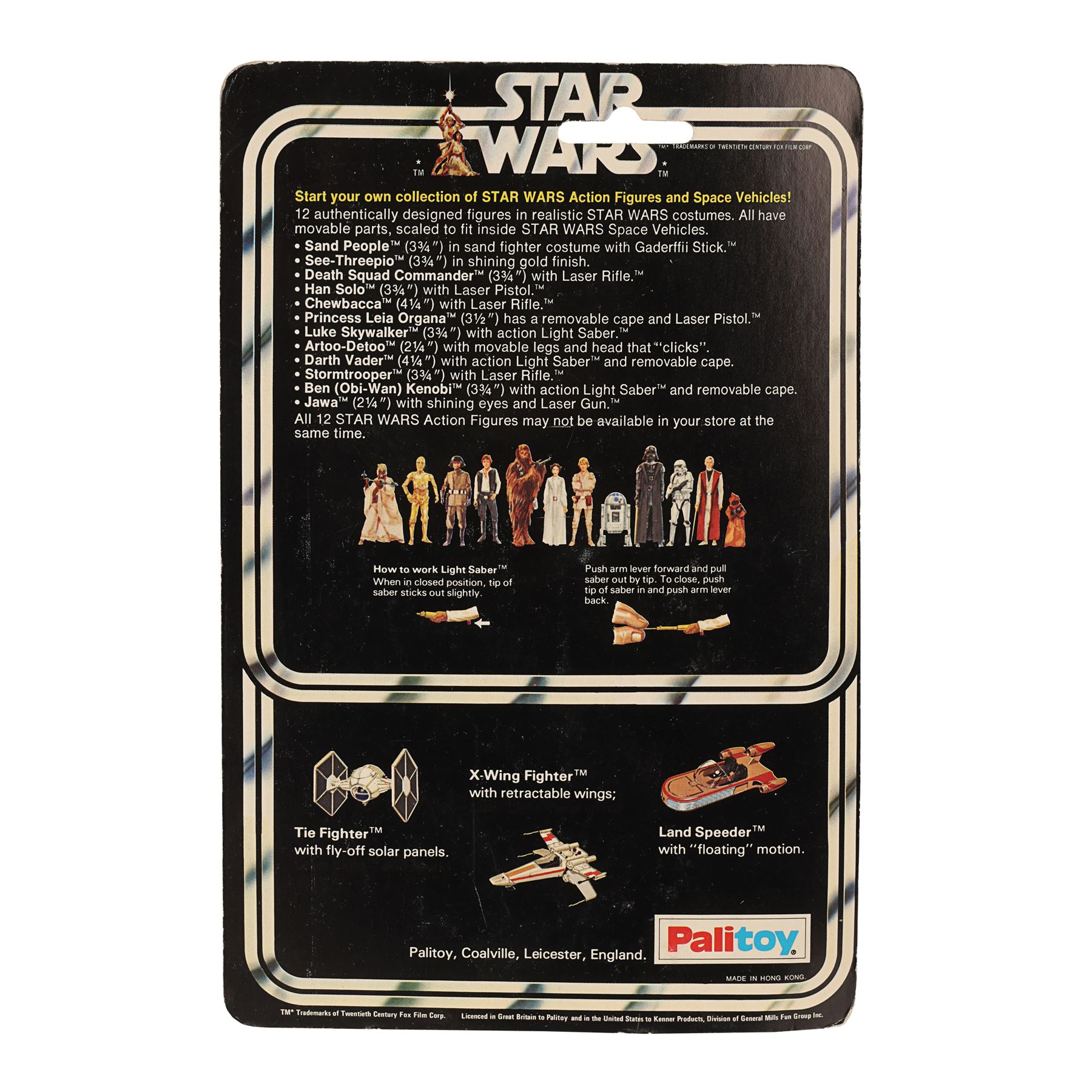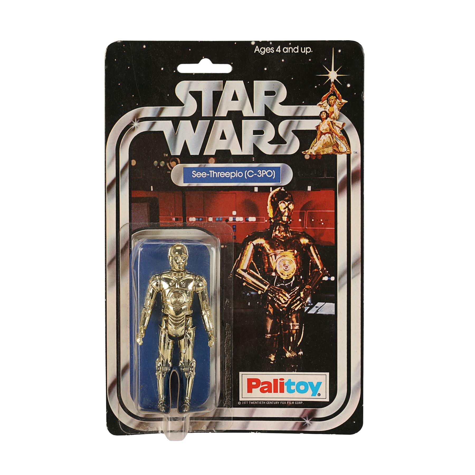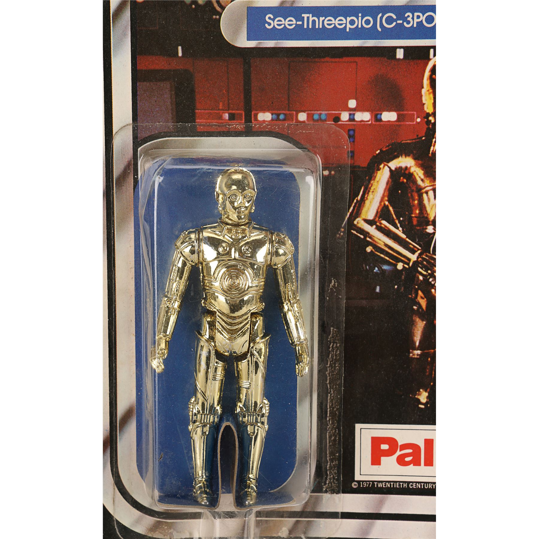 A C-3PO Palitoy action figure from the promotion of George Lucas' Star Wars: A New Hope. This figure of the protocol droid was released in 1978 as one of the original 12 Star Wars action figures and displays C-3PO's signature shiny gold finish. The Palitoy figure is housed in its original bubble on a punched SW12B card back. There are signs of light edge wear, and the glue has dried on one side of the bubble, causing it to become loose. Care should be taken when handling the lot. Dimensions: 23 cm x 15 cm x 2 cm (9" x 6" x 3/4")
