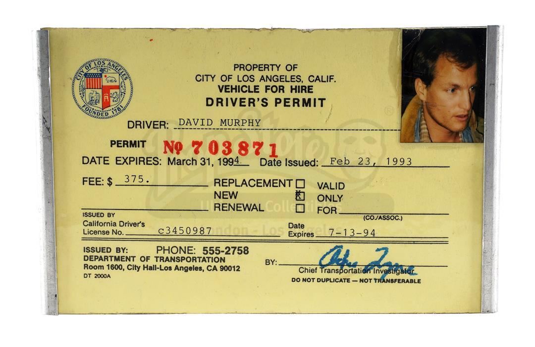This lot will be auctioned on Wednesday, June 30th. The auction will begin at 9:00am PDT and lots are sold sequentially via live auctioneer; tune in to the live streaming broadcast on auction day to follow the pace. Note other lots in the auction may close on June 29th or July 1st. John Gage's (Robert Redford) and David Murphy's (Woody Harrelson) accessories from Adrian Lyne's drama Indecent Proposal. Gage wore his watch when he met architect David and his wife Diana (Demi Moore). Later, David found Gage's business card in Diana's wallet next to a photo of the couple. Murphy drove his vintage car throughout the film. This set consists of a metal and leather John Gage wristwatch; cardstock "J.G." business cards; a wallet-sized color photograph of the Murphys; two metal California license plates; a metal-framed "David Murphy" Driver's Permit; and a posterboard and metal-framed paper architect's license. It exhibits signs of production use throughout, but remains in good overall condition. Dimensions (largest): 11.5" x 9" (29.25 cm x 23 cm); (smallest): 2" x 2" (5 cm x 5 cm) Estimate: $2,000 - 3,000