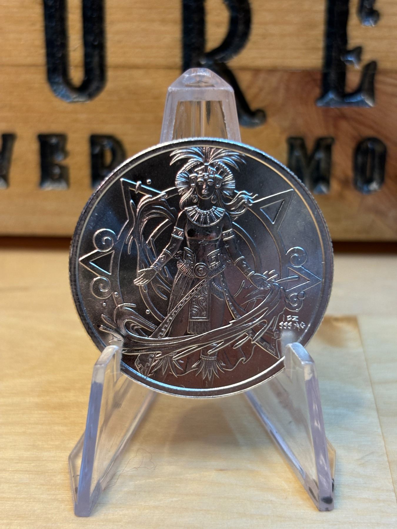 The 1 oz Aztec Goddess Silver Round is a 1-ounce silver round made from 99.9% pure silver. It typically features a detailed design inspired by Aztec mythology, showcasing an Aztec goddess or a representation of an important female deity from Aztec culture, such as Coatlicue or Tlazolteotl. These rounds are highly collectible due to their unique and culturally rich design, as well as their silver content. They are popular among both silver investors and collectors who are interested in ancient civilizations and mythological themes.