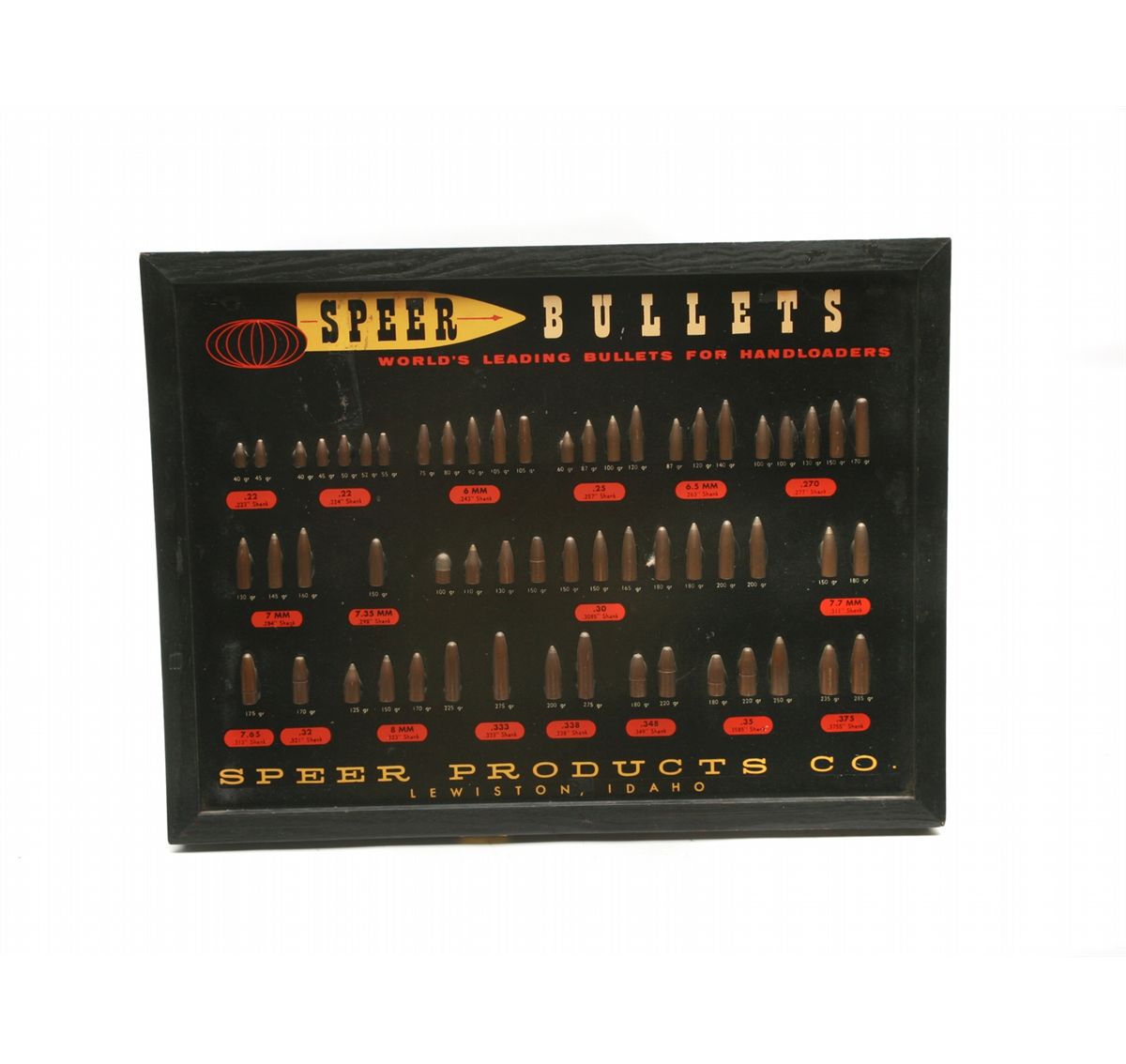 Framed vintage Speer Bullets display board - black wood frame & background with 1961 catalog page on back - features 57 asst'd handgun & rifle bullets from .22 caliber to .375 caliber - complete display with no missing bullets - 16" x 12" framed size - ready to hang - very good condition - non-ffl - 25VVFKIL063