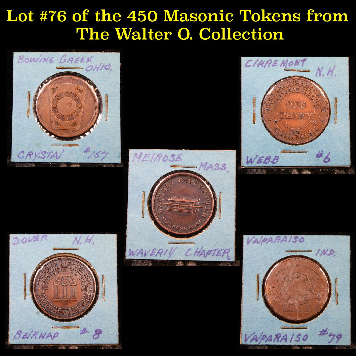 Lot #76 of the 450 Masonic Tokens from The Walter O. Collection. We Recently received a very Large Collection of 450 Masonic Tokens and coins. This collection was one man’s hobby for over 40 years. He collected each and every one with care and attention to detail and variety. Some of them are amazing and incredibly rare and highly sought by collectors and Masons. Here is a Brief Overview : Masonic coins often raise many questions for those looking to better understand the significance of the coins themselves as well as the symbolism represented in their imagery. In fraternal culture as a whole, symbolism has always been a significant part of these organizations’ identity, especially in Freemasonry, as Masonic coins are rich with symbolism, reflecting different events and characteristics of Freemasonry that give them the priceless value they hold. There are several varieties of masonic coins and tokens, and all tokens will fall into one of the following categories: a token celebrating a particular mason, lodge or event; an initiation token showing when a Brother was initiated, passed and raised; and finally the mark mason token (or penny) which signifies a pivotal part of a Mason’s initiation. Because symbolism was so important to fraternal culture, these small coins are rife with meaning. The most ubiquitous representation of the Masons was the letter "G" surrounded by a compass and square, representing the holy geometry of God. Some tokens feature the letters "H.T.W.S.S.T.K.S.," which means "Hiram the Widow's Son Sent to King Solomon," the biblical story that must be acted out to reach the third, or Master's Degree, in Freemasonry. Additionally, many contain either Apron and gloves: These symbols stand for living with a pure heart and to keep one’s hands clean. All-seeing eye: This symbol is designed to remind Masons that God and others always see their thoughts and actions. Ashlars: You may see rough and smooth ashlars on Masonic coins. They are to remind Masons of the contrast between man’s natural state and perfection and the Level: This symbol found on some Masonic coins reminds Masons that everyone is equal before God. We have broken the set up into groups of 5 Tokens in each lot. We have put 5 Lots per night over the 18 Nights of the Spring Auctions.