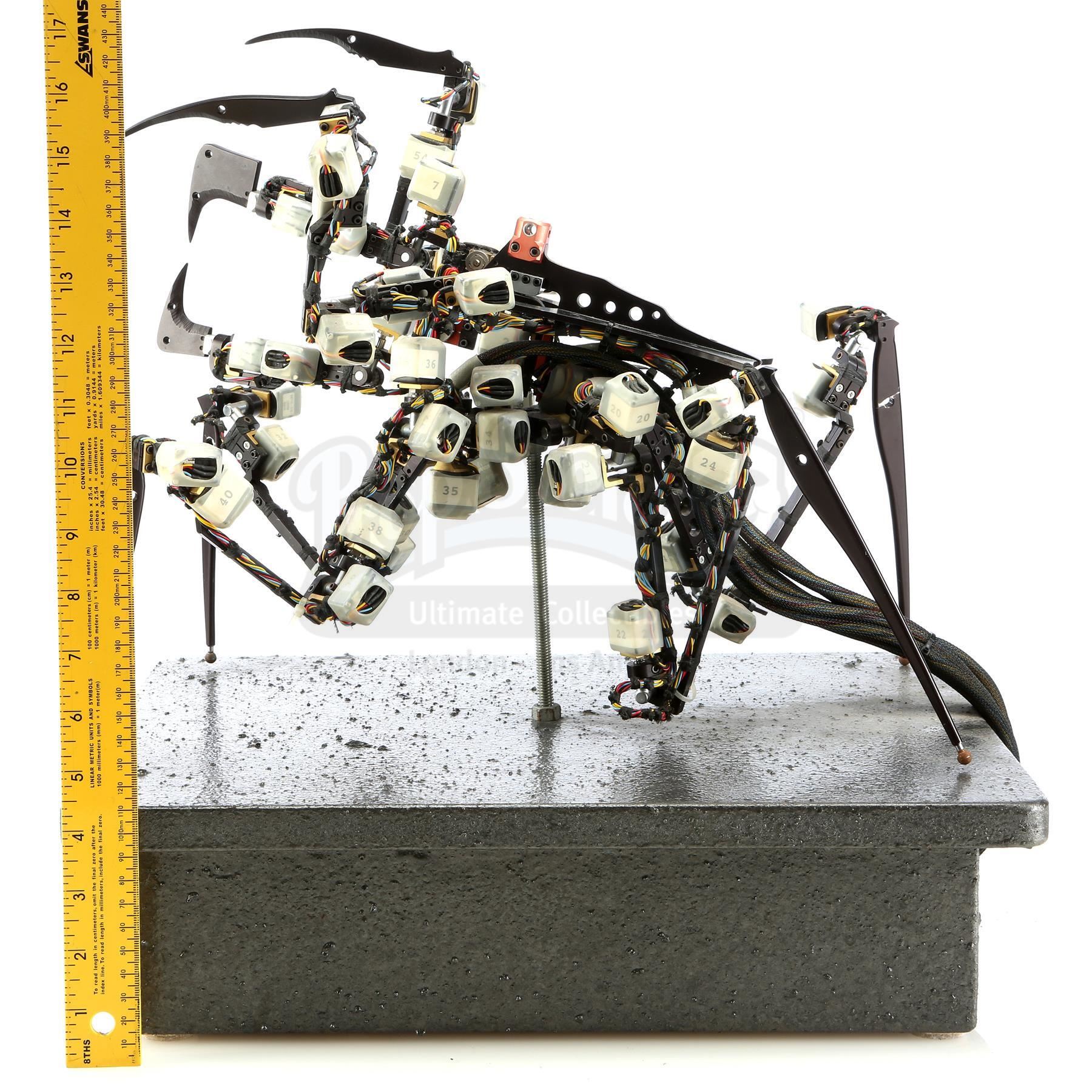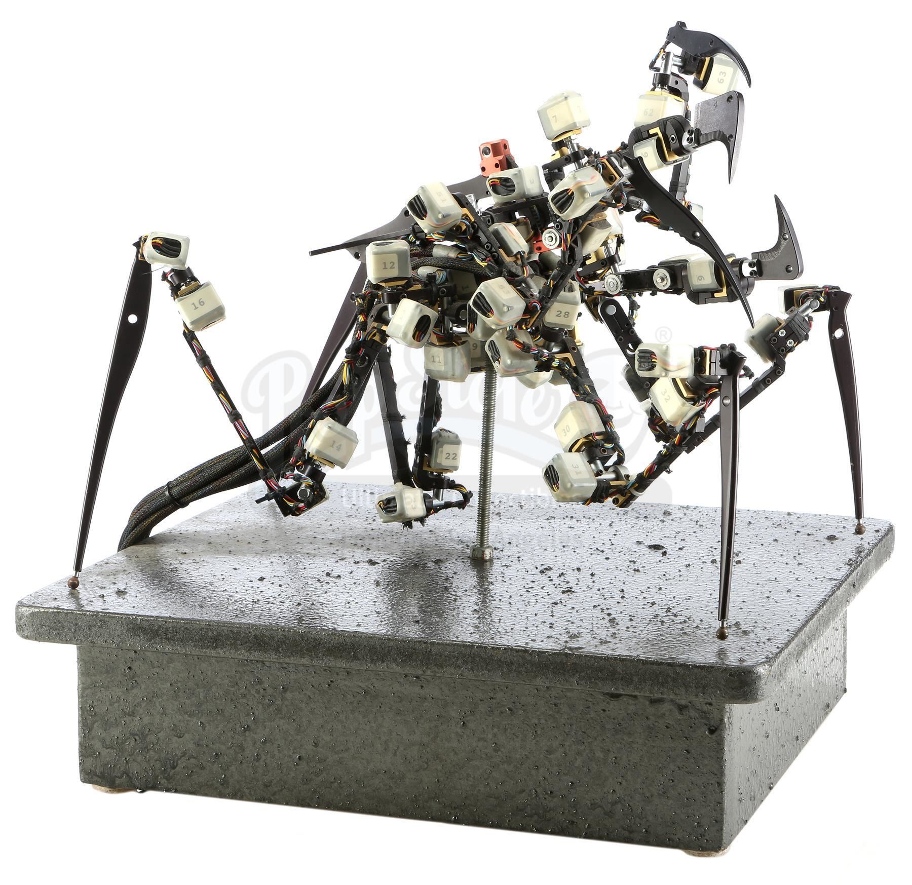 This Warrior Bug D.I.D. features a metal and cast resin armature hand-painted chrometone, wired throughout with numbered motion sensors, and mounted with a steel pole to a wood display base painted gray. It exhibits minor signs of use, such as miscellaneous paint stains throughout, but remains in excellent overall condition. Includes a letter of authenticity from Phil Tippett.