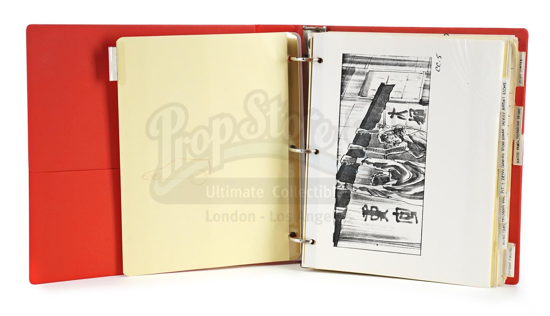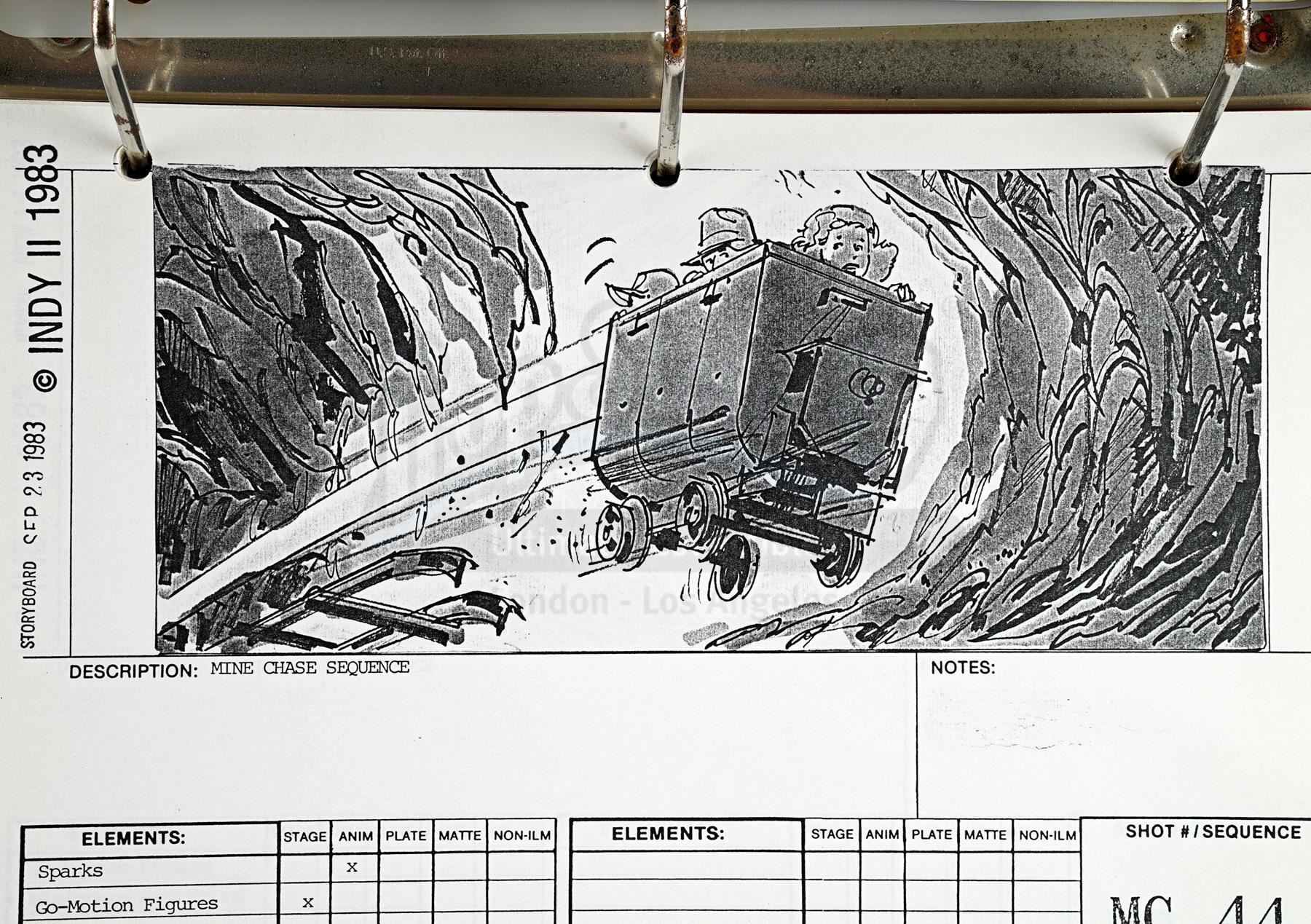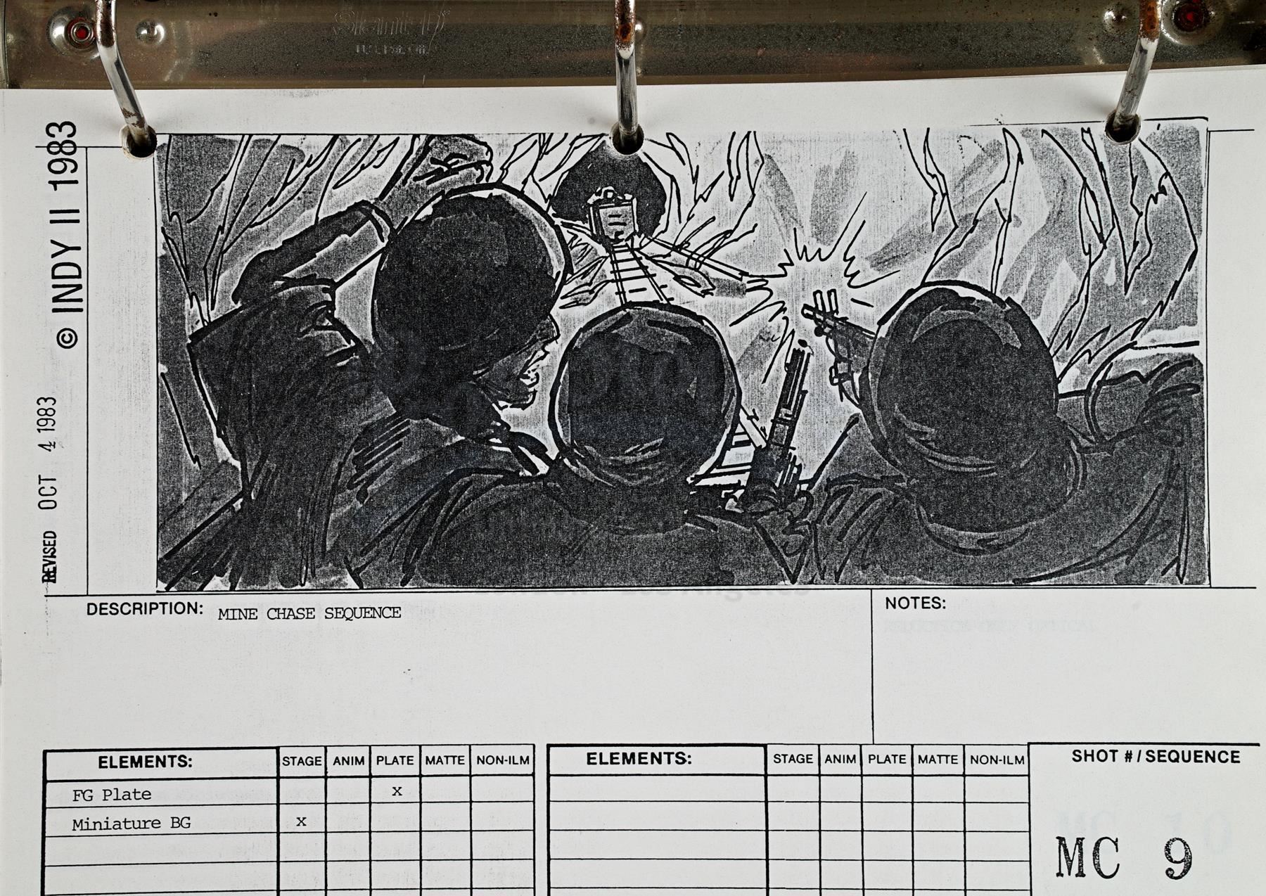 This lot will be auctioned on Wednesday, June 30th. The auction will begin at 9:00am PDT and lots are sold sequentially via live auctioneer; tune in to the live streaming broadcast on auction day to follow the pace. Note other lots in the auction may close on June 29th or July 1st. A set of production-used storyboards from Steven Spielberg's adventure sequel Indiana Jones and the Temple of Doom. Jones (Harrison Ford) and friends were tasked with retrieving three mystical stones in 1935 India. This red plastic three-ring binder contains 140 printed images of storyboards, each on their own sheet of paper. Divided by scene, it features images from twelve action sequences including the mine chase and bridge confrontation. Several storyboards feature handwritten notes. It exhibits signs of use and wear, but remains in good overall condition. Dimensions: 11.5" x 11" x .5" (29.25 cm x 28 cm x 6.5 cm) Sold without copyright; see notice in the Buyer's Guide. Estimate: $1,500 - 2,500