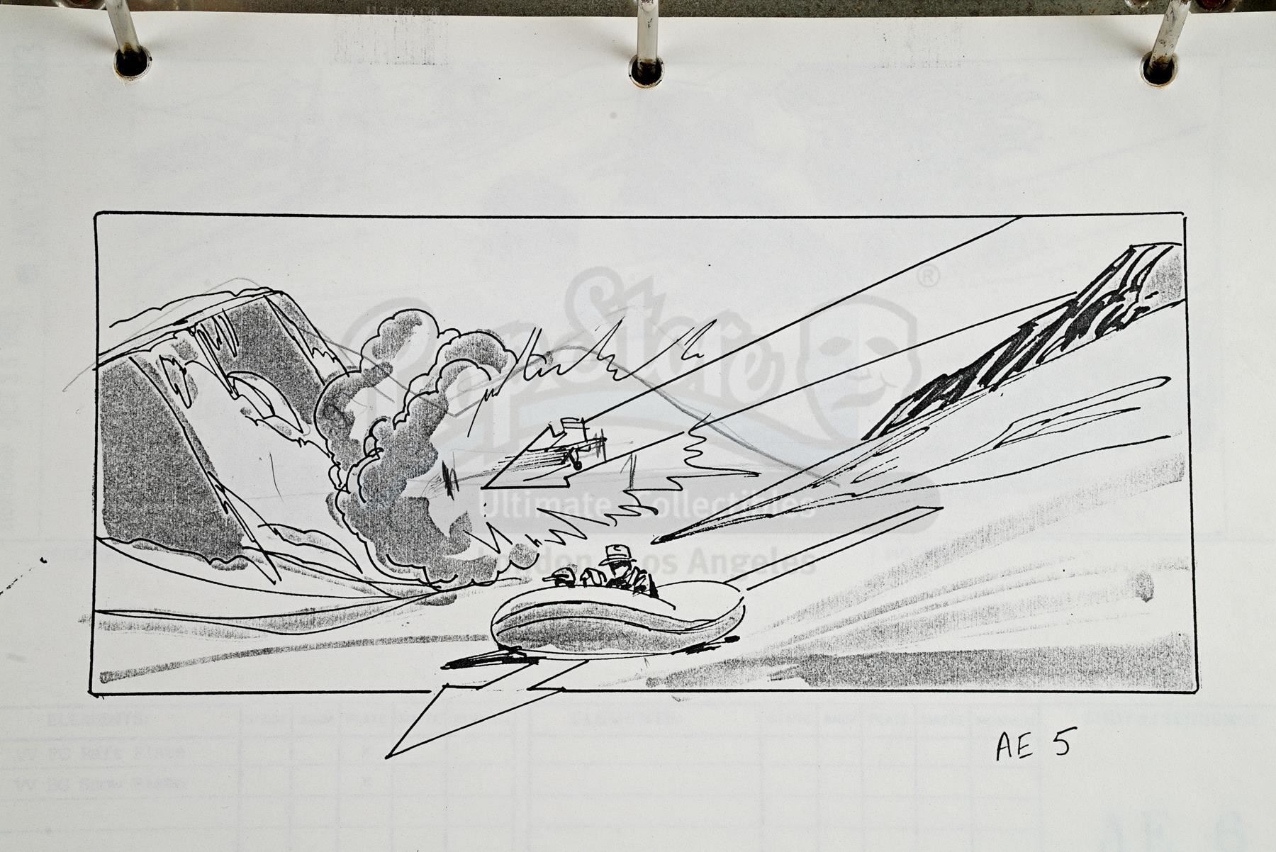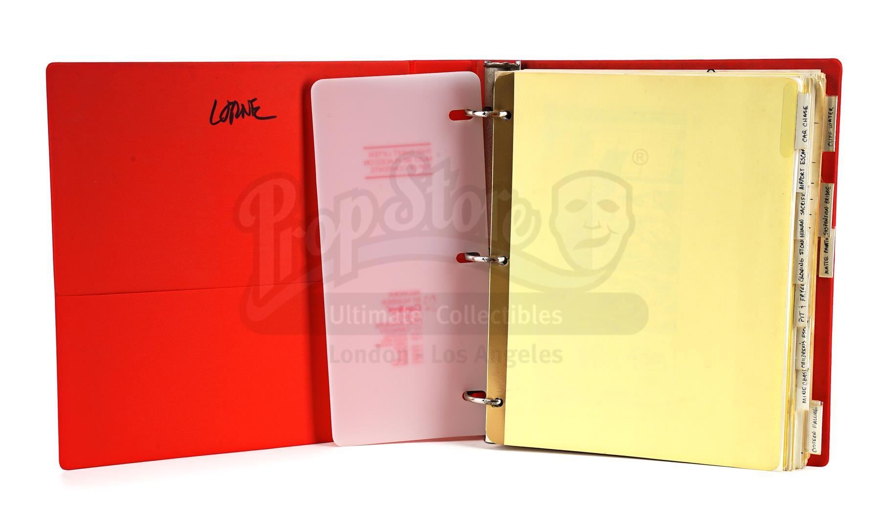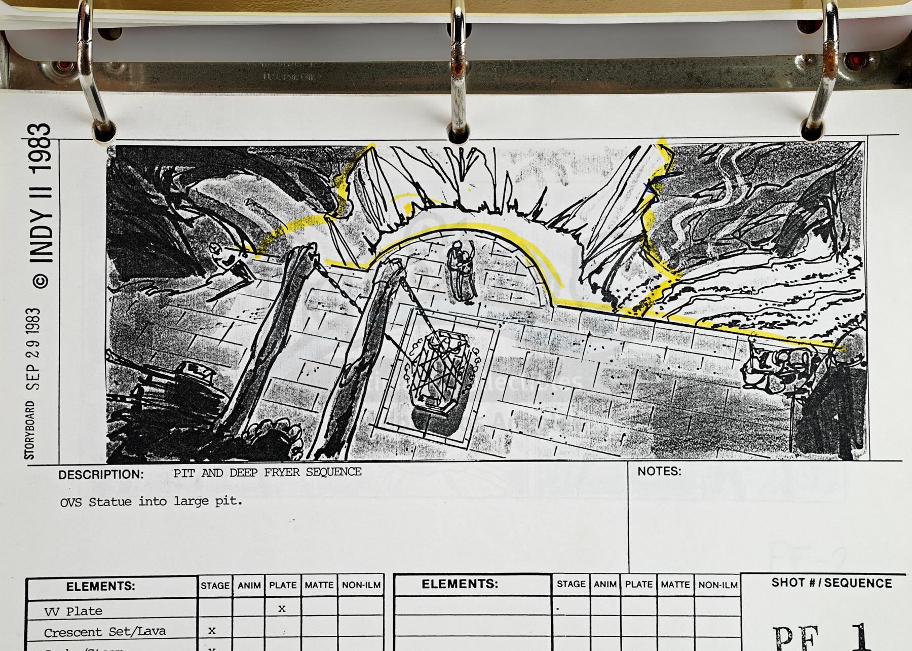 This lot will be auctioned on Wednesday, June 30th. The auction will begin at 9:00am PDT and lots are sold sequentially via live auctioneer; tune in to the live streaming broadcast on auction day to follow the pace. Note other lots in the auction may close on June 29th or July 1st. A set of production-used storyboards from Steven Spielberg's adventure sequel Indiana Jones and the Temple of Doom. Jones (Harrison Ford) and friends were tasked with retrieving three mystical stones in 1935 India. This red plastic three-ring binder contains 140 printed images of storyboards, each on their own sheet of paper. Divided by scene, it features images from twelve action sequences including the mine chase and bridge confrontation. Several storyboards feature handwritten notes. It exhibits signs of use and wear, but remains in good overall condition. Dimensions: 11.5" x 11" x .5" (29.25 cm x 28 cm x 6.5 cm) Sold without copyright; see notice in the Buyer's Guide. Estimate: $1,500 - 2,500