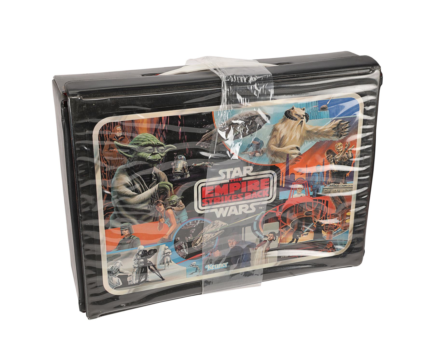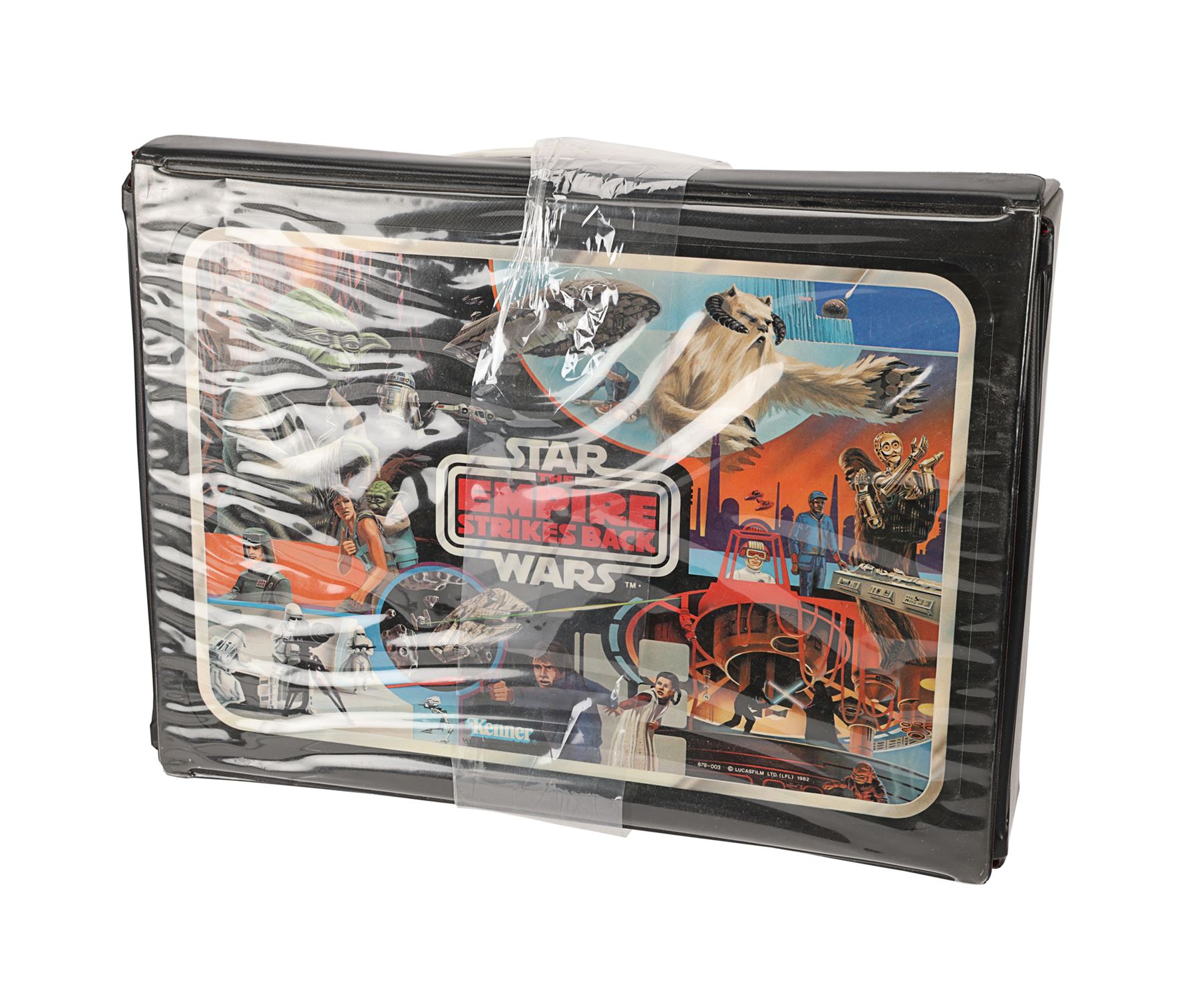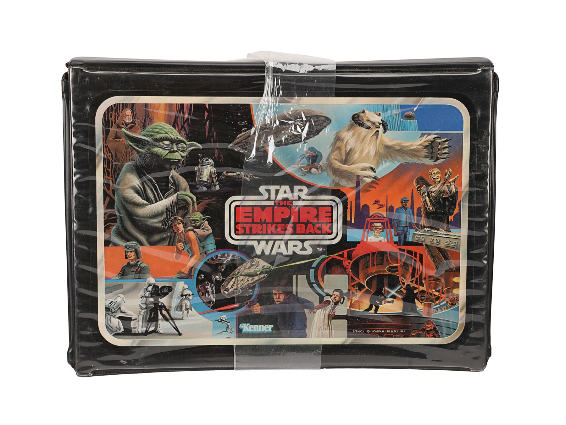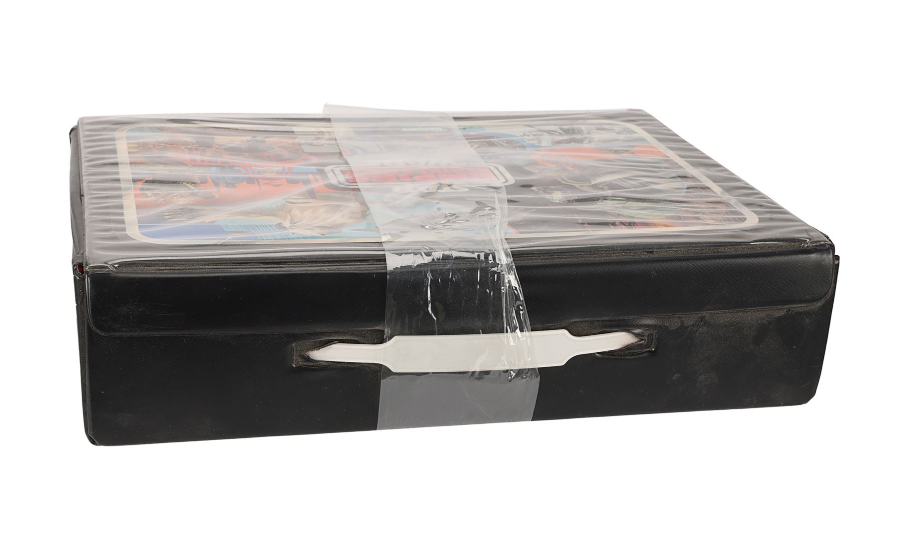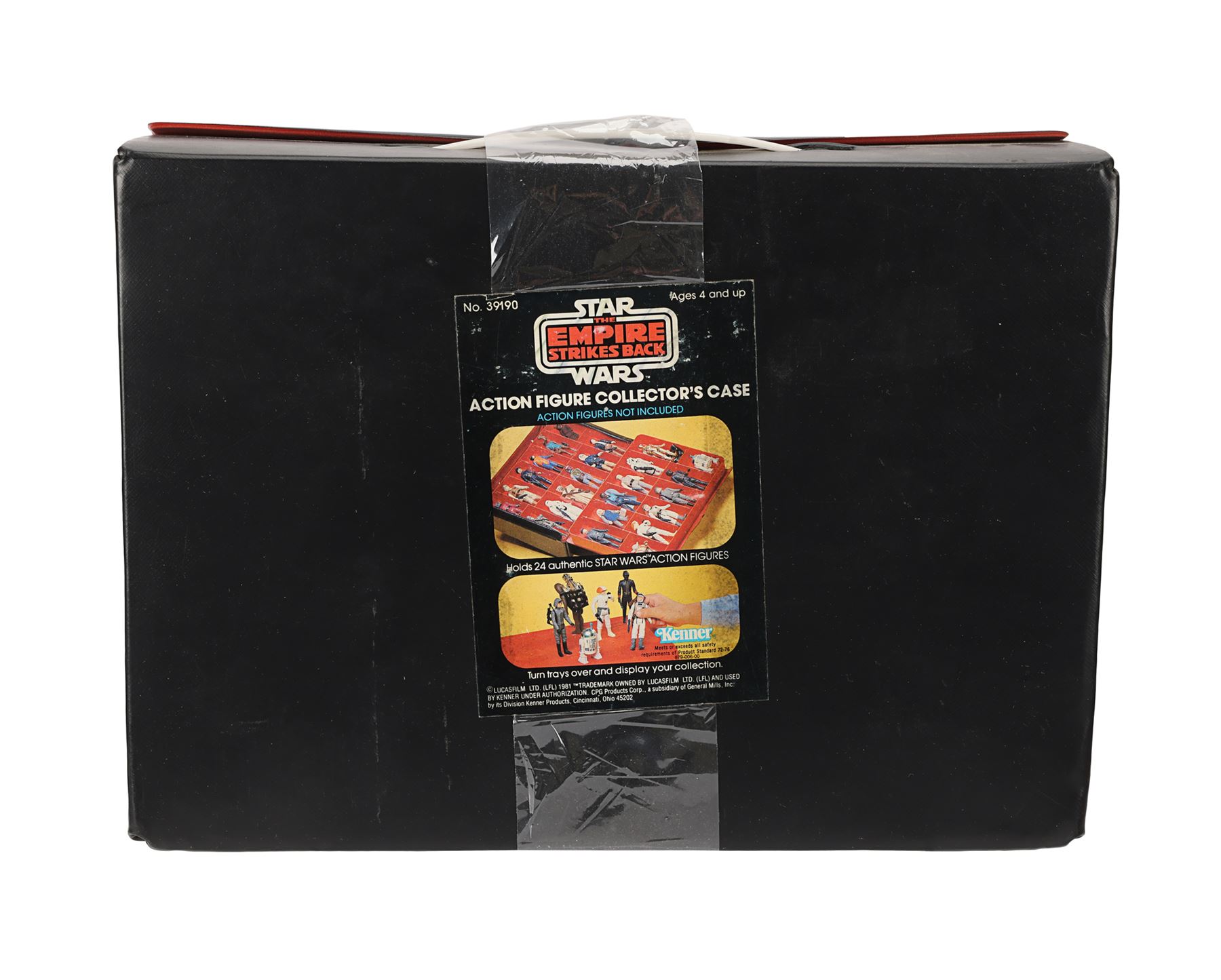 An action figure collector's case from the promotion of Irvin Kershner's Star Wars: The Empire Strikes Back. This vinyl storage case was released in 1982 and was the second to be distributed by Kenner with updated poster-like artwork on the lid. A sticker on the back demonstrates that the case can hold up to 24 action figures and how they can be displayed. The case remains sealed and displays minor dust remnants from storage. Dimensions: 23 cm x 31 cm x 7.5 cm (9" x 12 1/4" x 3")