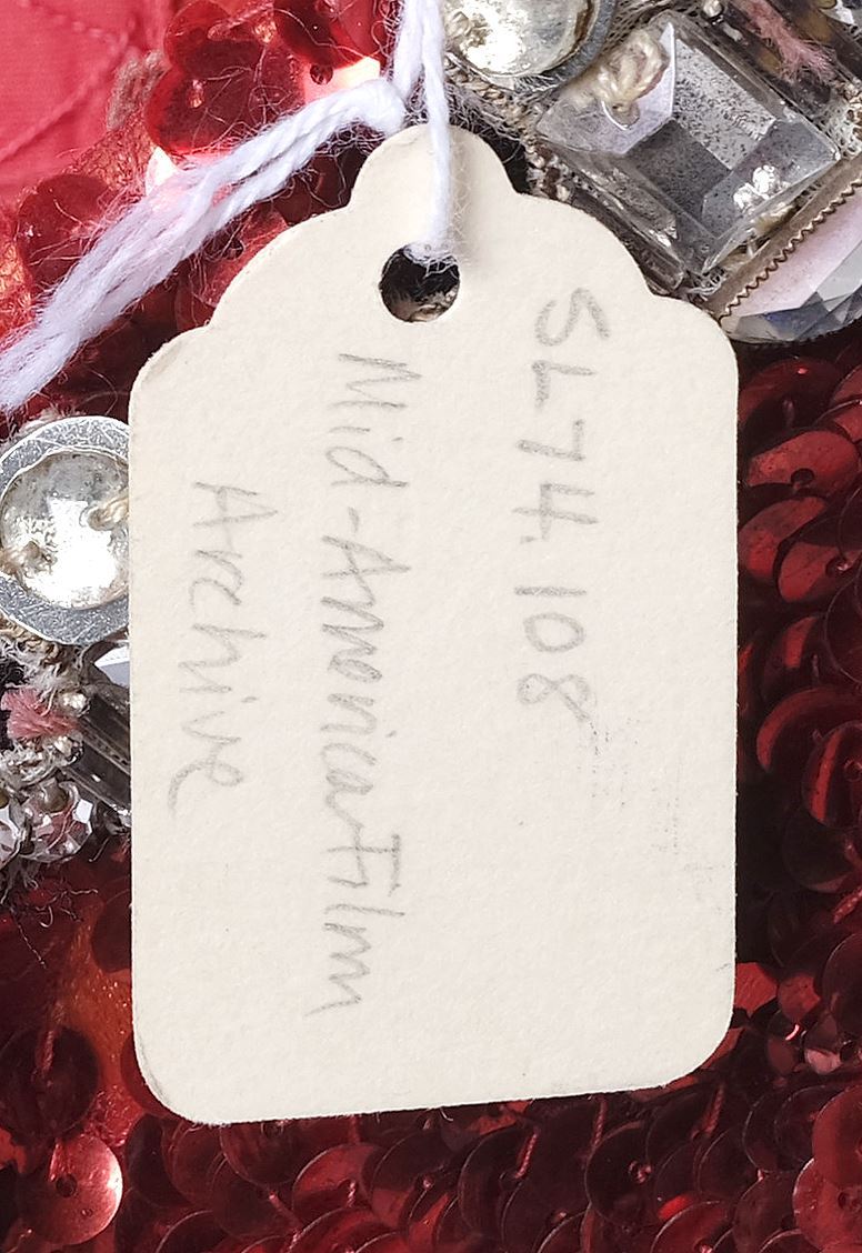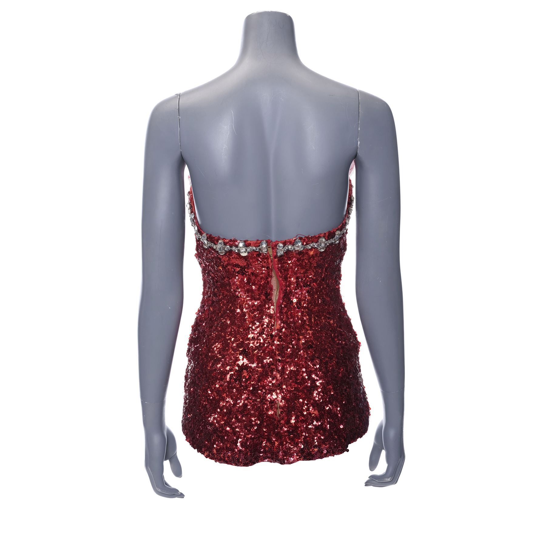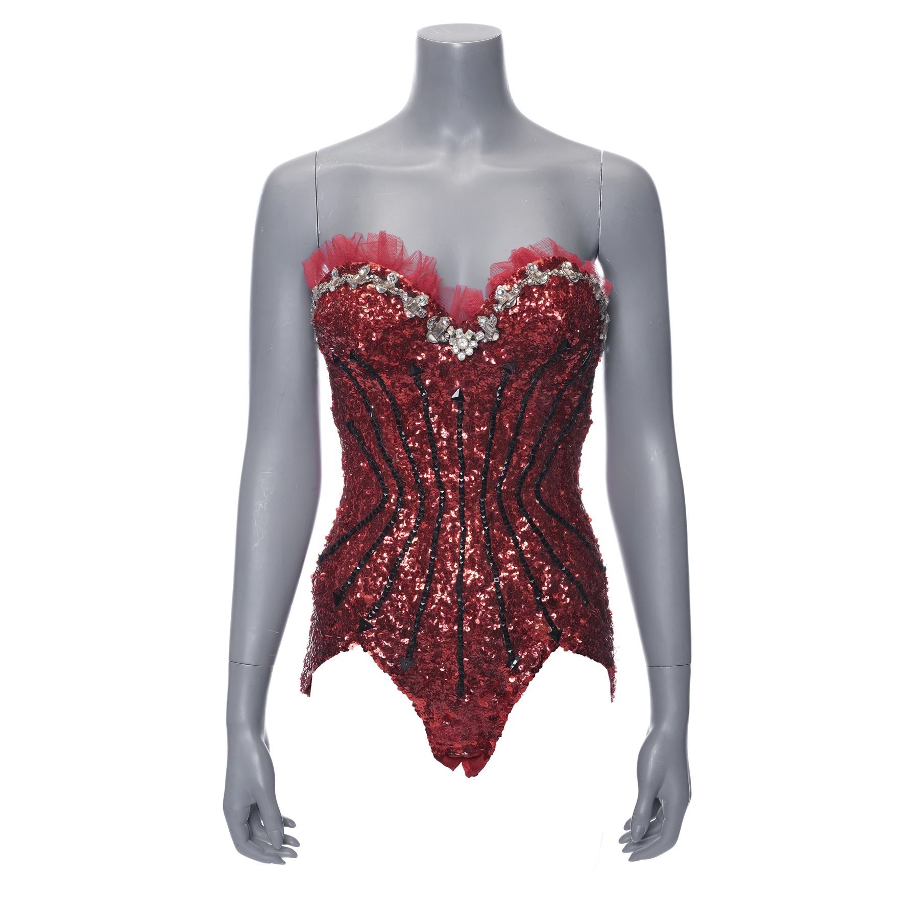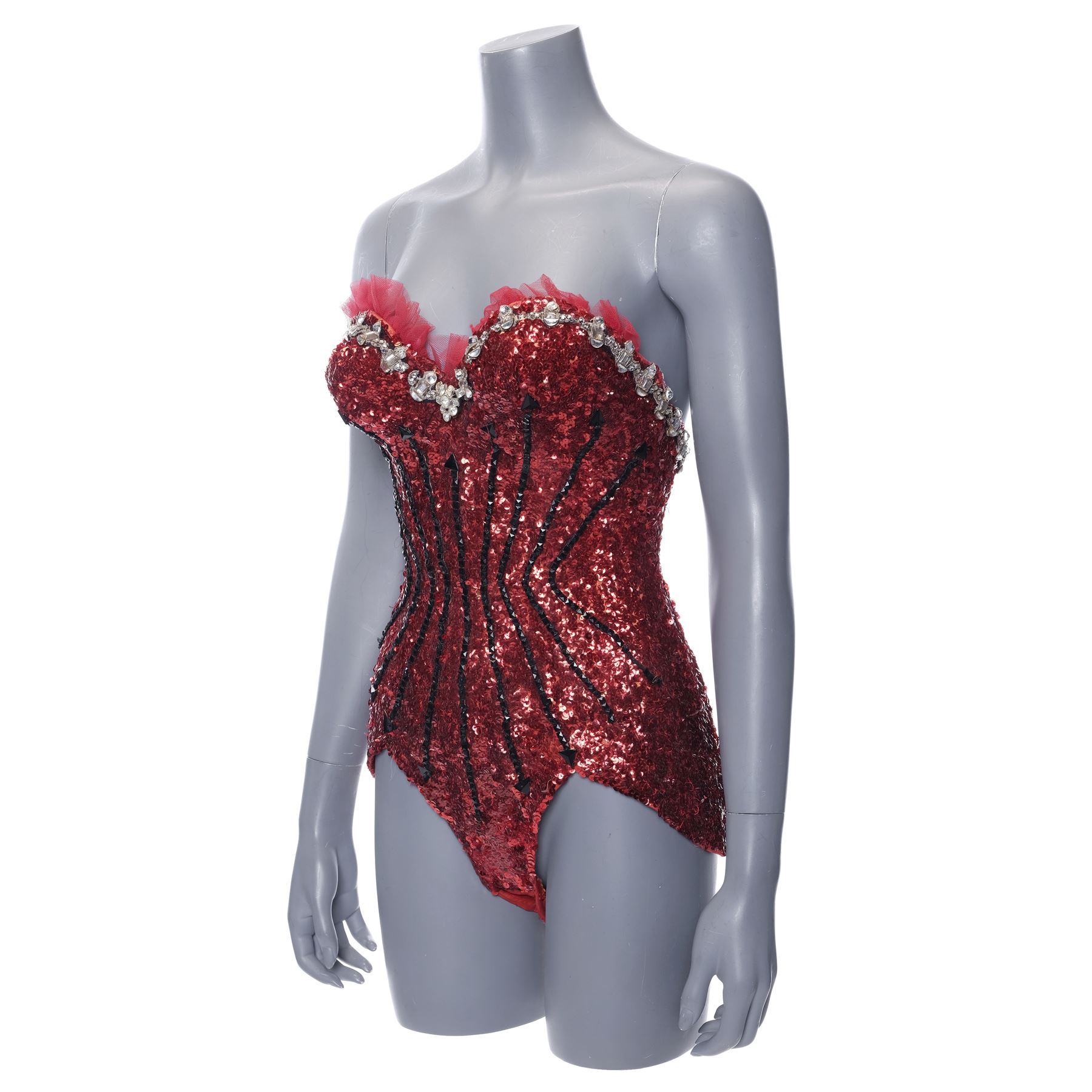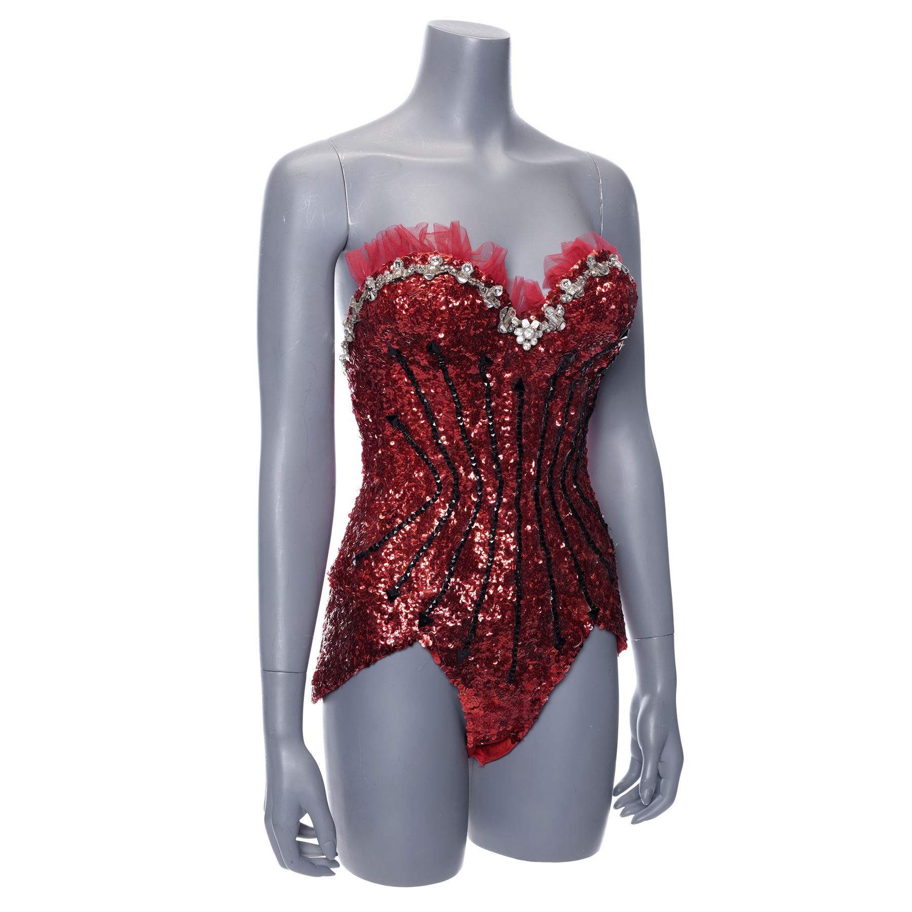 Designed by Michael Wolfe, this red leotard features red sequins, a red tulle trim, black metal studs, clear acrylic rhinestones, boning, and a zipper closure. Included are three exhibition booklets in English and French; one 18-page booklet from The Costume Institute, one 48-page booklet from the Whitworth Gallery at the University of Manchester, and one 15-page booklet from Hollywood Au Marais. This leotard exhibits loose threads, discolored rhinestones, tape residue, and a torn groin.