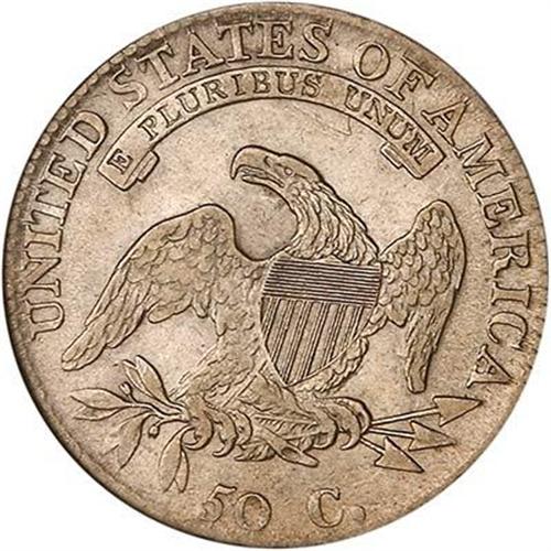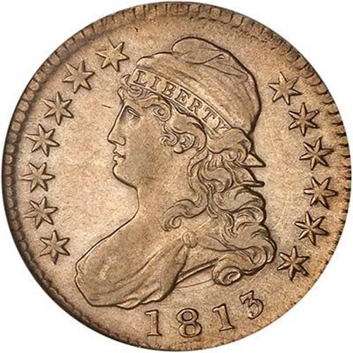1813 Capped Bust Half Dollar. Suggestions of luster around the stars and legends, with normal die clash found above the eagle. The left wing is typically weak on 1813 varieties, as seen here. (#6103)
