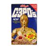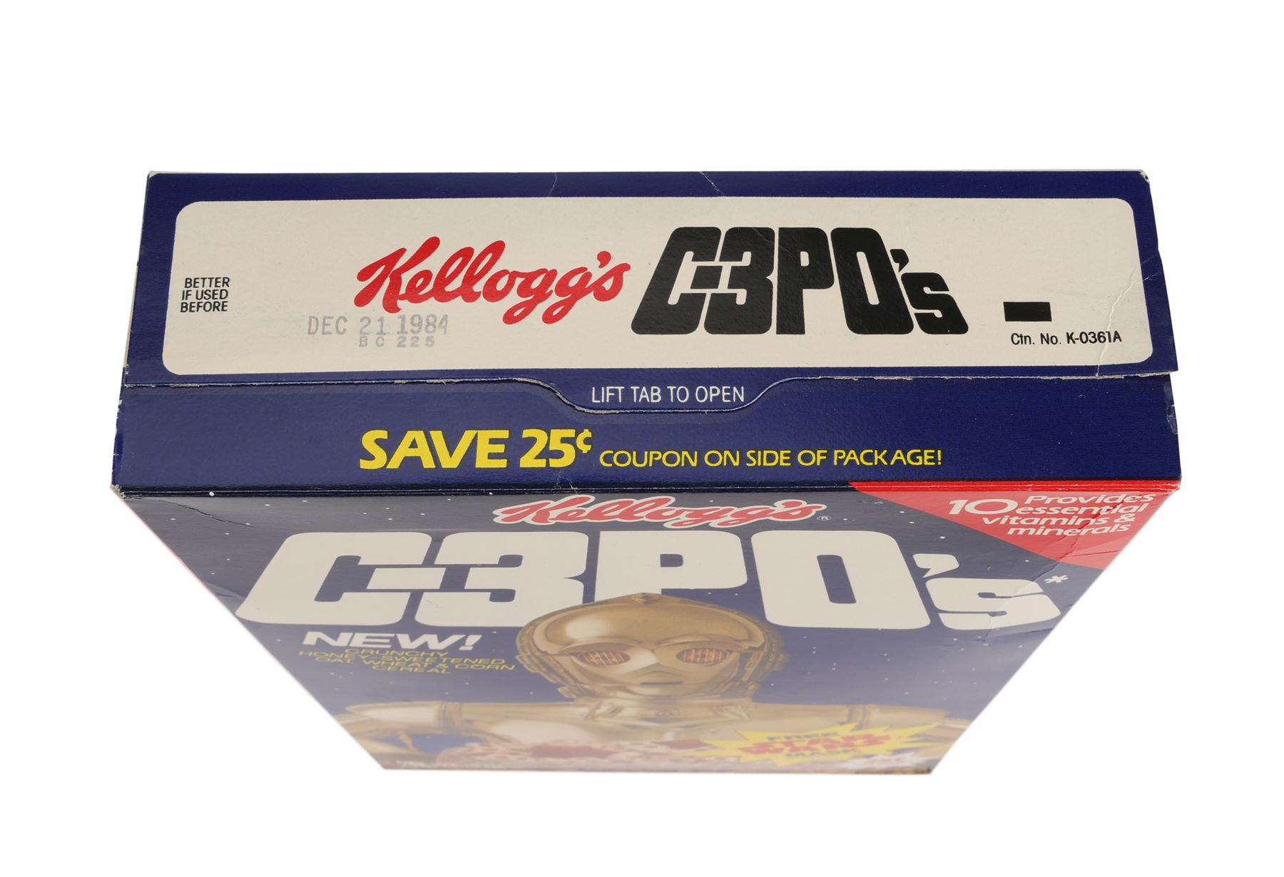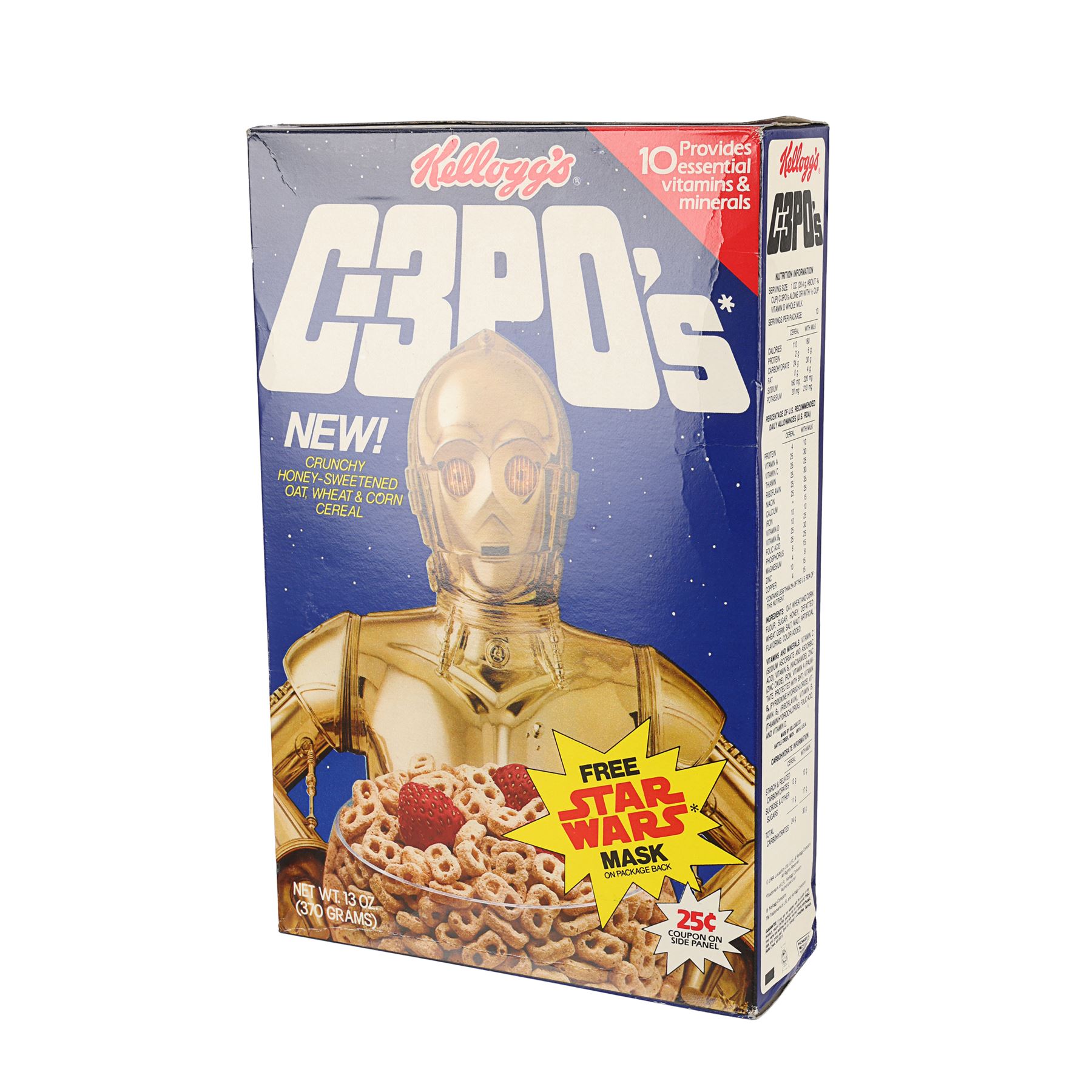 An unopened "C-3PO's" cereal box from the promotion of Richard Marquand's Star Wars: Return of the Jedi. Produced by Kellogg's in 1984 alongside a series of live-action commercials, this Star Wars-themed cereal originally consisted of unsweetened O-shaped pieces. However, it was reworked with a sweetened recipe, the shape changed and parts of the commercials reshot. The final "C-3PO's" were honey-sweetened, double-O shaped cereal pieces, which Anthony Daniels referred to as "C-3P8's", due to the fact that they now resembled small figures of eight.