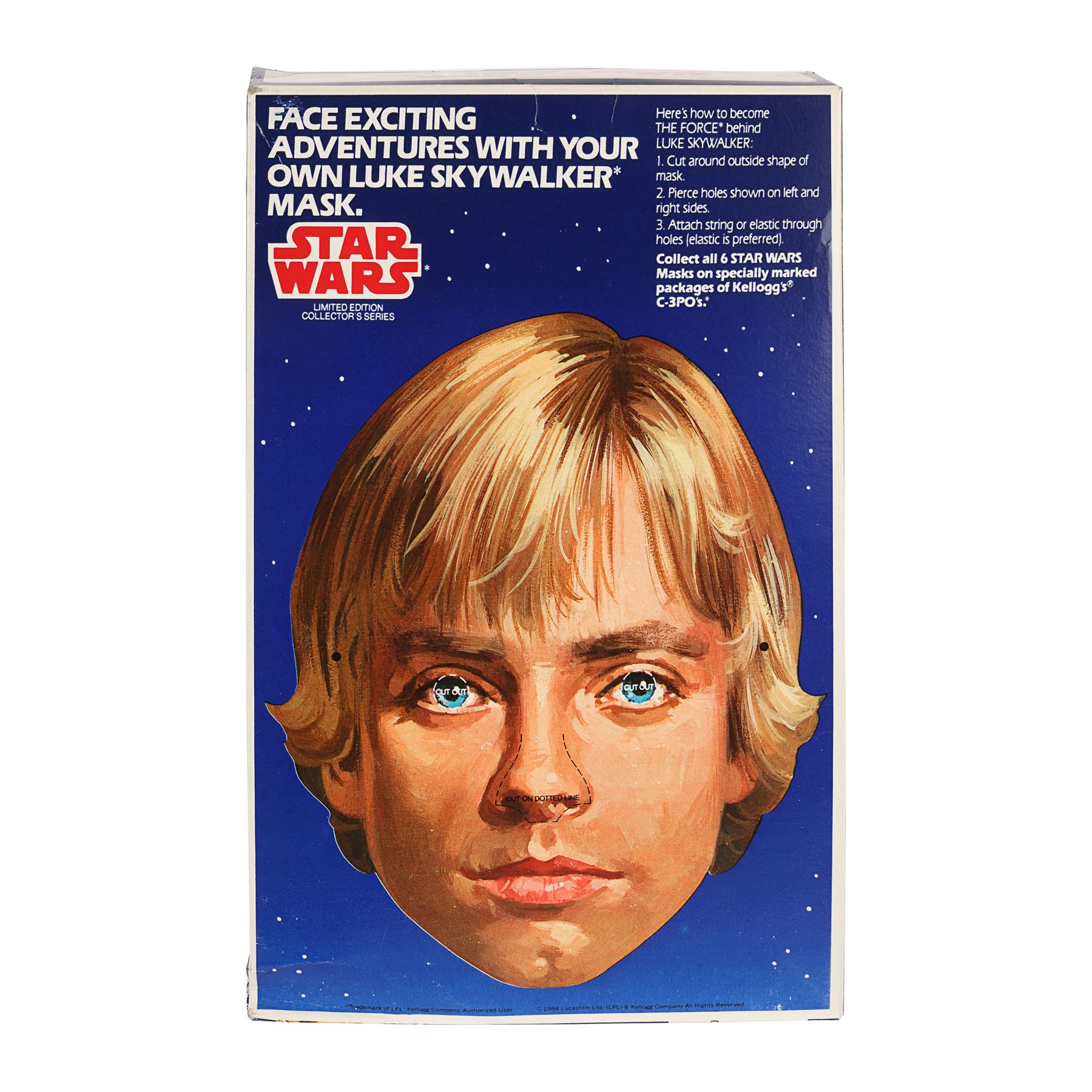 This cardboard cereal box features C-3PO (Daniels) on the front holding a bowl of "C-3PO's" and strawberries, and a cut-out mask of Luke Skywalker (Mark Hamill) on the back. It remains unopened, with a "Better if used Before" date of "DEC 21 1984" and exhibits minor creases from handling and age. Dimensions: 29.5 cm x 19 cm x 6.5 cm (11 3/4" x 7 1/2" x 2 1/2")