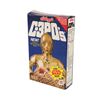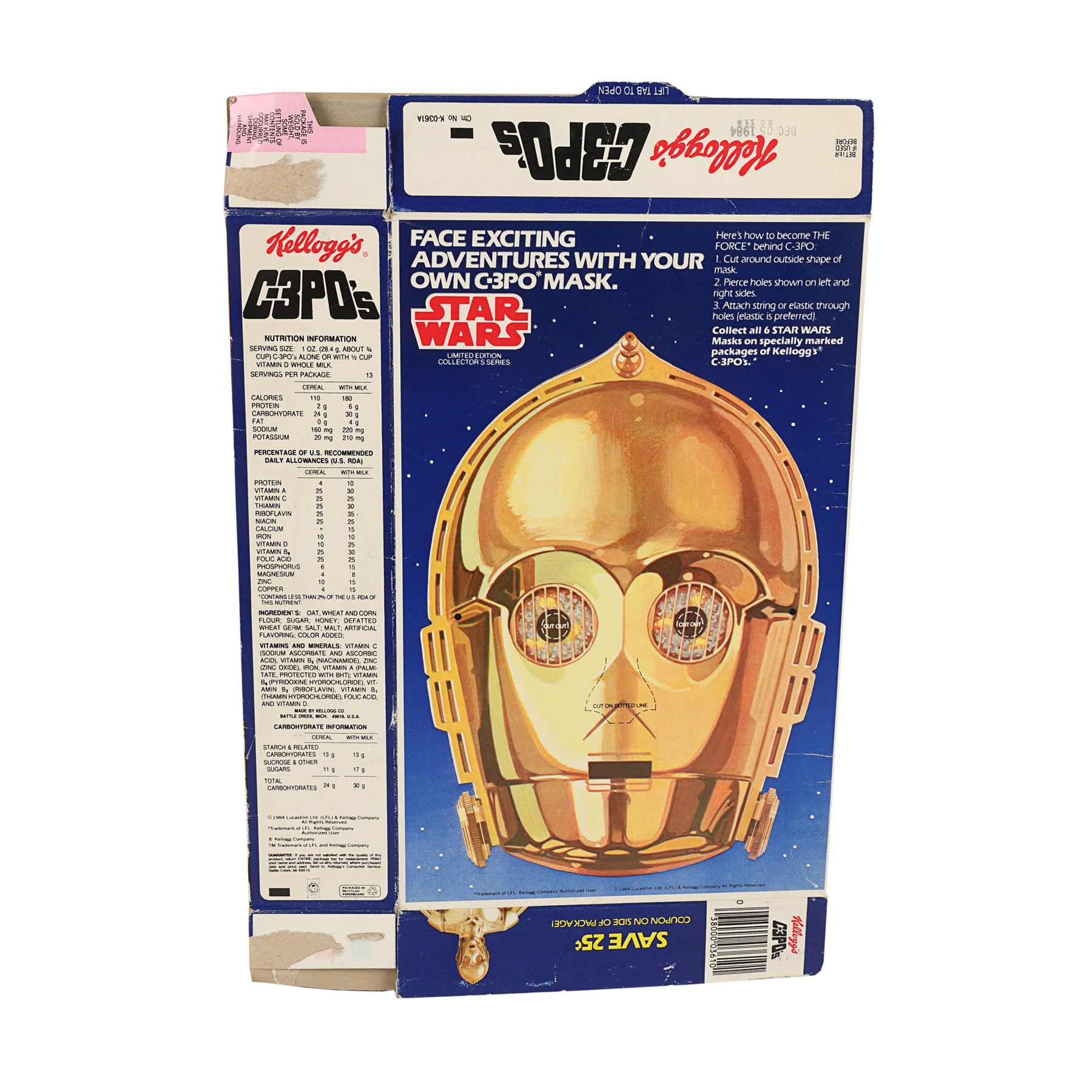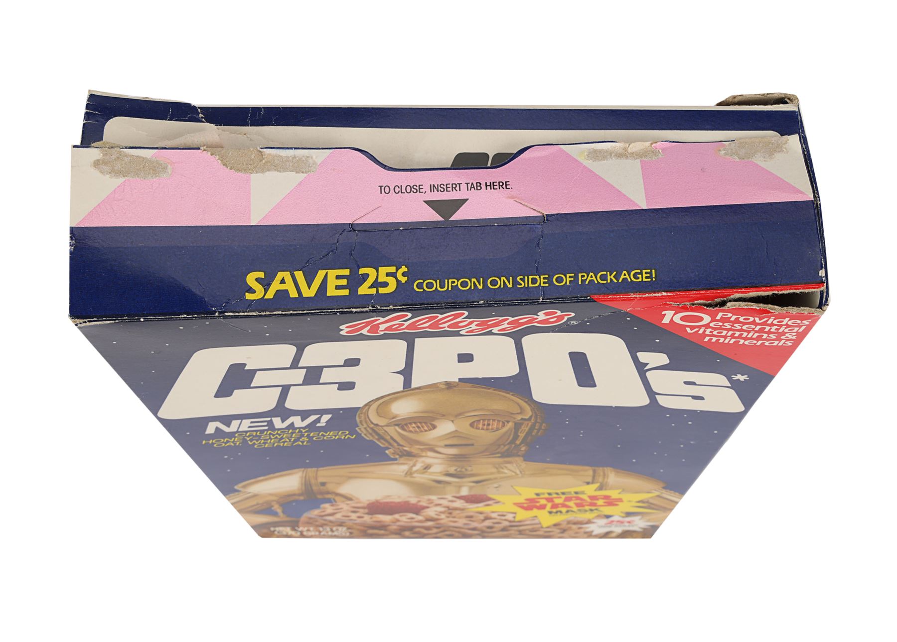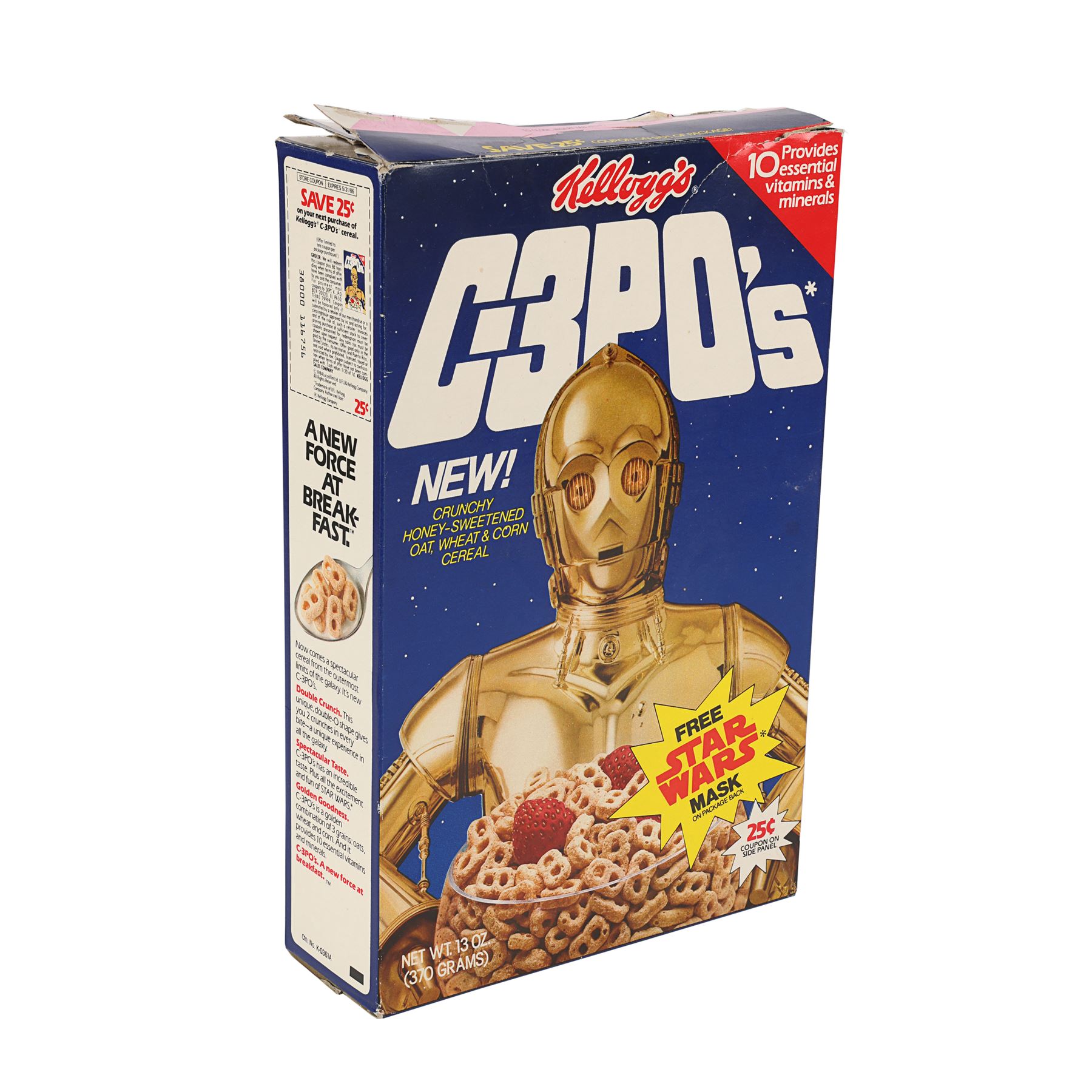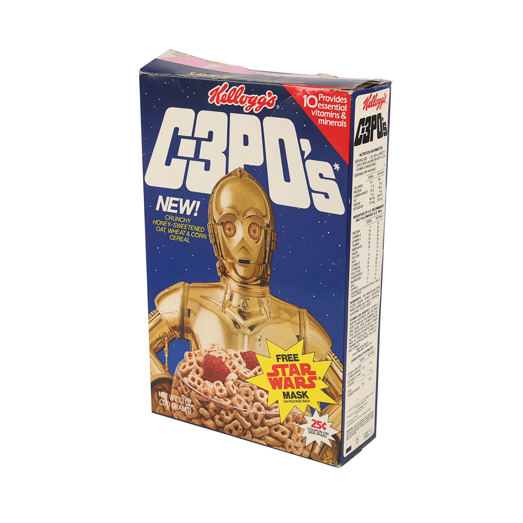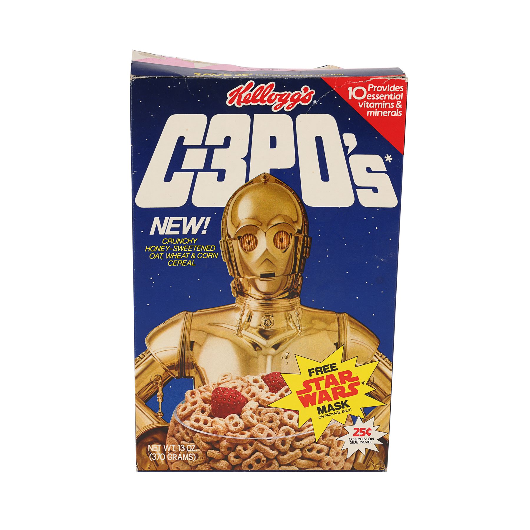 An opened "C-3PO's" cereal box and a flattened cereal box from the promotion of Richard Marquand's Star Wars: Return of the Jedi. Produced by Kellogg's in 1984 alongside a series of live-action commercials, "C-3PO's" were honey-sweetened double-O-shaped cereal pieces, which Anthony Daniels referred to as "C-3P8's", due to their figure-of-eight shape.