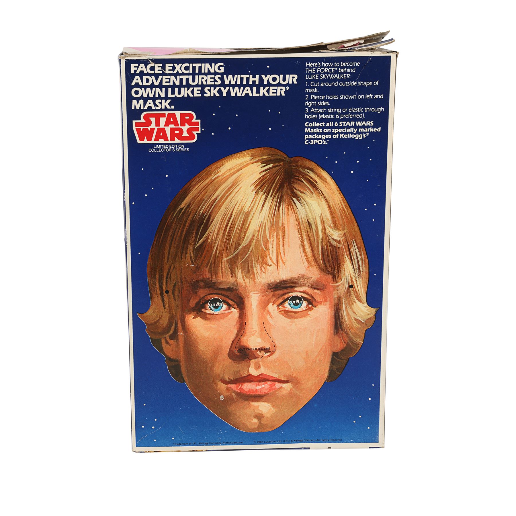 The opened cardboard cereal box includes a cut-out mask of Luke Skywalker (Mark Hamill) on its back, while the flattened version features a cut-out mask of C-3PO (Daniels). Both boxes exhibit crease lines and tears from opening and use. Dimensions (opened): 29.5 cm x 19 cm x 6.5 cm (11 3/4" x 7 1/2" x 2 1/2") (flattened): 38 cm x 25.5 cm (15" x 10")