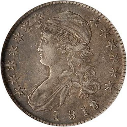 1818 Capped Bust Half Dollar. 8 over 7. Small 8. Dark russet gray patina on this clear overdate (Overton-102A variety, a later state of the dies). With smooth surfaces, minimal marks, and no signs of cleaning, it can be bought by j ust about anyone. (#6114)