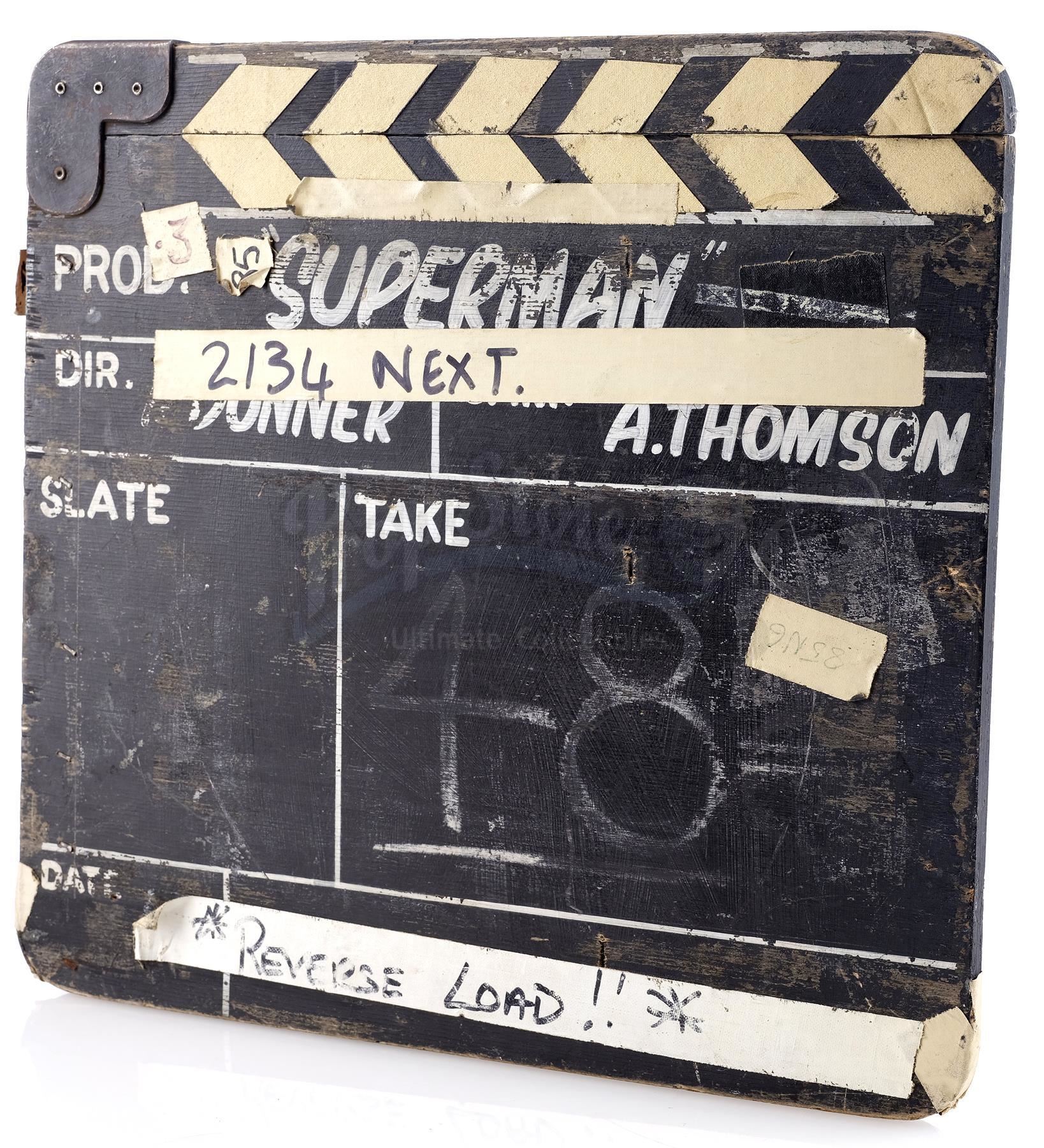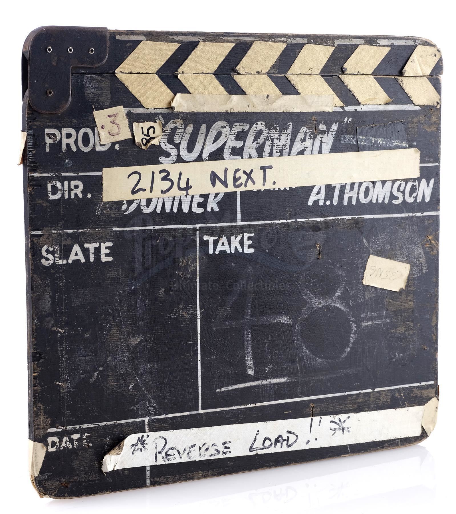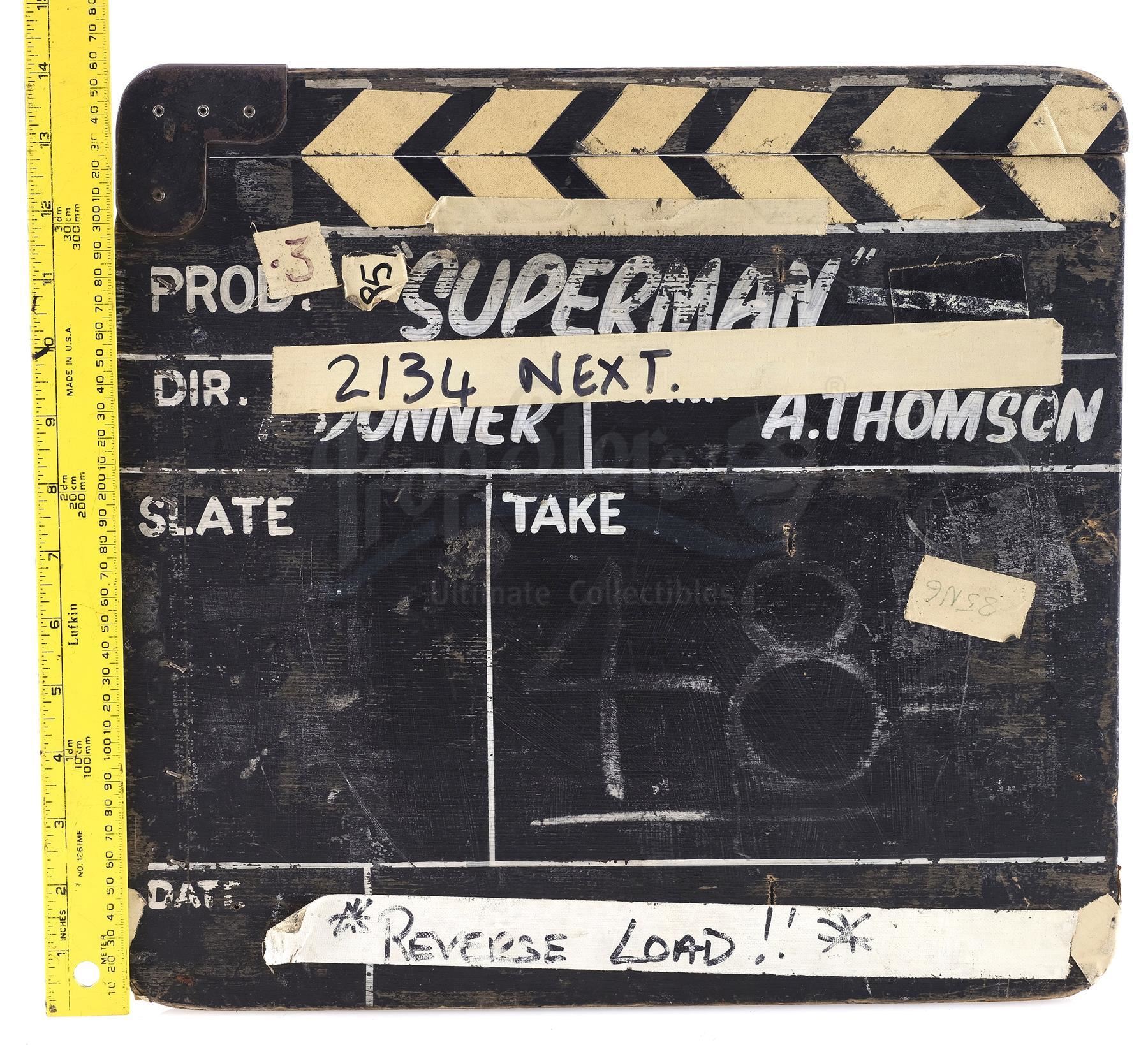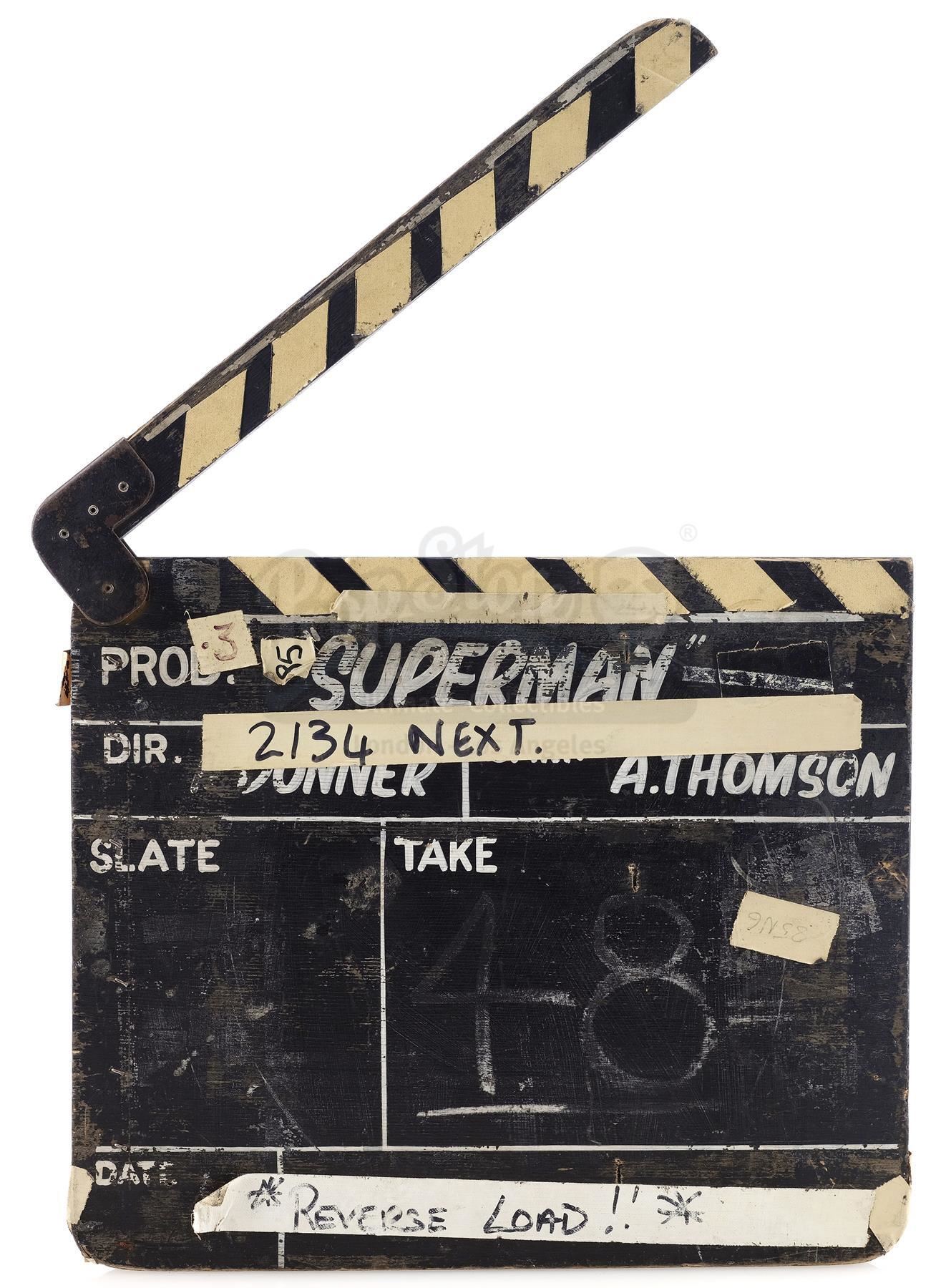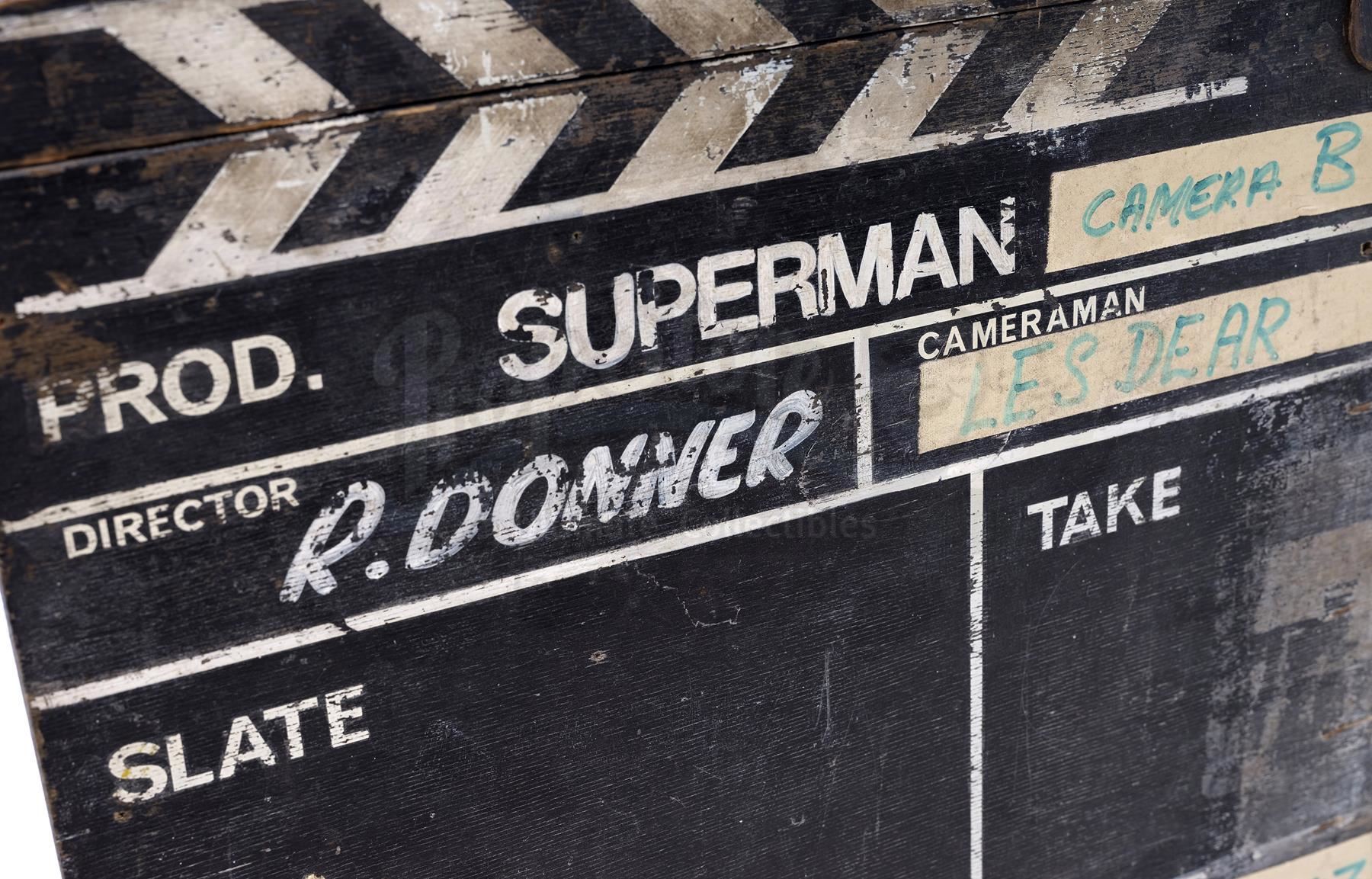 A production-used clapperboard from Richard Donner's 1978 comic-book adventure Superman. The clapperboard's production title is listed as "SUPERMAN" with "R. Donner" as the director and "A. Thomson" as the cameraman.