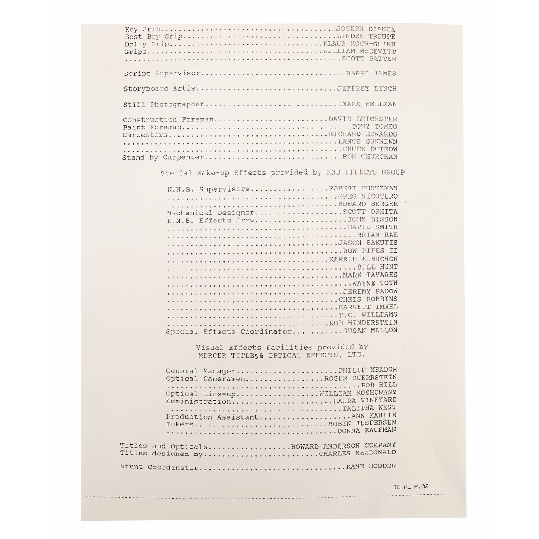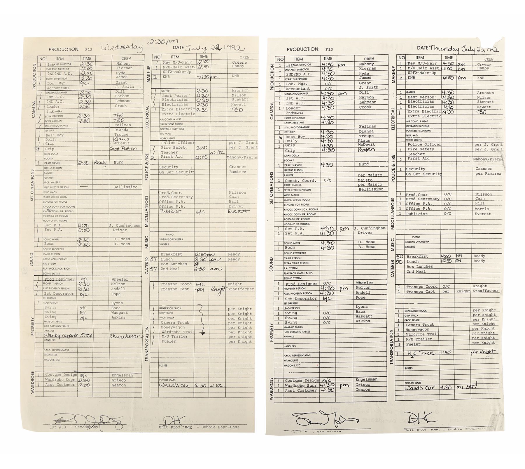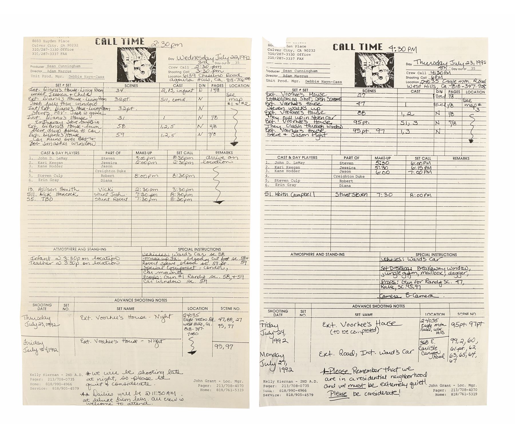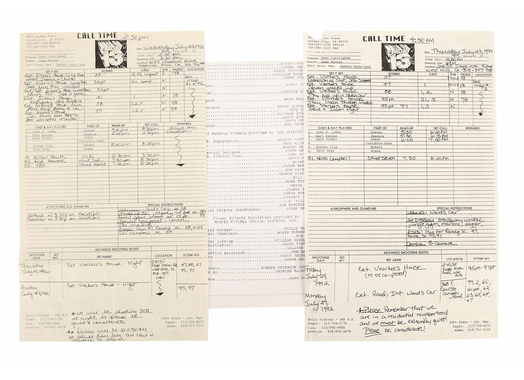 JASON GOES TO HELL: THE FINAL FRIDAY (1993) - Mario Kirner Collection: Handwritten and Printed Call Sheets - A pair of call sheets from the production of Adam Marcus' slasher sequel Jason Goes to Hell: The Final Friday. This pair includes a handwritten "master" call sheet dated "Wednesday July 22, 1992" and a printed copy dated "Thursday July 23, 1992". The master copy would have been photocopied and distributed to the crew and actors. Both call sheets feature the original Friday the 13th film logo, in honour of the film's producer Sean Cunningham. Also in the lot is a printed page featuring a partial crew list, including Kane Hodder as the stunt coordinator. Dimensions: 10.5" x 6.75" (27 cm x 21.5 cm)