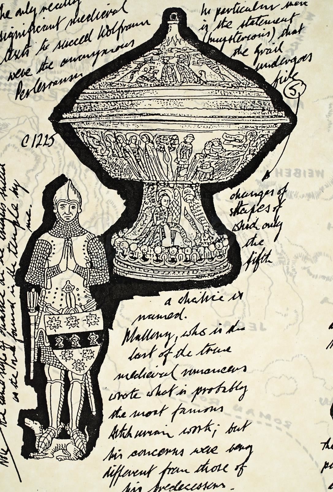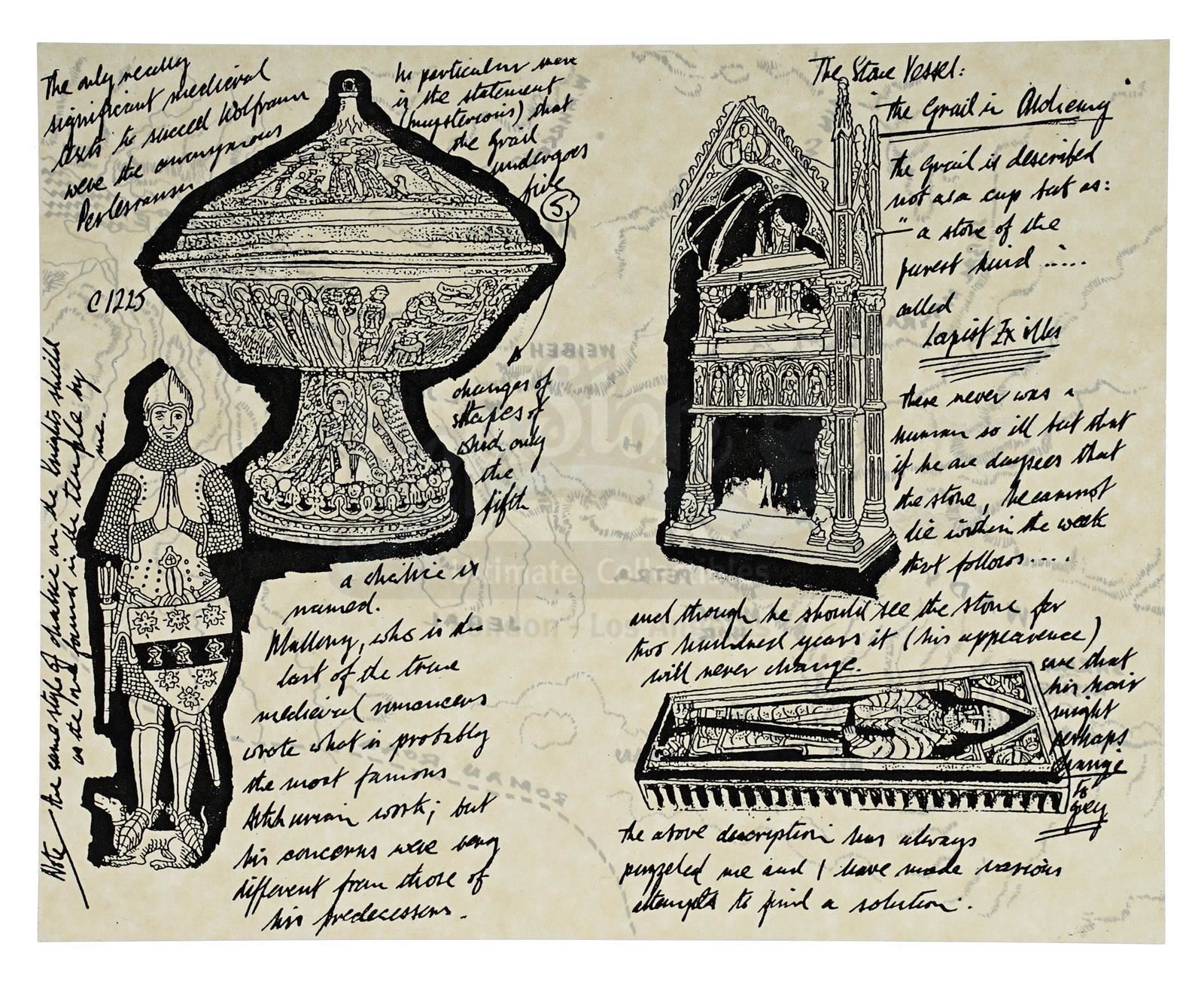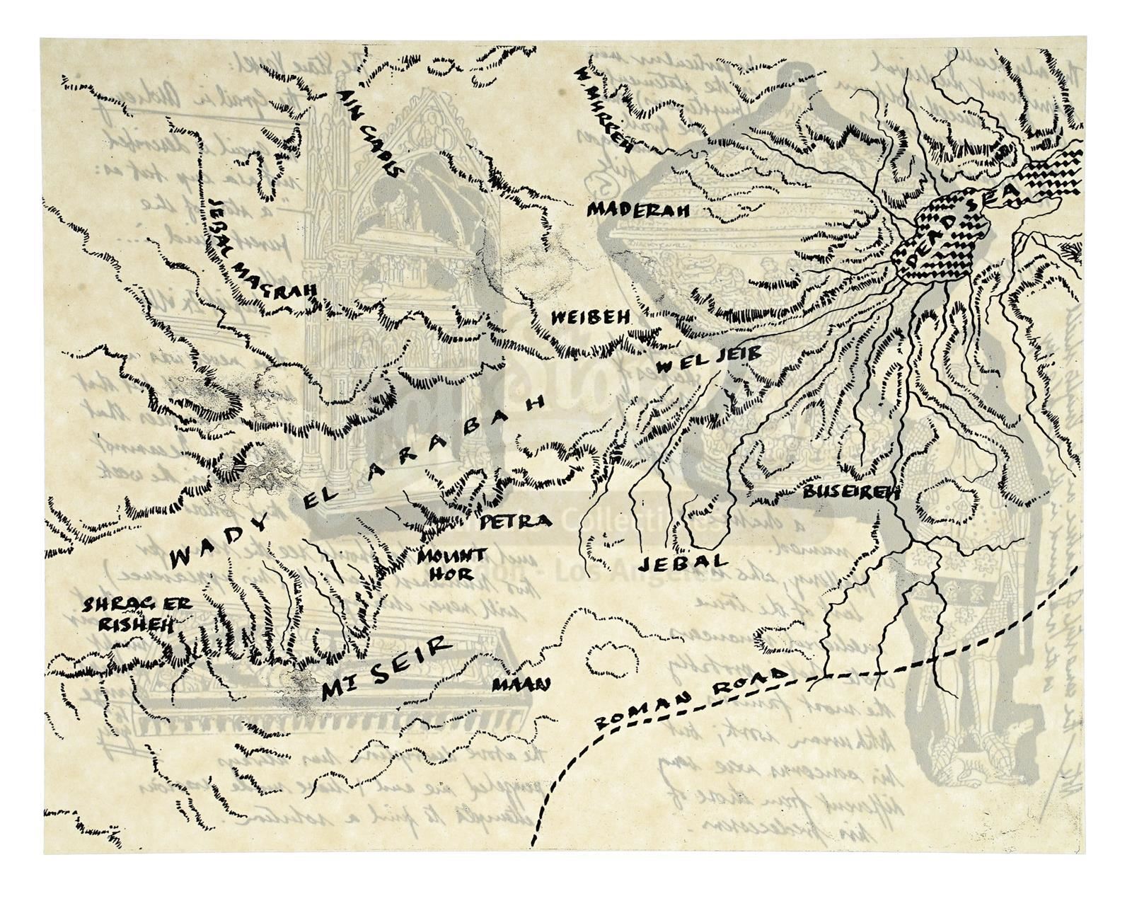This lot will be auctioned on Wednesday, June 30th. The auction will begin at 9:00am PDT and lots are sold sequentially via live auctioneer; tune in to the live streaming broadcast on auction day to follow the pace. Note other lots in the auction may close on June 29th or July 1st. A production-made "Knight's Catacombs" Grail diary page from Steven Spielberg's action adventure sequel Indiana Jones and the Last Crusade. Indiana Jones (Harrison Ford) used his father's (Sean Connery) diary to find his father and eventually the Holy Grail itself. This production-made copy of a hand-drawn page of drawings of a Grail knight's catacombs, a lavishly decorated chalice, and a map of the "Wady El Arabah" region on the other side is printed in black ink on cream-color paper. It is in excellent overall condition with minimal wear from age. Dimensions: 6" x 8" (15.25 cm x 20.5 cm) Estimate: $1,500 - 2,500
