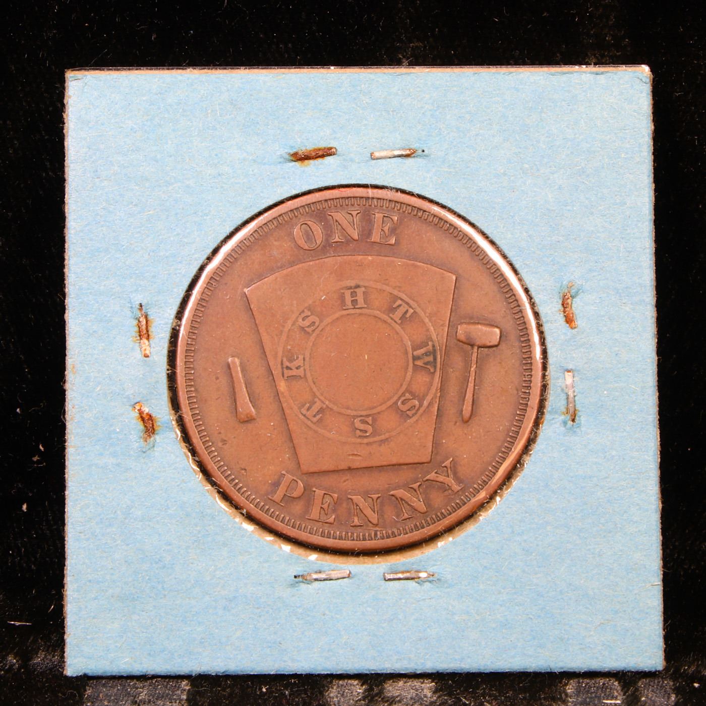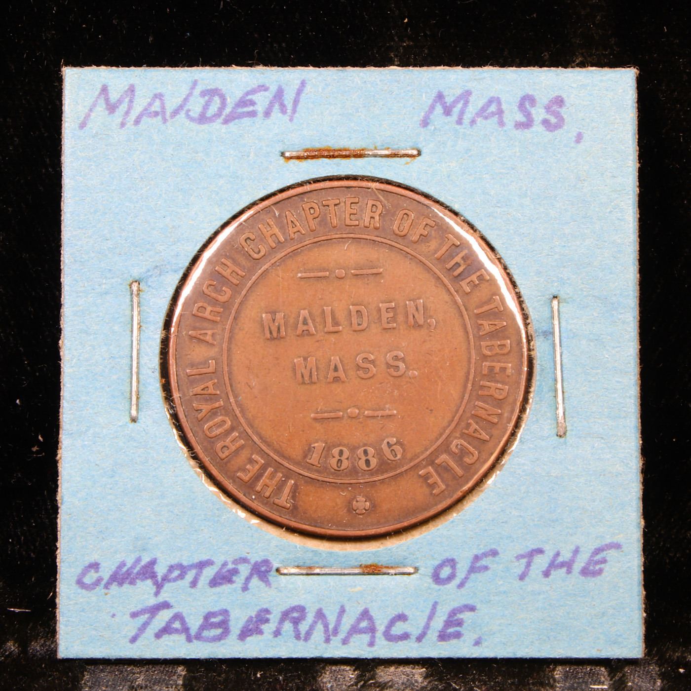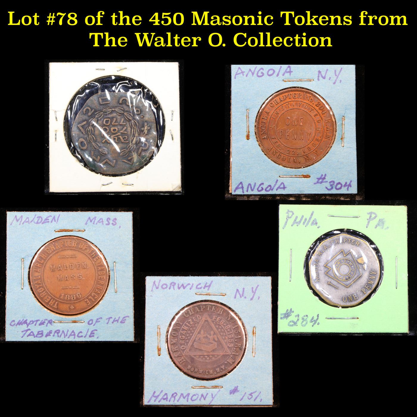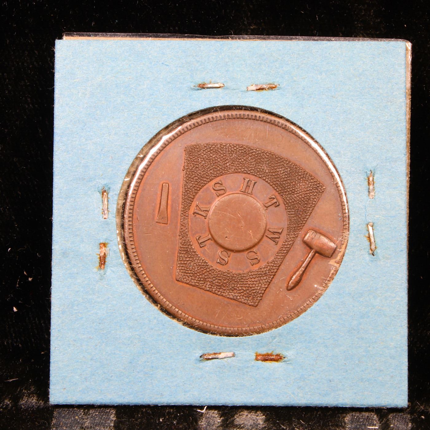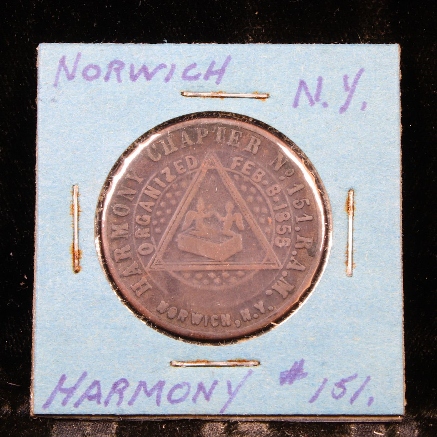 Lot #78 of the 450 Masonic Tokens from The Walter O. Collection. We Recently received a very Large Collection of 450 Masonic Tokens and coins. This collection was one man’s hobby for over 40 years. He collected each and every one with care and attention to detail and variety. Some of them are amazing and incredibly rare and highly sought by collectors and Masons. Here is a Brief Overview : Masonic coins often raise many questions for those looking to better understand the significance of the coins themselves as well as the symbolism represented in their imagery. In fraternal culture as a whole, symbolism has always been a significant part of these organizations’ identity, especially in Freemasonry, as Masonic coins are rich with symbolism, reflecting different events and characteristics of Freemasonry that give them the priceless value they hold. There are several varieties of masonic coins and tokens, and all tokens will fall into one of the following categories: a token celebrating a particular mason, lodge or event; an initiation token showing when a Brother was initiated, passed and raised; and finally the mark mason token (or penny) which signifies a pivotal part of a Mason’s initiation. Because symbolism was so important to fraternal culture, these small coins are rife with meaning. The most ubiquitous representation of the Masons was the letter "G" surrounded by a compass and square, representing the holy geometry of God. Some tokens feature the letters "H.T.W.S.S.T.K.S.," which means "Hiram the Widow's Son Sent to King Solomon," the biblical story that must be acted out to reach the third, or Master's Degree, in Freemasonry. Additionally, many contain either Apron and gloves: These symbols stand for living with a pure heart and to keep one’s hands clean. All-seeing eye: This symbol is designed to remind Masons that God and others always see their thoughts and actions. Ashlars: You may see rough and smooth ashlars on Masonic coins. They are to remind Masons of the contrast between man’s natural state and perfection and the Level: This symbol found on some Masonic coins reminds Masons that everyone is equal before God. We have broken the set up into groups of 5 Tokens in each lot. We have put 5 Lots per night over the 18 Nights of the Spring Auctions.