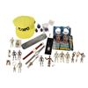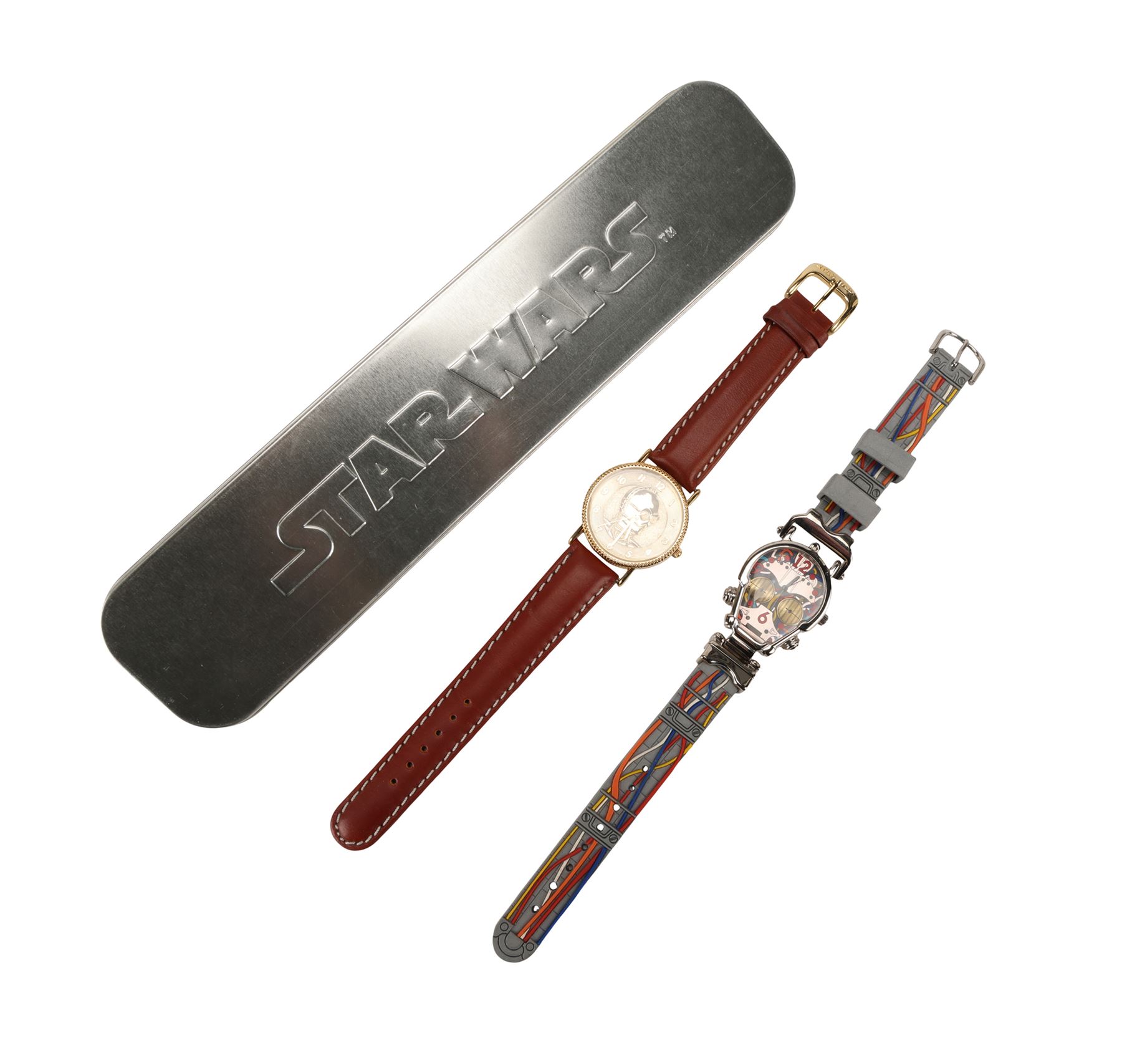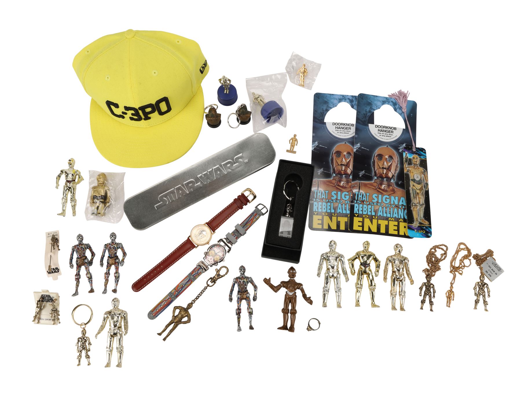 A collection of assorted C-3PO (Anthony Daniels) merchandise and toys from across George Lucas's Star Wars franchise. Included in this lot is a 1995 gold tone watch, presented in its original aluminium tin and featuring a Bas relief C-3PO's head watch face and a brow leather strap; a 1999 C-3PO skeletal character watch; a yellow New Era 9Fifty cap; two 1996 doorknob hangers and bookmark; and a R2-D2 (Kenny Baker) laser etched crystal keyring. Also included is a collection of C-3PO figures and pins, including a 1990 dark bronze-coloured Disney figure, a 1999 skeletal figure, a 2004 Lego figure. Some of these figures are well worn as Daniels frequently wore them in his pocket at premieres and other events. Dimensions (watch tin): 25 cm x 5.5 cm x 2 cm (10" x 2 1/4" x 2 1/4") (doorknob hanger): 23.5 cm x 10 cm (9 1/4" x 4")