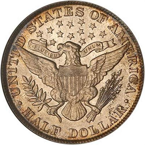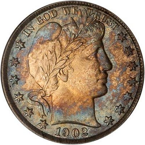 1902 Barber Half Dollar. Gorgeous sky blue and golden toning atop desirable satin which luster flows across the underlying silver surfaces. Razor-sharp on all devices, inclujding the key hair and leaf elements of Liberty. A single faint mark on the upper lip, plus a couple of others (equally slight) on the point of the neck. (#6492)