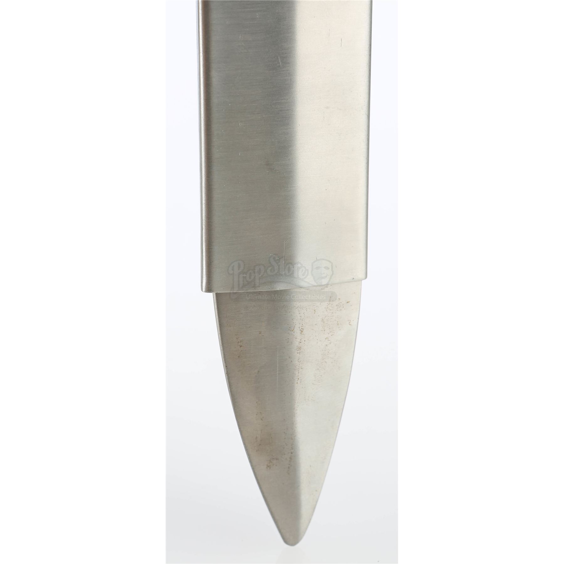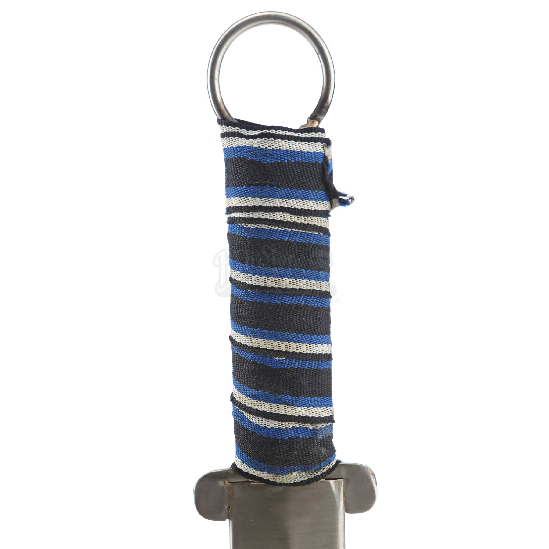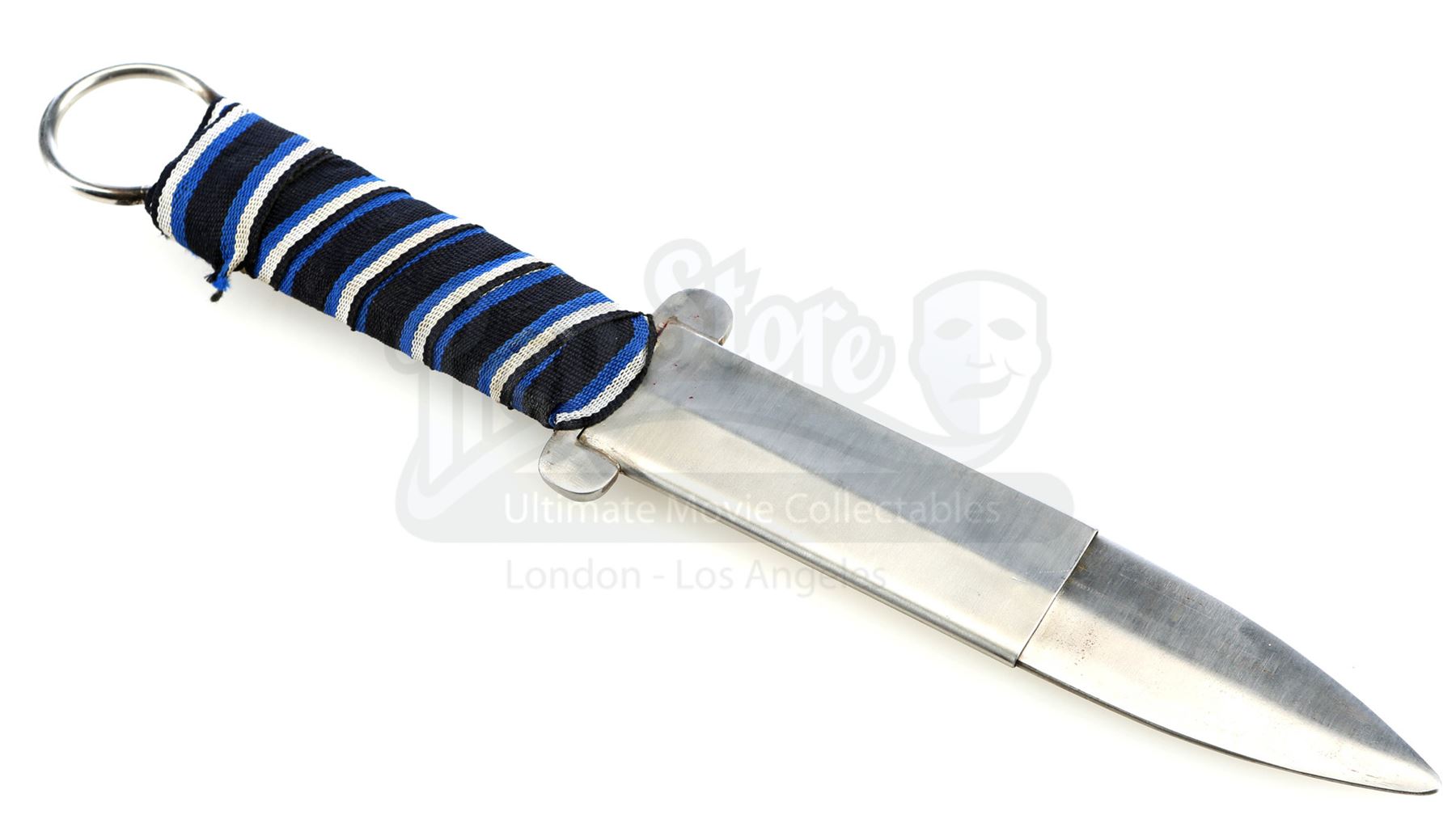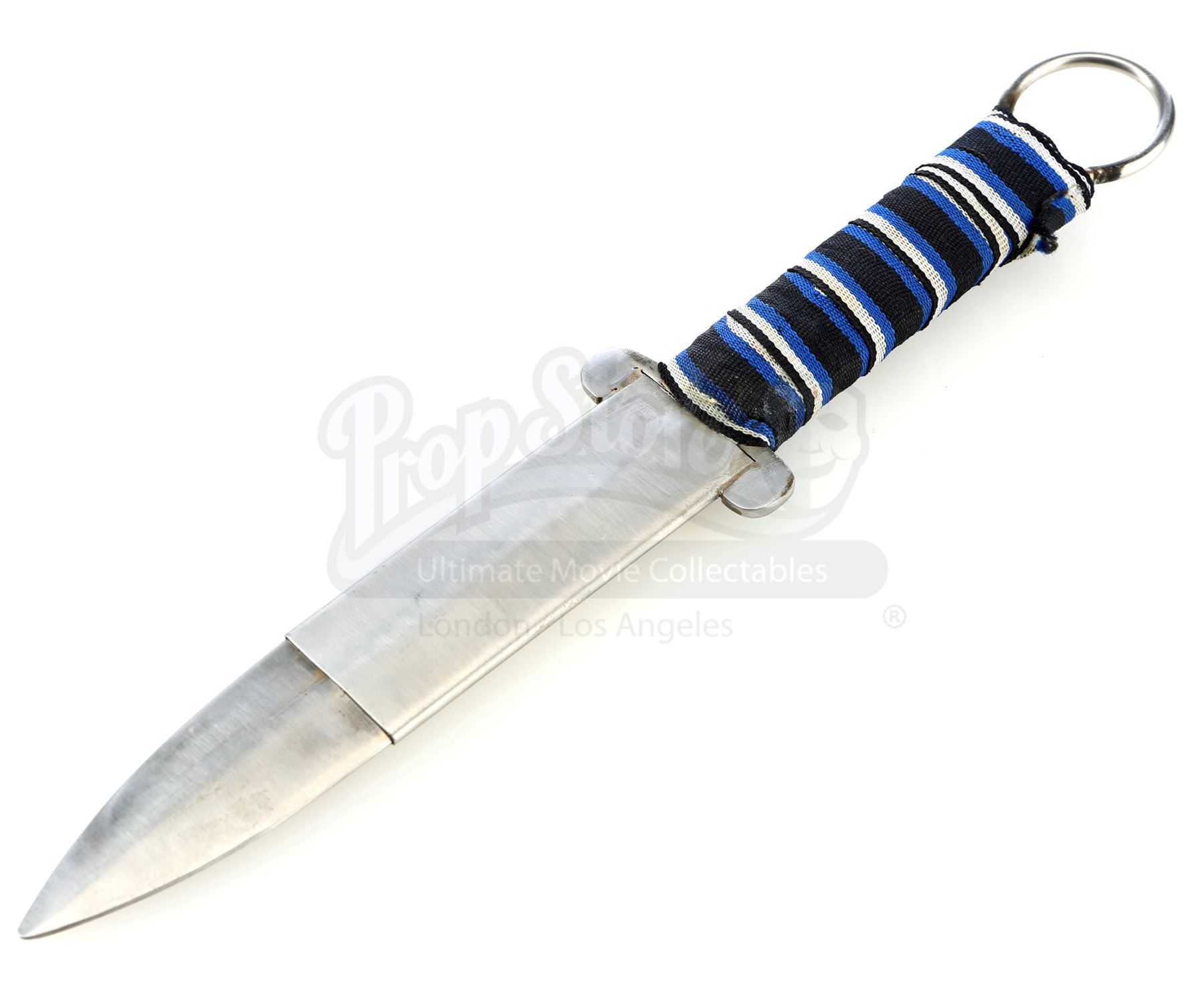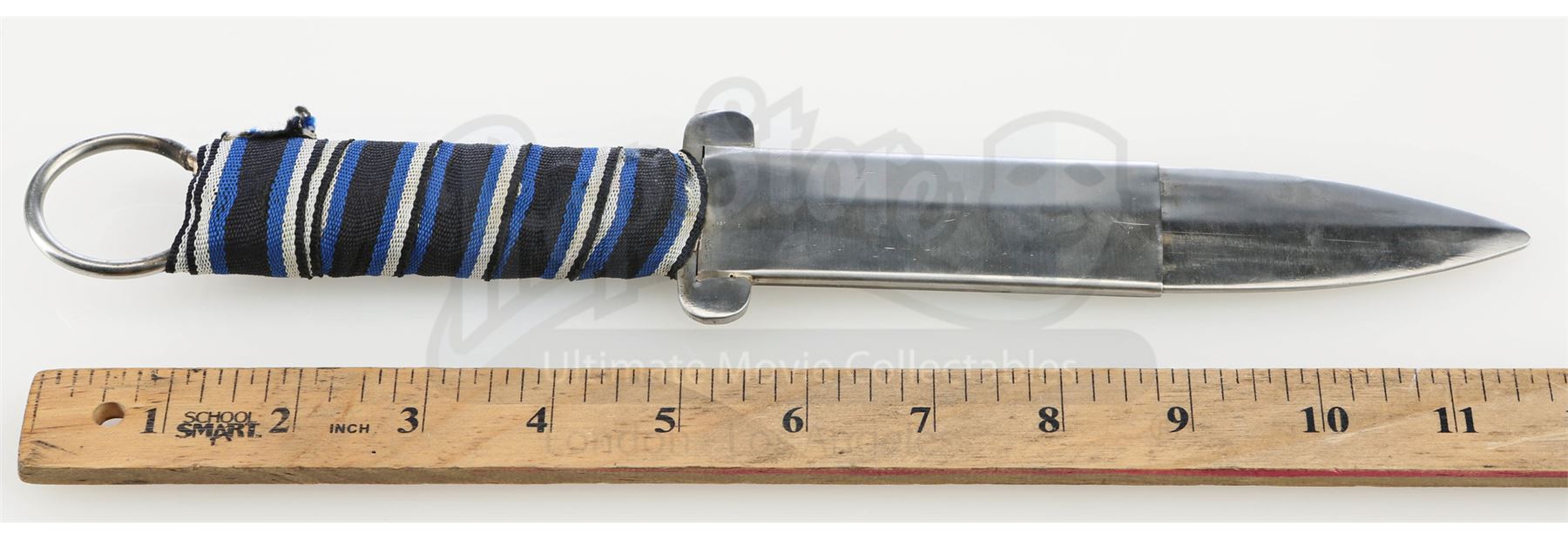 Davos’ retractable knife from the episode ‘Bar the Big Boss’ (112) of Marvel's Iron Fist. In the episode, Davos uses his knife to kill Bakuto. This lot consists of a metal stunt knife with a spring-loaded retractable blade and a black, white, and blue cotton handle. It is in good overall condition with minor wear from production.